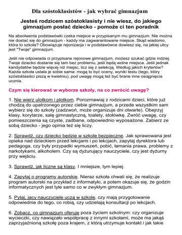 Dla szóstoklasistów - jak wybrać gimnazjum Jesteś rodzicem szóstoklasisty i nie wiesz, do jakiego gimnazjum posłać dziecko - pomoże ci ten poradnik Na absolwenta podstawówki czeka miejsce w przypisanym mu gimnazjum. Nie można nie dostać się do gimnazjum - każdy ma zagwarantowane miejsce. Skąd wiadomo, która to szkoła? Obowiązuje rejonizacja i w podstawówce dowiesz się, na jakiej ulicy jest "Twoje" gimnazjum. Jeśli nie odpowiada ci przypisane rejonowe gimnazjum, możesz szukać gdzie indziej. Twoje dziecko dostanie się tam bez problemu, jeśli będą wolne miejsca. Jeśli jednak kandydatów będzie więcej niż miejsc, licz się z selekcją. Według jakich kryteriów? Każda szkoła ustala je sobie sama: mogą to być oceny, wyniki testu (tego, który szóstoklasiści piszą w kwietniu), pod uwagę mogą też być brane inne osiągnięcia ucznia. Czym się kierować w wyborze szkoły, na co zwrócić uwagę? 1. Nie wierz ulotkom i plotkom. Porozmawiaj z rodzicami dzieci, które już chodzą do upatrzonego przez ciebie gimnazjum, a przede wszystkim sam wybierz się do szkoły (zadzwoń, może organizuje dni otwarte). Obejrzyj klasy, korytarze, salę gimnastyczną, toalety, stołówkę. Zwróć uwagę, czy pomieszczenia są czyste, zadbane, odpowiednio wyposażone. Zabierz ze sobą dziecko - jego opinia też się liczy. 2. Sprawdź, czy dziecko będzie w szkole bezpieczne. Jak sprawowana jest opieka nad dzieckiem przed lekcjami i po lekcjach, zapytaj dyrektora lub pedagoga, czy były przypadki wymuszeń, pobić, łamania prawa, problemy z narkotykami, alkoholem. Czy są dyżurujący nauczyciele, czy jest dyżurny przy wejściu. 3. Sprawdź, jak liczne są klasy. I mniejsze, tym lepiej. 4. Zapytaj o programy autorskie. Nieraz szkoła chwali się, że realizuje program autorski na przykład z informatyki, a potem okazuje się, że godzin informatycznych jest tyle samo co w zwykłym gimnazjum. 5. Pytaj, jacy nauczyciele uczą w szkole, czy mają przygotowanie odpowiednie do tego, co robią, czy udzielają konsultacji po lekcjach. 6. Zobacz, co gimnazjum oferuje poza życiem szkolnym: czy organizuje wycieczki, czy nawiązało współpracę z innymi szkołami, może ma jakąś zaprzyjaźnioną szkołę poza krajem, z którą utrzymuje kontakt i jak takie wymiany przebiegają, czy nasze dziecko ma szansę wyjechać choć na tydzień. 7. Sprawdź, jakich języków będzie mogło uczyć się twoje dziecko i na jakim poziomie. Jeżeli w szkole podstawowej uczyło się np. angielskiego, a prywatnie posyłałeś je jeszcze na niemiecki, to czy te języki będą kontynuowane? Zobacz, czy wszystkie klasy zaczynają naukę od zera, a może dokonywana jest jakaś selekcja i są tworzone grupy o różnym poziomie zaawansowania. 8. Czy pracownia informatyczna jest wykorzystywana tylko w czasie lekcji czy po lekcjach również? Ile godzin wypada na ucznia tygodniowo, czy jest dostępny internet? Jaki sprzęt znajduje się w pracowni? 9. Jakimi sukcesami sportowymi może się poszczycić szkoła, czy są zajęcia pozalekcyjne sportowe, możliwość uczęszczania na basen? 10. Czy szkoła ma pedagoga i psychologa, i inną opiekę, np. pielęgniarkę? 11. Dokładnie zapoznaj się z wewnątrzszkolnym systemem oceniania ucznia i szkolnym systemem wychowawczym, np. jakie przewidziano kary dla ucznia, jakie nagrody, w jakich sytuacjach można poprawiać ocenę niedostateczną. 12. Co po lekcjach? Jeżeli chcemy, by nasze dziecko zostało w szkole po południu, to czy istnieje taka możliwość? Jak jest z zajęciami specjalistycznymi pozalekcyjnymi: są kółka zainteresowań, odpłatne czy nie, w jakim wymiarze, kto może do nich uczęszczać? 13. Publiczne czy niepubliczne? Nie ma reguły. Ważne, aby spełniały powyższe wymagania. Edukacja naprawdę stała się inwestycją. Wybór następnego progu edukacyjnego po podstawówce dla rodziców i dziecka często jest problematyczny. Chcieliby szkołę, która znajdowałaby się blisko ich miejsca zamieszkania, oferowała wiele atrakcyjnych zajęć pozalekcyjnych i uczyła na poziomie, który umożliwiałby swobodne przejście do liceum. Opłaci się nieraz, aby dziecko przejechało dwa przystanki dalej tramwajem czy autobusem, aniżeli szło do byle jakiej szkoły tuż pod naszym blokiem. Szkoła ma być przyjazna i oferować solidny poziom nauczania. Reguły rządzące życiem szkoły powinny być jasne i zrozumiałe. Gdyby się okazało, że w trakcie nauki w wybranym gimnazjum nasze wyobrażenie nie odpowiada temu, co jest oferowane , nie bójmy się go zmienić.