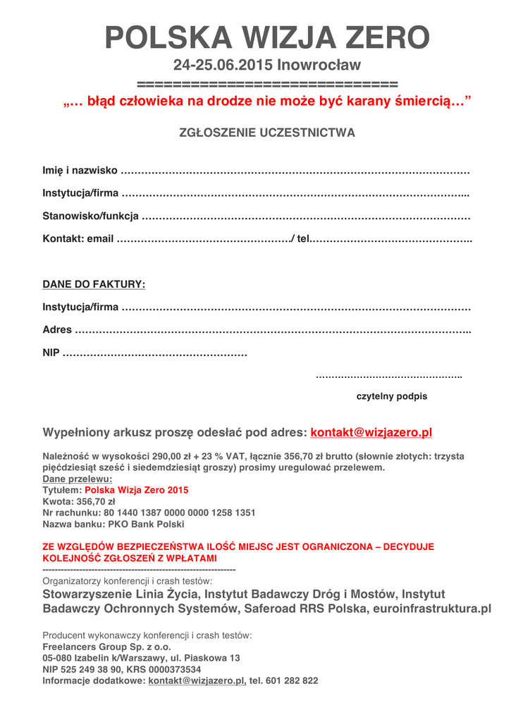 POLSKA WIZJA ZERO 24-25.06.2015 Inowrocław ============================= „… błąd człowieka na drodze nie może być karany śmiercią…” ZGŁOSZENIE UCZESTNICTWA Imię i nazwisko ………………………………………………………………………………………… Instytucja/firma ………………………………………………………………………………………... Stanowisko/funkcja …………………………………………………………………………………… Kontakt: email ……………………………………………/ tel.……………………………………….. DANE DO FAKTURY: Instytucja/firma ………………………………………………………………………………………… Adres …………………………………………………………………………………………………….. NIP ……………………………………………… ……………………………………….. czytelny podpis Wypełniony arkusz proszę odesłać pod adres: [email protected] Należność w wysokości 290,00 zł + 23 % VAT, łącznie 356,70 zł brutto (słownie złotych: trzysta pięćdziesiąt sześć i siedemdziesiąt groszy) prosimy uregulować przelewem. Dane przelewu: Tytułem: Polska Wizja Zero 2015 Kwota: 356,70 zł Nr rachunku: 80 1440 1387 0000 0000 1258 1351 Nazwa banku: PKO Bank Polski ZE WZGLĘDÓW BEZPIECZEŃSTWA ILOŚĆ MIEJSC JEST OGRANICZONA – DECYDUJE KOLEJNOŚĆ ZGŁOSZEŃ Z WPŁATAMI --------------------------------------------------------------Organizatorzy konferencji i crash testów: Stowarzyszenie Linia Życia, Instytut Badawczy Dróg i Mostów, Instytut Badawczy Ochronnych Systemów, Saferoad RRS Polska, euroinfrastruktura.pl Producent wykonawczy konferencji i crash testów: Freelancers Group Sp. z o.o. 05-080 Izabelin k/Warszawy, ul. Piaskowa 13 NIP 525 249 38 90, KRS 0000373534 Informacje dodatkowe: [email protected], tel. 601 282 822