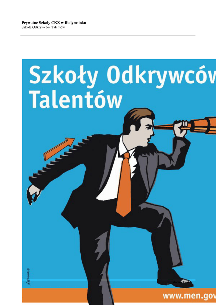 Prywatne Szkoły CKZ w Białymstoku Szkoła Odkrywców Talentów strona 1 / 4 Prywatne Szkoły CKZ w Białymstoku Szkoła Odkrywców Talentów Pierwszy Dzień Wiosny 2014 w Prywatnych Szkołach CKZ w Białymstoku okazją do odkrycia drzemiących w uczniach talentów Wiosna, która nadeszła 21 marca, powitała nas wszystkich piękną pogodą, która od rana wprawiła nie tylko uczniów, ale i pracowników szkoły w optymistyczny nastrój. Tego dnia społeczność zarówno Prywatnej Szkoły Podstawowej nr 6, jak i Prywatnego Gimnazjum nr 6 miała okazję uczestniczyć w rozmaitych formach gier oraz zabaw, mających na celu uświadomienie uczniom, że zdobywanie i poszerzanie już zdobytej wiedzy może być przyjemnością. Po raz kolejny potwierdziło się też przekonanie, że nauka poprzez zabawę w przyjaznej atmosferze jest tym, co uczniowie lubią najbardziej. Wybrani uczniowie klas 4-6 PSP oraz I-III PG próbowali swoich sił w „Wielkim dyktandzie”. Uczniowie PSP, z udziałem nauczycieli, wzięli udział w przeglądzie karaoke, natomiast gimnazjaliści uczestniczyli w quizie poświęconym muzyce filmowej, podczas którego rywalizowali z grupą pedagogów. Ponadto wszyscy uczniowie mieli okazję poszerzyć swoją wiedzę o sporcie poprzez uczestnictwo w quizie z wiedzy o sporcie. Poza tym uczniowie PSP przygotowali plakaty pod znamiennym tytułem „Jestem liczbą”, a 27 marca klasy: 2, 4 i 5-te udały się do Galerii Sleńdzińskich na lekcję muzealną „Warsztat malarza” i warsztaty plastyczne. Wszyscy zgodnie uznali, że tegoroczne zmagania, które zorganizowano dla uczczenia nadejścia długo oczekiwanej wiosny, były bardzo udane i już czekamy na te, które odbędą się za rok. strona 2 / 4 Prywatne Szkoły CKZ w Białymstoku Szkoła Odkrywców Talentów strona 3 / 4 Prywatne Szkoły CKZ w Białymstoku Szkoła Odkrywców Talentów Szkolny System Wspierania Zdolności i Talentów Uczniów w Prywatnym Gimnazjum nr 6 w Białymstoku Formatka Szkoły Odkrywców Talentów strona 4 / 4