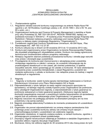 REGULAMIN KONKURSU RADIA NYSA FM „CENTRUM SZKOLENIOWE UNIVERSUM” 1. Postanowienia ogólne 1.1. Regulamin określa warunki konkursu rozgrywanego na antenie Radia Nysa FM zgodnie z art. 921Kodeksu Cywilnego ustawy z dn. 23.04.1964 r. (Dz.U.Nr 16, poz. 93 z późn. zm.) 1.2. Organizatorem konkursu jest Finance & Property Management z siedzibą w Nysie przy ulicy Podolskiej 22, NIP 753-100-25-67, REGON 160087592, będący na podstawie koncesji nr 504/2012 – R wydanej przez Przewodniczącego Krajowej rady Radiofonii i Telewizji nadawcą programu radiowego pod nazwą Radia Nysa FM (zwany w dalszej części niniejszego Regulaminu "Organizatorem"). 1.3. Fundatorem nagród jest Centrum Szkoleniowe Universum, 48-304 Nysa, Plac Staromiejski 9/2 , NIP 753 112 27 97 1.4. Konkurs odbywa się w dniach od 09 września 2013 do 13 września 2013 roku. 1.5. Konkurs jest organizowany przez Organizatora na terenie Rzeczpospolitej Polskiej dla obywateli posiadających obywatelstwo polskie. Konkurs ma zasięg ograniczony technicznymi możliwościami odbioru programu radiowego. 1.6. Niniejszy regulamin stanowi podstawę prowadzenia konkursu i określa jego warunki oraz prawa i obowiązki jego uczestników. 1.7. Przystąpienie do konkursu jest równoznaczne z akceptacją przez uczestnika niniejszego regulaminu w całości i oznacza, że uczestnik zobowiązuje się do przestrzegania określonych w nim zasad, jak również potwierdza, iż spełnia wszystkie warunki, które uprawniają go do udziału w konkursie. W razie stwierdzenia naruszenia przez uczestnika którejkolwiek z zasad Regulaminu uczestnik ten zostanie wykluczony z udziału w konkursie i nie nabędzie prawa do żadnej z nagród określonych w regulaminie. 2. Nagrody 2.1. Nagrody w konkursie: sześć kursów języka niemieckiego realizowane w Centrum Szkoleniowym Universum przy Placu Staromiejskim 9/2 w Nysie. 2.2. Odpowiedzialność z tytułu rękojmi za wady nagród rzeczowych spoczywa na sprzedawcy, od którego nagrody zostały kupione przez Organizatora lub podmiocie, który udostępnił Organizatorowi nagrody, a odpowiedzialność z tytułu gwarancji na podmiocie wskazanym w treści gwarancji (gwarant). Zdobywca nagrody będzie dochodził zaspokojenia roszczeń z powyższych tytułów bezpośrednio od sprzedawcy nagród (lub od podmiotu wskazanego przez Organizatora) i od gwaranta. 2.3. Nagrody rzeczowe nie podlegają zamianie na ekwiwalent pieniężny ani na inne przedmioty o tej samej wartości. 2.4. Nagrody pozostają własnością Fundatora do momentu przekazania ich uczestnikom konkursu. 2.5. Organizator nie ponosi odpowiedzialności za zmianę miejsca zamieszkania i/lub podanego przez uczestnika konkursu adresu lub zmianę innych danych – uniemożliwiającą kontakt z uczestnikiem lub odebranie nagrody. 2.6. Organizator oświadcza, iż nagrody zostaną wydane, w ramach konkursu, zgodnie z obowiązującymi przepisami prawa podatkowego. 2.7. Zwycięzcy nagród narzeczowych odbierają je osobiście w siedzibie Organizatora. O sposobie odbioru nagrody decyduje Organizator. 2.8. Słuchacze, którzy nie odbiorą nagród do 30 września 2013 roku tracą prawo do tych nagród i ich odbioru. Nagrody te pozostają własnością Organizatora. 3. Zasady konkursu 3.1. Konkurs trwa od 03 września 2013 roku do 06 września 2013 roku . W tym czasie przyjmowane są zgłoszenia konkursowe. W tym czasie odbędzie się 1 edycja konkursu. Wejścia konkursowe z laureatami zostaną wyemitowane w blokach reklamowych Radia Nysa. 3.2. Zgłoszenie do każdej z edycji konkursu następuje w momencie wysłania smsa o treści NYSA.UNIVERSUM wraz z odpowiedzią na pytanie na numer 72601 (2,46 + VAT). Wysłanie smsa oznacza zgodę na uczestnictwo w konkursie i akceptację regulaminu. 3.3. Do każdej z edycji komisja konkursowa wybiera sms, który został wysłany na numer 72601, prezenter dzwoni do słuchacza. 3.4. Laureatem edycji konkursu zostaje osoba, która weźmie udział w wejściu na antenie. Każdy sms stanowi jedno zgłoszenie. Jedna osoba nie może otrzymać więcej niż jedno wejście na kurs pierwszej pomocy. 3.5. Do każdego wejścia finałowego uczestników konkursu wybiera komisja konkursowa, ustalana każdego dnia trwania konkursu. O Werdykt komisji konkursowej jest werdyktem ostatecznym w zakresie wyników konkursu. O Nad prawidłowością przebiegu akcji i pracy komisji konkursowej czuwają władze statutowe Organizatora. O Komisja konkursowa potwierdza zgodność przeprowadzenia konkursu z regulaminem. 3.6. Z osobami wybranymi przez komisję do danego wejścia finałowego kontaktuje się telefonicznie osoba prowadząca konkurs na antenie Radia Nysa FM. 3.7. Każdy z wybranych do wejścia finałowego uczestników zobowiązany jest przeprowadzić rozmowę telefoniczną. W przypadku rozłączenia w trakcie rozmowy przed wejściem na antenę Radia, próba ponownego połączenia podejmowana jest tylko raz. Jeżeli pomimo podjęcia prób połączenia, nie zostanie nawiązane połączenie z wybranym przez komisję uczestnikiem konkursu, wypowiedź tego uczestnika zostaje nagrana i wyemitowana w wybranej przez Organizatora porze. 3.8. Laureatem nagrody zostaje uczestnik antenowego wejścia finałowego, który wykonał rozmowę telefoniczną, o której mowa w pkt 3.3 i wziął udział w wejściu finałowym danej edycji wykonując zadanie z pkt. 3.4 (i kolejnych). 3.9. Organizator zastrzega, że uczestnik, który otrzyma nagrodę w jednej z edycji konkursu nie ma prawa ponownego udziału w konkursie ani prawa do kolejnej nagrody. 3.10.Zwycięzca zobowiązany jest do podania Organizatorowi swoich danych osobowych (m.in. imię, nazwisko, adres zameldowania/zamieszkania) koniecznych dla celów odebrania nagrody. 3.11. Zgłoszenie się w sposób opisany w pkt 3.1 i 3.2 niniejszego regulaminu do konkursu jest równoznaczne z wyrażeniem przez uczestnika zgody na emisję wejścia finałowego z jego udziałem na antenie Radia Nysa FM. 4.Zasady uczestnictwa w ko