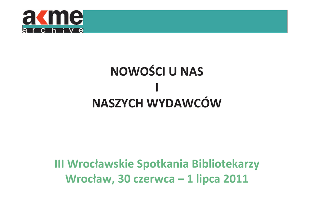 NOWOŚCI U NAS I NASZYCH WYDAWCÓW III Wrocławskie Spotkania Bibliotekarzy Wrocław, 30 czerwca – 1 lipca 2011 Reprezentujemy OECD iLIBRARY nowa platforma OECD Knovel – nowe kolekcje 2 dodatkowe kolekcje do końca 2011 Knovel – nowa platforma Knovel – nowa platforma CINDAS – zmiany w platformie NATIONAL TECHNICAL REPORTS LIBRARY Baza wydawana przez NTIS od 2009 roku 2,5 miliona indeksów i abstraktów raportów technicznych z projektów finansowanych przez administrację USA od 1800r do bieżących Raporty otrzymywane z innych krajów w ramach współpracy, np.: Japonia - Japan Ministry of International Trade and Industry (MITI); Wielka Brytania - laboratoria administrowane przez the United Kingdom Department of Industry; Niemcy - Federal Ministry of Research and Technology (BMFT); Francja - National Center for Scientific Research (CNRS) 600 000 + raportów pełnotekstowych Dysertacje Patenty NATIONAL TECHNICAL REPORTS LIBRARY TEMATYKA: Administration & Management Aeronautics & Aerodynamics Agriculture & Food Astronomy & Astrophysics Energy Atmospheric Sciences Behavior & Society Biomedical Technology & Human Factors Engineering Building Industry Technology Business & Economics Chemistry Civil Engineering Combustion, Engine & Propellant Communications Computers, Control & Info Theory Detection & Countermeasures Electrotechnology Energy Environmental Pollution & Control Government Inventions for Licensing Health Care Industrial & Mechanical Engineering Library & Information Sciences Manufacturing Technology Materials Sciences Mathematical Sciences Medicine & Biology Military Sciences Missile Technology Natural Resources Navigation Nuclear Science Ocean Sciences Ordnance Photography Physics Problem Solving Information Space Technology Transportation Urban & Regional Tech. Development NATIONAL TECHNICAL REPORTS LIBRARY ASTM AMERICAN SOCIETY FOR TESTING AND MATERIALS Założona w 1898r Jedna z największych organizacji opracowujących normy Wydaje normy, specyfikacje, metody testów, książki, czasopisma, etc Wykorzystanie norm ASTM nie jest obowiązkowe, ale większość z nich jest cytowana w normach opracowywanych przez prawie wszystkie urzędy normalizacyjne na świecie ASTM 41 000 norm 114 woluminów podręczników i monografii (od 1965r) 29 000 Selected Technical Papers—STP– (od 1931r) 6 czasopism Zasoby sięgają roku 1921 CZASOPISMA: Journal of ASTM International (JAI) Geotechnical Testing Journal (GTJ) Journal of Testing and Evaluation (JTE) NORMY: 12 000+ aktywnych 12 300 Redlines 28 500 norm historycznych 1 000 norm wycofanych Journal of Cement, Concrete and Aggregates (CCA) Journal of Composites Technology and Research (JCTR) Journal of Forensic Sciences (JOFS) KSIĄŻKI: 1 517 woluminów z publikacjami naukowymi z sympozjów ASTM (wszystkie recenzowane) 114 woluminów — podręczniki, monografie ASTM TEMATYKA: · Aerospace engineering · Biomedical engineering · Chemical engineering · Civil engineering · Environmental engineering · Geological engineering · Health & Safety engineering · Industrial engineering · · Materials science and Engineering · Mechanical engineering · Nuclear, solar and geothermal engineering · Petroleum engineering · Soil science · Geosynthetics ASTM PORÓWNANIE Z IEL i ASME DAWSONERA •Platforma e-książek DAWSON BOOKS stworzona w 2007r •Firma działająca od ponad 200 lat •Renomowany dostawca książek i usług informacyjnych dla ośrodków akademickich i badawczych •Ponad 170 000 tytułów •Ponad 400 wydawców DAWSONERA •Zakup indywidualnych tytułów •Wypożyczanie indywidualnych tytułów, które nie zostały zakupione •Nieodpłatne przeglądanie przez 5 minut każdej książki z katalogu dawsonera •Nieograniczona ilość jednoczesnych użytkowników •Indywidualna rejestracja użytkowników •325-400 punktów kredytowych dla każdego tytułu w każdym roku •1 punkt = skorzystanie z e-książki przez jednego zarejestrowanego użytkowników w ciągu 24 godzin www.akmearchive.pl kontakt@ akmearchive.pl DZIĘKUJĘ