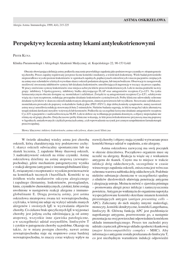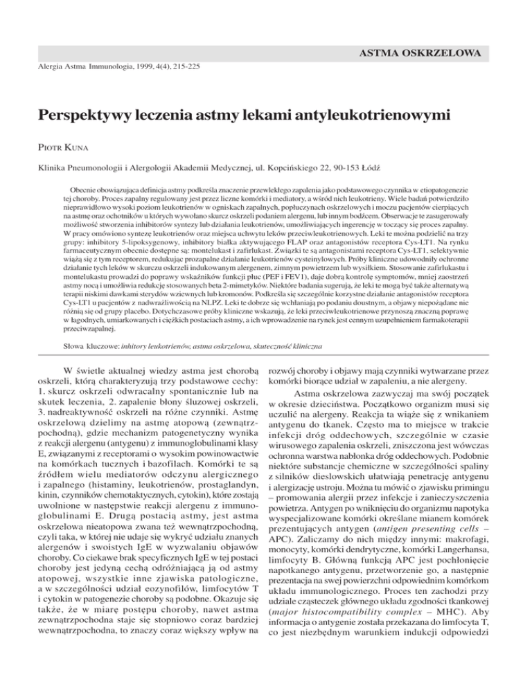 215 ASTMA OSKRZELOWA Alergia Astma Immunologia, 1999, 4(4), 215-225 Perspektywy leczenia astmy lekami antyleukotrienowymi PIOTR KUNA Klinika Pneumonologii i Alergologii Akademii Medycznej, ul. Kopciñskiego 22, 90-153 £ód Obecnie obowi¹zuj¹ca definicja astmy podkrela znaczenie przewlek³ego zapalenia jako podstawowego czynnika w etiopatogenezie tej choroby. Proces zapalny regulowany jest przez liczne komórki i mediatory, a wród nich leukotrieny. Wiele badañ potwierdzi³o nieprawid³owo wysoki poziom leukotrienów w ogniskach zapalnych, pop³uczynach oskrzelowych i moczu pacjentów cierpi¹cych na astmê oraz ochotników u których wywo³ano skurcz oskrzeli podaniem alergenu, lub innym bodcem. Obserwacje te zasugerowa³y mo¿liwoæ stworzenia inhibitorów syntezy lub dzia³ania leukotrienów, umo¿liwiaj¹cych ingerencjê w tocz¹cy siê proces zapalny. W pracy omówiono syntezê leukotrienów oraz miejsca uchwytu leków przeciwleukotrienowych. Leki te mo¿na podzieliæ na trzy grupy: inhibitory 5-lipoksygenowy, inhibitory bia³ka aktywuj¹cego FLAP oraz antagonistów receptora Cys-LT1. Na rynku farmaceutycznym obecnie dostêpne s¹: montelukast i zafirlukast. Zwi¹zki te s¹ antagonistami receptora Cys-LT1, selektywnie wi¹¿¹ siê z tym receptorem, redukuj¹c prozapalne dzia³anie leukotrienów cysteinylowych. Próby kliniczne udowodni³y ochronne dzia³anie tych leków w skurczu oskrzeli indukowanym alergenem, zimnym powietrzem lub wysi³kiem. Stosowanie zafirlukastu i montelukastu prowadzi do poprawy wskaników funkcji p³uc (PEF i FEV1), daje dobr¹ kontrolê symptomów, mniej zaostrzeñ astmy noc¹ i umo¿liwia redukcjê stosowanych beta 2-mimetyków. Niektóre badania sugeruj¹, ¿e leki te mog¹ byæ tak¿e alternatyw¹ terapii niskimi dawkami sterydów wziewnych lub kromonów. Podkrela siê szczególnie korzystne dzia³anie antagonistów receptora Cys-LT1 u pacjentów z nadwra¿liwoci¹ na NLPZ. Leki te dobrze siê wch³aniaj¹ po podaniu doustnym, a objawy niepo¿¹dane nie ró¿ni¹ siê od grupy placebo. Dotychczasowe próby kliniczne wskazuj¹, ¿e leki przeciwleukotrienowe przynosz¹ znaczn¹ poprawê w ³agodnych, umiarkowanych i ciê¿kich postaciach astmy, a ich wprowadzenie na rynek jest cennym uzupe³nieniem farmakoterapii przeciwzapalnej. S³owa kluczowe: inhitory leukotrienów, astma oskrzelowa, skutecznoæ kliniczna W wietle aktualnej wiedzy astma jest chorob¹ oskrzeli, któr¹ charakteryzuj¹ trzy podstawowe cechy: 1. skurcz oskrzeli odwracalny spontanicznie lub na skutek leczenia, 2. zapalenie b³ony luzowej oskrzeli, 3. nadreaktywnoæ oskrzeli na ró¿ne czynniki. Astmê oskrzelow¹ dzielimy na astmê atopow¹ (zewn¹trzpochodn¹), gdzie mechanizm patogenetyczny wynika z reakcji alergenu (antygenu) z immunoglobulinami klasy E, zwi¹zanymi z receptorami o wysokim powinowactwie na komórkach tucznych i bazofilach. Komórki te s¹ ród³em wielu mediatorów odczynu alergicznego i zapalnego (histaminy, leukotrienów, prostaglandyn, kinin, czynników chemotaktycznych, cytokin), które zostaj¹ uwolnione w nastêpstwie reakcji alergenu z immunoglobulinami E. Drug¹ postaci¹ astmy, jest astma oskrzelowa nieatopowa zwana te¿ wewn¹trzpochodn¹, czyli taka, w której nie udaje siê wykryæ udzia³u znanych alergenów i swoistych IgE w wyzwalaniu objawów choroby. Co ciekawe brak specyficznych IgE w tej postaci choroby jest jedyn¹ cech¹ odró¿niaj¹c¹ j¹ od astmy atopowej, wszystkie inne zjawiska patologiczne, a w szczególnoci udzia³ eozynofilów, limfocytów T i cytokin w patogenezie choroby s¹ podobne. Okazuje siê tak¿e, ¿e w miarê postêpu choroby, nawet astma zewn¹trzpochodna staje siê stopniowo coraz bardziej wewn¹trzpochodna, to znaczy coraz wiêkszy wp³yw na rozwój choroby i objawy maj¹ czynniki wytwarzane przez komórki bior¹ce udzia³ w zapaleniu, a nie alergeny. Astma oskrzelowa zazwyczaj ma swój pocz¹tek w okresie dzieciñstwa. Pocz¹tkowo organizm musi siê uczuliæ na alergeny. Reakcja ta wi¹¿e siê z wnikaniem antygenu do tkanek. Czêsto ma to miejsce w trakcie infekcji dróg oddechowych, szczególnie w czasie wirusowego zapalenia oskrzeli, zniszczona jest wówczas ochronna warstwa nab³onka dróg oddechowych. Podobnie niektóre substancje chemiczne w szczególnoci spaliny z silników dieslowskich u³atwiaj¹ penetracjê antygenu i alergizacjê ustroju. Mo¿na tu mówiæ o zjawisku primingu promowania alergii przez infekcje i zanieczyszczenia powietrza. Antygen po wnikniêciu do organizmu napotyka wyspecjalizowane komórki okrelane mianem komórek prezentuj¹cych antygen (antigen presenting cells APC). Zaliczamy do nich miêdzy innymi: makrofagi, monocyty, komórki dendrytyczne, komórki Langerhansa, limfocyty B. G³ówn¹ funkcj¹ APC jest poch³oniêcie napotkanego antygenu, przetworzenie go, a nastêpnie prezentacja na swej powierzchni odpowiednim komórkom uk³adu immunologicznego. Proces ten zachodzi przy udziale cz¹steczek g³ównego uk³adu zgodnoci tkankowej (major histocompatibility complex MHC). Aby informacja o antygenie zosta³a przekazana do limfocyta T, co jest niezbêdnym warunkiem indukcji odpowiedzi 216 Alergia Astma Immunologia, 1999, 4(4), 215-225 immunologicznej, konieczne s¹ trzy sygna³y: 1. interakcja antygenu z odpowiednimi determinantami HLA, 2. oddzia³ywanie miêdzy moleku³ami adhezyjnymi i ich ligandami umo¿liwiaj¹ca pe³ny kontakt dwóch komórek i wreszcie 3. sygna³ ze strony cytokin. U osób ze sk³onnoci¹ do chorób alergicznych i astmy oskrzelowej mo¿e istnieæ defekt na wielu poziomach np. zaburzenia w wytwarzaniu cytokin czy te¿ odmiennoci w ekspresji, powinowactwie lub budowie receptorów i cz¹steczek adhezyjnych. U chorych z astm¹ oskrzelow¹ stwierdza siê obni¿one wytwarzanie interleukiny 12, co w konsekwencji prowadzi do rozwoju limfocytów T w kierunku tak zwanych limfocytów Th2 odznaczaj¹cych siê wzmo¿onym wytwarzaniem interleukiny 4 (IL-4) i interleukiny 5 (IL-5) w prz