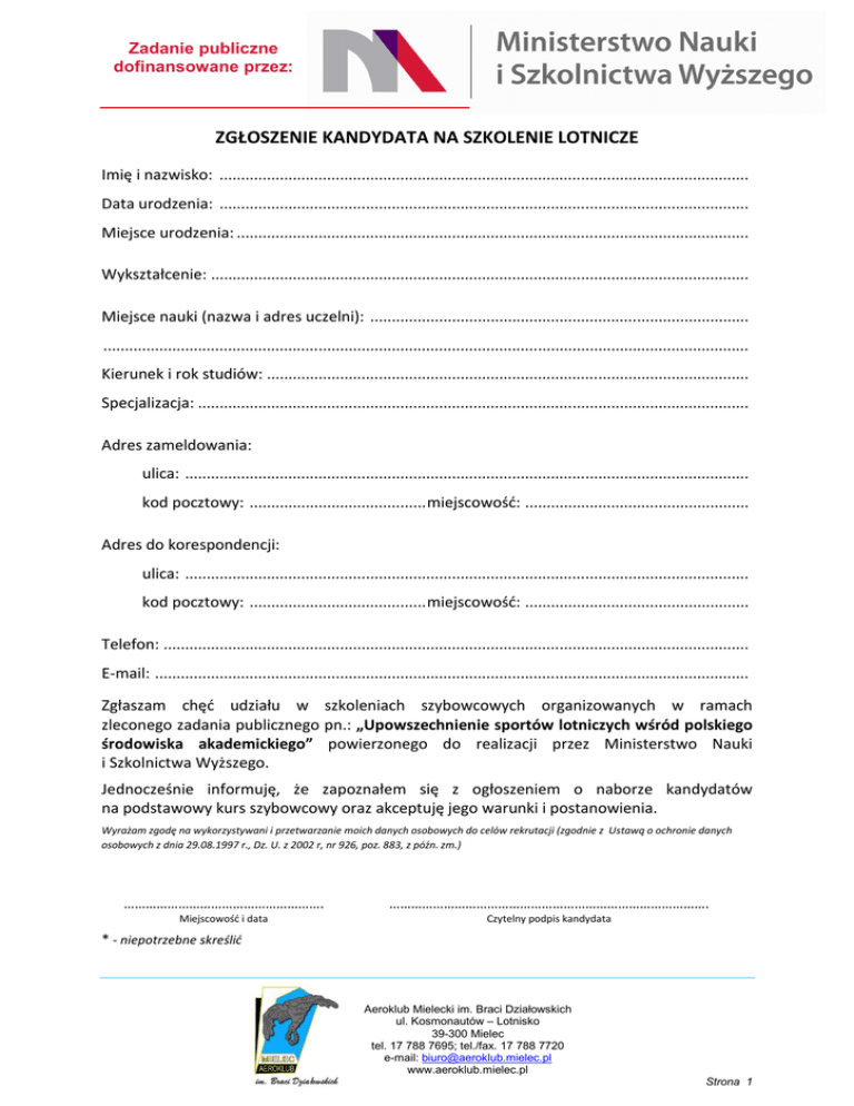 Zadanie publiczne dofinansowane przez: ZGŁOSZENIE KANDYDATA NA SZKOLENIE LOTNICZE Imię i nazwisko: ........................................................................................................................... Data urodzenia: ........................................................................................................................... Miejsce urodzenia: ....................................................................................................................... Wykształcenie: ............................................................................................................................. Miejsce nauki (nazwa i adres uczelni): ........................................................................................ ...................................................................................................................................................... Kierunek i rok studiów: ................................................................................................................ Specjalizacja: ................................................................................................................................ Adres zameldowania: ulica: ................................................................................................................................... kod pocztowy: ......................................... miejscowość: .................................................... Adres do korespondencji: ulica: ................................................................................................................................... kod pocztowy: ......................................... miejscowość: .................................................... Telefon: ........................................................................................................................................ E-mail: .......................................................................................................................................... Zgłaszam chęć udziału w szkoleniach szybowcowych organizowanych w ramach zleconego zadania publicznego pn.: „Upowszechnienie sportów lotniczych wśród polskiego środowiska akademickiego” powierzonego do realizacji przez Ministerstwo Nauki i Szkolnictwa Wyższego. Jednocześnie informuję, że zapoznałem się z ogłoszeniem o naborze kandydatów na podstawowy kurs szybowcowy oraz akceptuję jego warunki i postanowienia. Wyrażam zgodę na wykorzystywani i przetwarzanie moich danych osobowych do celów rekrutacji (zgodnie z Ustawą o ochronie danych osobowych z dnia 29.08.1997 r., Dz. U. z 2002 r, nr 926, poz. 883, z późn. zm.) ………………………………………………. ……………………………………………………………………………. Miejscowość i data Czytelny podpis kandydata * - niepotrzebne skreślić Aeroklub Mielecki im. Braci Działowskich ul. Kosmonautów – Lotnisko 39-300 Mielec tel. 17 788 7695; tel./fax. 17 788 7720 e-mail: [email protected] www.aeroklub.mielec.pl Strona 1 INFORMACJE O KANDYDCIE NA SZKOLENIE LOTNICZE Zainteresowania, hobby, posiadane osiągnięcia, kursy, itp.: ...................................................................................................................................................... ...................................................................................................................................................... ...................................................................................................................................................... Dot. kandydatów na podstawowe teoretyczne i praktyczne szkolenie szybowcowe za wyciągarką** (wg AI PSSz AP): napisz w kilku zdaniach dlaczego chcesz wziąć udział w kursie: ...................................................................................................................................................... ...................................................................................................................................................... ...................................................................................................................................................... ...................................................................................................................................................... ...................................................................................................................................................... Dot. kandydatów na szkolenia doskonalące do licencji pilota szybowcowego PL(G)**: napisz w kilku zdaniach dlaczego chcesz wziąć udział w szkoleniach doskonalących: ...................................................................................................................................................... ...................................................................................................................................................... ...................................................................................................................................................... ...................................................................................................................................................... Ośrodek Szkolenia Lotniczego: .................................................................................................... Posiadany: nalot: .............................................. , liczba lotów: ................................................... Posiadane uprawnienia, zrealizowane ćwiczenia, wylaszowane typy szybowców, itp.: ...................................................................................................................................................... ..............................................................................................................