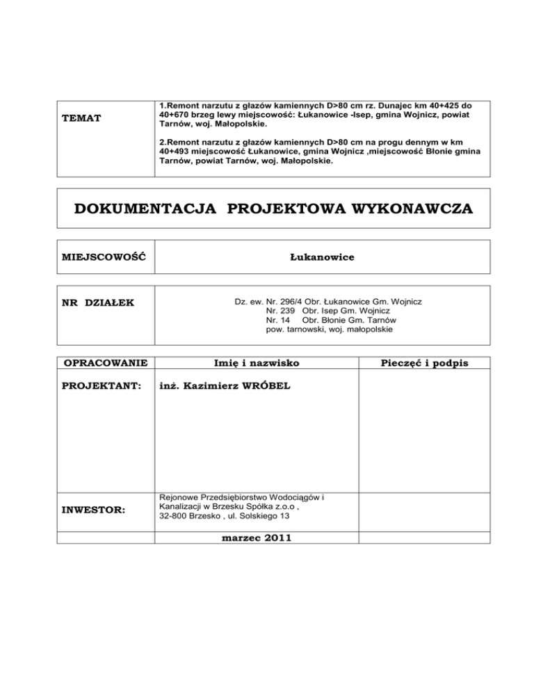TEMAT 1.Remont narzutu z głazów kamiennych D>80 cm rz. Dunajec km 40+425 do 40+670 brzeg lewy miejscowość: Łukanowice -Isep, gmina Wojnicz, powiat Tarnów, woj. Małopolskie. 2.Remont narzutu z głazów kamiennych D>80 cm na progu dennym w km 40+493 miejscowość Łukanowice, gmina Wojnicz ,miejscowość Błonie gmina Tarnów, powiat Tarnów, woj. Małopolskie. DOKUMENTACJA PROJEKTOWA WYKONAWCZA MIEJSCOWOŚĆ NR DZIAŁEK OPRACOWANIE Łukanowice Dz. ew. Nr. 296/4 Obr. Łukanowice Gm. Wojnicz Nr. 239 Obr. Isep Gm. Wojnicz Nr. 14 Obr. Błonie Gm. Tarnów pow. tarnowski, woj. małopolskie Imię i nazwisko PROJEKTANT: inż. Kazimierz WRÓBEL INWESTOR: Rejonowe Przedsiębiorstwo Wodociągów i Kanalizacji w Brzesku Spółka z.o.o , 32-800 Brzesko , ul. Solskiego 13 marzec 2011 Pieczęć i podpis 2 OPRACOWANIE ZAWIERA I. CZĘŚĆ FORMALNĄ - oświadczenia projektanta - uprawnienia projektanta - zaświadczenie o przynależności do Małopolskiej Okręgowej Izby Inżynierów Budownictwa II. PROJEKT ZAGOSPODAROWANIA TERENU - opis techniczny - projekt zagospodarowania terenu w skali 1 : 1000 i orientacja - rysunki szczegółowe III. CZĘŚĆ FOTOGRAFICZNĄ IV. PROJEKT BEZPIECZEŃSTWA I OCHRONY ZDROWIA 3 I. CZĘŚĆ FORMALNA - oświadczenia projektanta - uprawnienia projektanta - zaświadczenia o przynależności do MOIIB 4 II. PROJEKT ZAGOSPODAROWANIA TERENU 1. Opis techniczny 3. Projekt zagospodarowania terenu w skali 1 : 1000 4. Rysunki szczegółowe - przekroje poprzeczne w skali 1 : 100 ( 6 szt. ) 5 OPIS TECHNICZNY 1. PRZEDMIOT I ZAKRES OPRACOWANIA Przedmiotem opracowania jest dokumentacja projektowa, która będzie stanowiła podstawę do zgłoszenia do realizacji inwestycji i uzgodnienia z Administratorem Wód tj. Regionalnym Zarządem Gospodarki Wodnej w Krakowie , Zarządem Zlewni Dolnego Dunajca w Nowym Sączu ul. Naściszowska 31. Opracowanie wykonano w uproszczonej formie projektu technicznego wykonawczego w oparciu o Ustawę z dnia 11 sierpnia 2001 r. o szczegółowych zasadach odbudowy, remontów i rozbiórek obiektów budowlanych zniszczonych lub uszkodzonych w wyniku działania żywiołu oraz Rozporządzenie Prezesa Rady Ministrów z dnia 28 maja 2010 r. zmieniające rozporządzenie w sprawie gmin i miejscowości, w których stosuje się szczególne zasady odbudowy, remontów i rozbiórek obiektów budowlanych zniszczonych lub uszkodzonych w wyniku działania żywiołu. Dokumentacja swym zakresem obejmuje; 1.Remont narzutu z głazów kamiennych D>80 cm rz. Dunajec km 40+425 do 40+670 brzeg lewy miejscowość: Łukanowice -Isep, gmina Wojnicz, powiat Tarnów, woj. Małopolskie, 2.Remont narzutu z głazów kamiennych D>80 cm na progu dennym w km 40+493 miejscowość Łukanowice, gmina Wojnicz ,miejscowość Błonie gmina Tarnów, powiat Tarnów, woj. małopolskie i została wykonana na zlecenie Rejonowego Przedsiębiorstwa Wodociągów i Kanalizacji w Brzesku Spółka z.o.o , 32-800 Brzesko , ul. Solskiego 13. Roboty zostały zaprojektowane na aktualnych podkładach mapowych w skali 1 : 1000 wykonanych przez uprawnionego geodetę. Dokumentacja wykonano w oparciu o inwentaryzację stanu istniejącego, wszystkie niezbędne obliczenia i obmiary ubytków narzutu kamiennego na opasce brzegowej i progu stabilizującym dno w rejonie ujęcia wody w Łukanowicach i przedstawiono w rozwiązaniu projektowym remontu w/w budowli wraz z przedmiarem szczegółowym robót. 6 2. OPIS STANU ISTNIEJĄCEGO . 2.1 DANE Z ZAKRESU CHARAKTERYSTYKI HYDROGRAFICZNEJ 2.1.1 Dane hydrologiczne i hydrauliczne Rzeka Dunajec jest prawobrzeżnym dopływem rz. Wisły . Całkowita długość rz. Dunajec od źródeł do ujścia wynosi 248 km a pow. całkowita 6804 km2 . Charakterystykę hydrologiczną rzeki Dunajec w profilu wodowskazowym Zgłobice, leżącym w pobliżu projektowanych robót remontowych zestawiono poniżej : Dane ogólne: - Km rzeki w miejscu wodowsk. - Powierzchnia zlewni do wodowskazu - Poziom zera wodowskazu Poziom śr.rocznej wody 38 + 300 A = 5648,1 km2 189,60m npm. Kr . 189,16m npm Adr. H = 190,90m npm Adr. Przepływy charakterystyczne: - Średni niski - Średni roczny Przepływ miarodajny w ŚNQ ŚRQ Q50% Q10% Q5% Q2% Q1% Q0,3% = 16,2 = 72,9 = 840 = 2000 = 2490 = 3130 = 3600 = 4400 m3/s m3/s m3/s m3/s m3/s m3/s m3/s m3/s H = 174 cm. H = 450 cm przekroju projektowanych robót remontowych budowli w m. Łukanowice ustalono jak dla wodowskazu Zgłobice Q = 72,9 m3/s . 7 2.1.2 Elementy składowe, główne parametry Parametry koryta głównego oraz budowli na przedmiotowym odcinku rzeki Dunajec dowiązano do zabudowy zrealizowanych robót , które w trakcie powodzi w 2010 r. nie uległy zniszczeniu. Jako przepływ roboczy przyjęto wydatek turbin elektrowni w Czchowie równy 114 m3/s mieszczący się w koronach budowli regulacyjnych. Przepływ miarodajny czyli średni roczny rzeczywisty w przekroju wodowskazowym Zgłobice wynosi 72.9 m3/s przy stanie H = 174 cm. Napełnienie średnie koryta przy przepływie ŚRQ wynosi 120 cm. Szerokość trasy koryta głównego na odcinku opracowania odniesiona do poziomu średniej rocznej wody j.w. spełnia warunek ochrony budowli regulacyjnych i wynosi obecnie około 85 – 90 ,0 m przy napełnieniu 120 cm. Normalny przekrój poprzeczny koryta rzeki na odcinku opracowania zachowany zostaje jak w dokonanej inwentaryzacji koryta i przedstawia się następująco: 1:2 t = 1,20 m t1 = 1,70 m B = 85-90 m 2.2. ZAGADNIENIA ZWIĄZANE Z OCHRONĄ PRZYRODY Formy ochrony przyrody utworzone lub ustanowione na podstawie ustawy z dnia 16.04.2004 r o ochronie przyrody występujące w zasięgu oddziaływania zamierzonego 8 korzystania z wód lub planowanych do się wykonania urządzeń wodnych przedstawiają następująco; 2.2.1 Dane ogólne. Teren opracowania znajduje się w Obszarze Chronionego Krajobrazu Pogórza Ciężkowickiego. W odległości około 20 km w kierunku południowym od przedmiotowego obszaru znajduje się Ciężkowicko-Rożnowski Park Krajobrazowy. Powiązania pr
