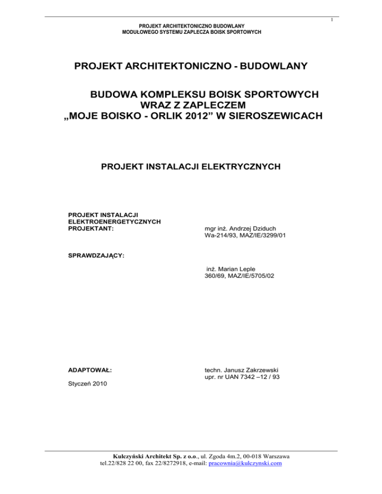 1 PROJEKT ARCHITEKTONICZNO BUDOWLANY MODUŁOWEGO SYSTEMU ZAPLECZA BOISK SPORTOWYCH PROJEKT ARCHITEKTONICZNO - BUDOWLANY BUDOWA KOMPLEKSU BOISK SPORTOWYCH WRAZ Z ZAPLECZEM „MOJE BOISKO - ORLIK 2012” W SIEROSZEWICACH PROJEKT INSTALACJI ELEKTRYCZNYCH PROJEKT INSTALACJI ELEKTROENERGETYCZNYCH PROJEKTANT: mgr inŜ. Andrzej Dziduch Wa-214/93, MAZ/IE/3299/01 SPRAWDZAJĄCY: inŜ. Marian Leple 360/69, MAZ/IE/5705/02 ADAPTOWAŁ: techn. Janusz Zakrzewski upr. nr UAN 7342 –12 / 93 Styczeń 2010 Kulczyński Architekt Sp. z o.o., ul. Zgoda 4m.2, 00-018 Warszawa tel.22/828 22 00, fax 22/8272918, e-mail: [email protected] 2 PROJEKT ARCHITEKTONICZNO BUDOWLANY MODUŁOWEGO SYSTEMU ZAPLECZA BOISK SPORTOWYCH Oświadczenie Projektanta o sporządzeniu projektu architektoniczno budowlanego zgodnie z obowiązującymi przepisami oraz zasadami wiedzy technicznej (Dz. U.1994 Nr 89 poz. 414, PB, Art.20 ust.2) STYCZEŃ 2009r. Oświadczam, Ŝe projekt budowlany pod nazwą; PROJEKT ARCHITEKTONICZNO – BUDOWLANY MODUŁOWEGO SYSTEMOWEGO ZAPLECZA BOISK SPORTOWYCH ORLIK 2012 W SIEROSZEWICACH w zakresie instalacji elektrycznych został sporządzony zgodnie z obowiązującymi przepisami oraz zasadami wiedzy technicznej projektant adaptacji: Kulczyński Architekt Sp. z o.o., ul. Zgoda 4m.2, 00-018 Warszawa tel.22/828 22 00, fax 22/8272918, e-mail: [email protected] 3 PROJEKT ARCHITEKTONICZNO BUDOWLANY MODUŁOWEGO SYSTEMU ZAPLECZA BOISK SPORTOWYCH 5.3.1. Instalacje elektroenergetyczne TABLICE ROZDZIELCZA TABLICA POMIAROWA ZŁACZOWA TZ i POMIAROWA TL Tablicę projektuje się wykonać jako typowe dla danego rejonu energetycznego, wolnostojące zestawy rozdzielcze, które naleŜy wyposaŜyć zgodnie ze standardami technicznymi dostawcy energii elektrycznej. Lokalizację tablic określa kaŜdorazowo techniczne warunki przyłączenia do sieci energetycznej. Szafa zawierać będzie: 1 zabezpieczenia przed licznikowe, 2 układ pomiarowy energii elektrycznej 3 zabezpieczenie za licznikowe 4 elementy układu pomiarowego wg. standardów dostawcy energii. TABLICA ROZDZIELCZA SZATNI TE Tablicę projektuje się wykonać jako typową naścienną obudowę rozdzielczą przystosowaną do montaŜu aparatury modułowej z drzwiami pełnymi. Konstrukcja tablicy metalowa. Obudowa powinna posiadać stopień ochrony IP41 i I lub II (zalecana) kl. ochronności. Wielkość obudowy naleŜy dobrać tak, by umoŜliwiła zabudowanie aparatury zgodnie ze schematem odpowiadającym wyposaŜeniu danego obiektu. Rozdzielnica zawiera następujące elementy: - rozłącznik konserwacyjny, - optyczny (LED) wskaźnik obecności napięcia, - zabezpieczenia nad prądowe poszczególnych obwodów, - elementy sterowania obwodów oświetlenia zewnętrznego (czujnik fotoelektryczny), - układ sterowania (zegar sterujący+stycznik) pracą wentylacji mechanicznej. W rozdzielnicach zaprojektowano ochronniki przeciw przepięciowe kl. „B+C”. Rozdzielnica montowana będzie tak, ze jej górna krawędź znajdować się będzie max. 2,0 m nad poziomem podłogi. PRZEWODY I SPOSÓB PROWADZENIA INSTALACJI Do wykonania projektowanej instalacji projektuje się zastosować następujace typy przewodów: YKYŜo5x() – dla w.l.z. z tablicy TL do tablicy TE (przekrój przewodu dobrany do wartości zabezpieczenia zalicznikowego) YDYŜo ()x1,5mm2 w instalacji oświetleniowa, YDYŜo 3x2,5mm2 w instalacji gniazd wtyczkowych,, LgYŜo 4 – w lokalnych przewodach połączeń wyrównawczych Przy wykonywaniu instalacji naleŜy przestrzegać następujących zasad: • izolacja Ŝył przewodów i kabli powinny odpowiadać kolorom zgodnym z PN, • izolację w kolorze Ŝółto-zielonym moŜna stosować wyłącznie w instalacjach związanych z ochrona od poraŜeń, • przewody układać wewnątrz konstrukcji ścian i sufitów osłonie rurek PCV, • do rozgałęziania instalacji stosować osprzęt hermetyczny, • podejścia instalacji do urządzeń technologicznych wykonywać na podstawie D.T.R. urządzeń, a jeŜeli takowych nie ma pozostawiając zapasy przewodów. INSTALACJE OŚWIETLENIOWA Parametry oświetlenia światłem sztucznym poszczególnych pomieszczeń zgodnie z wymaganiami wymagań zawartymi w PN-EN 12464-1 wynosić będą odpowiednio: • min. 300 lx na płaszczyźnie pracy w pomieszczeniach trenerów • min. 200 lx w łazienkach i sanitariatach, • min. 100 lx na podłodze w magazynie Oprawy oświetleniowe wyposaŜone będą w energooszczędne i wysokosprawne źródła światła. fluorescencyjne – świetlówki liniowe, fluorescencyjne – świetlówki kompaktowe. Instalacja wykonana w całości przewodami typu YDY()x1,5, sterowanie oświetleniem za pomocą indywidualnych wyłączników. Kulczyński Architekt Sp. z o.o., ul. Zgoda 4m.2, 00-018 Warszawa tel.22/828 22 00, fax 22/8272918, e-mail: [email protected] 4 PROJEKT ARCHITEKTONICZNO BUDOWLANY MODUŁOWEGO SYSTEMU ZAPLECZA BOISK SPORTOWYCH OSPRZĘT ŁĄCZENIOWY I GNIAZDA WTYKOWE Osprzęt bazowy do wyboru przez inwestora oraz projektanta przystosowującego projekt do warunków miejscowych. Przy wyborze rozwiązań naleŜy przestrzegać prawa budowlanego, praw pokrewnych i szczególnych oraz kierować się wiedzą techniczną. Osprzęt łączeniowy montować naleŜy na wysokości: • łączniki oświetlenia na wysokości +1,4 • gniazda wtykowe montowane w pomieszczeniach trenera i magazynie na wysokości +1,1 m • gniazda w łazienkach na wysokości +1,4 m. Osprzęt o stopniu ochrony IP44. ZASILANIE I STEROWANIE WENTYLATORAMI NAWIEWNYMI Zasilanie wentylatorów nawiewnych projektuje się wykonać z wykorzystaniem stycznika i zegara sterującego z zachowaniem moŜliwości włączania ręcznego. Zegar będzie załączał wentylatory do stałej pracy w czasie godzin gdy odbywają się treningi, oraz dorywczo w trybie przewietrzania w pozostałej części dnia. INSTALACJA POŁĄCZEŃ WYRÓNAWCZYCH W budynku projektuje się wykonać instalację połączeń wyrównawczych. Przewód magistralny projektowany przewodem LgYŜo6 u