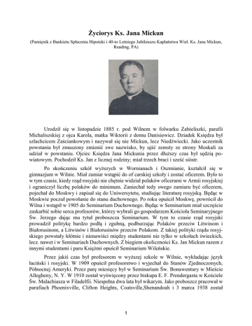 Życiorys Ks. Jana Mickun (Pamięnik z Bankietu Spłacenia Hipoteki i 40-to Letniego Jubileuszu Kapłaństwa Wiel. Ks. Jana Mickun, Reading, PA) Urodził się w listopadzie 1885 r. pod Wilnem w folwarku Zabieliszki, parafii Michaliszskiej z ojca Karola, matka Wiktorii z domu Danisiewicz. Dziadek Księdza był szlachcicem Zaściankowym i nazywał się nie Mickun, lecz Niedźwiecki. Jako uczestnik powstania był zmuszony zmienić swe nazwisko, by ujść zemsty ze strony Moskali za udział w powstaniu. Ojciec Księdza Jana Mickunia przez dłuższy czas był sędzią powiatowym. Pochodził Ks. Jan z licznej rodziny; miał trzech braci i sześć sióstr. Po skończeniu szkół wyższych w Wornianach i Oszmianie, kształcił się w gimnazjum w Wilnie. Miał zamiar wstąpić do of carskiej szkoły i zostać oficerem. Było to w tym czasie, kiedy rząd rosyjski nie chętnie widział polaków oficerami w Armii rosyjskiej i ograniczył liczbę polaków do minimum. Zaniechał tedy swego zamiaru być oficerem, pojechał do Moskwy i zapisał się do Uniwersytetu, studiując literaturę rosyjską. Będąc w Moskwie poczuł powołanie do stanu duchownego. Po roku opuścił Moskwę, powrócił do Wilna i wstąpił w 1905 do Seminarium Duchownego. Będąc w Seminarium miał szczęście zaskarbić sobie serca profesorów, którzy wybrali go gospodarzem Kościoła Seminaryjnego Św. Jerzego dając mu tytuł proboszcza Seminarium. W tym to czasie rząd rosyjski prowadził politykę bardzo podłą i zgubną, podburzając Polaków przeciw Litwinom i Białorusinom, a Litwinów i Białorusinów przeciw Polakom. Z takiej polityki rządu rosyjskiego powstały kłótnie i nienawiści między studentami nie tylko w szkołach świeckich, lecz. nawet i w Seminariach Duchownych. Z biegiem okoliczności Ks. Jan Mickun razem z innymi studentami i paru Księżmi opuścił Seminarium Wileńskie. Przez jakiś czas był profesorem w wyższej szkole w Wilnie, wykładając język łaciński i rosyjski. W 1909 opuścił profesorstwo i wyjechał do Stanów Zjednoczonych, Północnej Ameryki. Przez parę miesięcy był w Seminarium Św. Bonawentury w Mieście Allegheny, N. Y. W 1910 został wyświęcony przez biskupa E. F. Prendergasta w Kościele Św. Malachiasza w Filadelfii. Niespełna dwa lata był wikarym. Jako proboszcz pracował w parafiach Phoenixville, Clifton Heights, Coatsville,Shenandoah i 3 marca 1938 został 1 mianowany proboszczem w parafii Najświętszej Marii Panny w Reading. W Pheonixville był bardzo krótko, w Clifton Heights był trzy łata i tam kupił ogromny plac ziemi, prawie cały skwer, gdzie wybudował piękną plebanię. W Coatsville był pięć lat; wybudował tam szkołę, salę i zaczął budować Kościół, lecz nie wykończył, bo władza duchowna przeniosła go do Shenandoah, do parafii Św. Kazimierza. Tam był proboszczem przez niespełna osiemnaście lat. Będąc w Shenandoah kupił dwa domy, przerobił na drugą szkołę, bo stara była za mała, aby pomieść ć wszystkie dzieci. Podbudował trzecie piętro w plebanii i domu Sióstr. Wymalował i odnowił Kościół. Kupił około 10 akrów ziemi pod nowy cmentarz. Bardzo wiele pomagał kształcącej się młodzieży. Za jego czasów wyświęciło się z jego parafii dwunastu młodzieńców na księży. Około 100 młodych panienek wstąpiło do klasztoru, przeważnie do Sióstr Bernardynek w Millmont w Reading. Po przyjściu do parafii Najświętszej Marii Panny w Reading, dowiedział się Ks. Mickun ze smutkiem, że przez pięćdziesiąt lat ani jeden młodzieniec nie był wyświęcony na księdza z tej parafii. Za czasów Ks. Jana Mickunia trzech się wyświęciło na księży, i trzech się uczy na misjonarzy — zakonników. 2