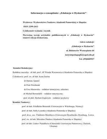 Informacja o czasopiśmie: „Edukacja w Dyskursie” Wydawca: Wydawnictwo Naukowe Akademii Pomorskiej w Słupsku ISSN 2299-2413 Cykliczność wydania: rocznik Pierwotną wersję artykułów publikowanych w „Edukacji w Dyskursie” stanowi edycja drukowana. Adres redakcji: „Edukacja w Dyskursie” ul. Bohaterów Westerplatte 64 [email protected] Tel. (59)8405927 Komitet Redakcyjny: Redaktor naczelny: dr hab. prof. AP Wanda Woronowicz (Akademia Pomorska w Słupsku) Członkowie: prof. zw. dr hab. Iryna Surina dr Danuta Apanel dr Piotr Próchniak dr Ewa Murawska – redaktor tematyczny, sekretarz dr Michał Bernardelli – redaktor statystyczny prof. dr phil. Herbert Zoglowek – redaktor językowy Komitet Naukowy: prof. dr hab. Friedhelm Brusniak (Uniwersytet w Würzburgu, Niemcy) prof. dr hab. Nelly Łysenko (Akademia Pomorska w Słupsku) prof. dr sc. soc. Vladimirs Menšikovs (Uniwersytet Dyneburski, Dyneburg, Łotwa prof. zw. dr hab. Mirosław Patalon (Akademia Pomorska w Słupsku) prof. dr hab. Liubov Pietukhova (Chersoński Uniwesrytet Państwowy, Chersoń, Ukraina) dr hab. prof. AP Lucyna Preuss-Kuchta (Akademia Pomorska w Słupsku) prof. dr hab. Elena Sorochinskaya (Południowy Federalny Uniwersytet, Rostów nad Donem, Rosja) „Edukacja w Dyskursie” - inicjatywa wydawnicza pracowników Instytutu Pedagogiki i Pracy Socjalnej - to czasopismo, które z założenia stanowić ma forum debaty nad związkami pedagogiki jako nauki z praktyką edukacyjną, widzianych przez pryzmat doświadczanych i „dziejących” się przełomów społecznych, kulturowych, ekonomicznych i politycznych, mających istotne implikacje dla pedagogiki i systemu edukacji. Czasopismo ma charakter otwarty. Zapraszamy do dyskusji nad ważnymi dla teorii i praktyki problemami funkcjonowania współczesnej szkoły, placówek opiekuńczo-wychowawczych, socjalnych i resocjalizacyjnych, a także istotnych zagadnień zawodowego funkcjonowania nauczycieli/pedagogów, w kontekście zmieniających się potrzeb i oczekiwań społecznych. Oferta ta, z racji zakresu i istoty podejmowanych problemów, ma charakter interdyscyplinarny, oczekujemy więc zainteresowania nie tylko ze strony pedagogów, ale również psychologów, socjologów, kulturoznawców, czy politologów. Równie ważne dla tego dyskursu są prezentacje analiz teoretycznych i wyników badań naukowych, jak i doświadczeń oraz propozycji konstruktywnego rozwiązywania trudnych problemów edukacyjnych, które są rezultatem praktycznych doświadczeń nauczycieli – opiekunów wychowawców. Do tego dyskursu zapraszamy więc nauczycieli akademickich, studentów, nauczycieli/pedagogów praktyków. Treści zamieszczanych w czasopiśmie tekstów (studiów, rozpraw, komunikatów z badań, sprawozdań i recenzji) dotyczyć będą głównie tematyki w następujących obszarach: - aksjologicznych i teleologicznych kontekstów edukacji; - jakości kształcenia na różnych poziomach edukacji; - konsekwencji restrykcyjności społecznej; - (re)definicji roli zawodowej współczesnych nauczycieli/pedagogów; - dylematów etycznych w pracy pedagogicznej; - konstytuowania się tożsamości zawodowej współczesnych nauczycieli/pedagogów; - (nie)wydolności wychowawczej placówek opiekuńczo-wychowawczych, wsparcia socjalnego i placówek resocjalizacyjnych; - implikacji edukacyjnych związanych z przemianami społecznymi, kulturowymi, politycznoekonomicznymi współczesnego świata. Termin składania tekstów upływa z końcem marca każdego roku. Informacje dla autorów Prosimy Autorów, zamierzających opublikować swój tekst w „Edukacji w Dyskursie”, o przestrzegania następujących zasad: 1. Redakcja przyjmuje wyłącznie oryginalne teksty, dotychczas nie publikowane i nie przeznaczone do publikacji w innych wydawnictwach. 2. Prace powinny być dostarczone na nośniku elektronicznym wolnym od wirusów (edytor tekstu Word 97 for Windows), z kontrastowym, jednostronnym wydrukiem laserowym lub atramentowym, w formacie A4, w jednym egzemplarzu. Tekst zapisany na płycie CD nie może się różnić od treści dostarczonego wydruku. W całej pracy obowiązuje standardowa wielkość czcionki typu Times New Roman 12 pkt; przypisy, bibliografia – 10 pkt; w opisach rysunków i tabel – 9 pkt. Przy komputerowej edycji tekstu powinny być przestrzegane następujące reguły: odstęp między wierszami - 1,5; lewy i prawy margines 2,5 cm; ciągła numeracja stron; można używać pogrubionych liter i kursywy; prosimy nie stosować podkreśleń; maksymalna objętość całego tekstu (łącznie z bibliografią i streszczeniem) nie powinna przekraczać jednego arkusza wydawniczego, to jest 40 000 znaków typograficznych (ze spacjami) lub ok. 22 znormalizowanych stron (30 wierszy na stronę, około 60 miejsc znakowych w wierszu); teksty można składać w Instytucie Pedagogiki i Pracy Socjalnej lub wysłać drogą elektroniczną jako załącznik na adres: [email protected] materiał ilustracyjny całostronicowy (tabele, rysunki, schematy i wykresy) powinien być opracowany i wpisany w formie osobnych plików graficznych; na marginesie pracy należy zaznaczyć przewidywane miejsce ilustracji; mniejsze tabele, rysunki, schematy i wykresy mogą być zamieszczone w tekście; tabele i rysunki nie mogą mieć formatu większego niż A3, zalecany maksymalny format rysunków i tabel: 12,5 cm x 19 cm; materiał ten nie może być wykonany odręcznie, nie są też dopuszczane kserokopie i materiały z Internetu. materiał ilustracyjny musi być opatrzony tytułem (numer i tytuł nad tabelą, a pod rysunkiem i wykresem); pod każdym elementem graficznym obowiązuje wpisanie źródła, z którego został on zaczerpnięty, lub informacji, że stanowi opracowanie własne autora bądź opracowanie na podstawie prac innych autorów; wykorzystanie zapożyczonego materiału ilustracyjnego wymaga dołączenia pisemnej zgody podmiotów posiadających prawa autorskie. na końcu tekstu należy z