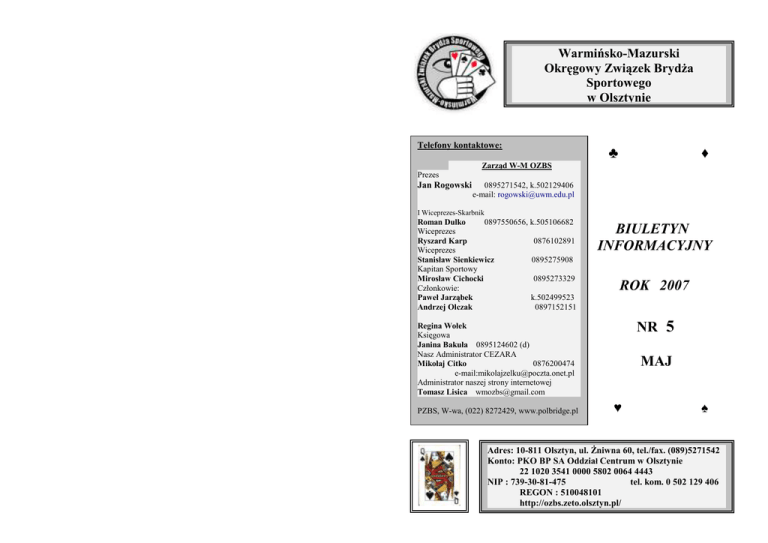 Warmińsko-Mazurski Okręgowy Związek BrydŜa Sportowego w Olsztynie Telefony kontaktowe: ♣ ♦ Zarząd W-M OZBS Prezes Jan Rogowski 0895271542, k.502129406 e-mail: [email protected] I Wiceprezes-Skarbnik Roman Dulko 0897550656, k.505106682 Wiceprezes Ryszard Karp 0876102891 Wiceprezes Stanisław Sienkiewicz 0895275908 Kapitan Sportowy Mirosław Cichocki 0895273329 Członkowie: Paweł Jarząbek k.502499523 Andrzej Olczak 0897152151 BIULETYN INFORMACYJNY ROK 2007 NR 5 Regina Wołek Księgowa Janina Bakuła 0895124602 (d) Nasz Administrator CEZARA Mikołaj Citko 0876200474 e-mail:[email protected] Administrator naszej strony internetowej Tomasz Lisica [email protected] PZBS, W-wa, (022) 8272429, www.polbridge.pl MAJ ♥ ♠ Adres: 10-811 Olsztyn, ul. śniwna 60, tel./fax. (089)5271542 Konto: PKO BP SA Oddział Centrum w Olsztynie 22 1020 3541 0000 5802 0064 4443 NIP : 739-30-81-475 tel. kom. 0 502 129 406 REGON : 510048101 http://ozbs.zeto.olsztyn.pl/ STYCZEŃ 2007 Biuletyn Informacyjny W-M OZBS Nr. 5 ♠ ♥ ♣ ♦ WK Nowe tytuły klasyfikacyjne WK Arcymistrz Międzynarodowy (18.0) - Andrzej Fronczak Mistrz Krajowy (4.0) - Jerzy Bujnowski - Zdzisław Godlewski Mistrz Rejonowy (2.5) - Jan Chodkiewicz - Wojciech Hensoldt - Stanisław Okuniewicz - Krzysztof Waszkiewicz Mistrz Okręgowy (1.5) - Tadeusz Madejski Mistrz Klubowy (1.0) - Stanisław Bohut - Ziemowit Nowak - Barbara Szydłowska Gratulujemy! 2 MAJ 2007 Biuletyn Informacyjny W-M OZBS Nr. 5 RÓśNE INFORMACJE RÓśNE Zapraszamy do startu w Kadrze Województwa Wzorem ubiegłego roku Zarząd W-M OZBS podjął uchwałę o przeprowadzeniu rozgrywek kadrowych, których celem będzie wyłonienie Reprezentacji Warmińsko-Mazurskiego Związku BrydŜa Sportowego na dwa turnieje teamowe lub odpowiednio turnieje parowe w ramach Prokom Software GP Par (w jednym z trzech miejsc: Sopot, Słupsk bądź Warszawa). Zarząd pokryje koszty startu powołanych par (wpisowe, diety, ryczałt za ew. noclegi i przejazd). W rozgrywkach mogą wziąć udział aktualni członkowie W-M OZBS. Jednorazowe wpisowe do kadry wynosi (od osoby):15zł. lub 10zł.(opłata zniŜkowa). W tym roku przeprowadzimy rozgrywki Kadry w ciągu jednego dnia (trzeba się liczyć, Ŝe moŜe być rozegranych 50-70 rozdań). Regulamin rozgrywek zostanie podany po zamknięciu listy zgłoszeń, a sposób przeprowadzenia rozgrywek będzie uzaleŜniony od liczby zgłoszonych par. Stosowne decyzje podejmie komisja pod przewodnictwem Kapitana Sportowego Mirosława Cichockiego. Zgłoszenia par będą przyjmowane maksymalnie do 20 minut przed rozpoczęciem gry. Termin rozgrywek – 19 maja. Miejsce rozgrywek i godzinę ich rozpoczęcia podamy najpóźniej podczas III Majówki BrydŜowej (11-13 maja) Podobnie jak w ubiegłym roku cztery czołowe pary tych rozgrywek stanowić będą reprezentację W-M OZBS. O miejscu startu i zestawieniu par zdecyduje Zarząd W-M OZBS na wniosek Kapitana Sportowego. Pary z miejsc 5,6 będą rezerwowymi. Całość rozgrywek kadrowych nadzoruje Mirosław Cichocki, k. 660719709. Zapraszamy MAJ 2007 3 Biuletyn Informacyjny W-M OZBS Nr. 5 Kalendarz najbliŜszych imprez MAJ 1 TP o Puchar Burmistrza Miasta Morąg GPW-B Olsztyn GPW-B m. rozgr. Restauracja Adria, godz. 1000 3 TP „Konstytucji 3-Maja” m. rozgr. Restauracja Pirat, ul. Bałtycka 95, godz. 1100 5 Ostróda TP „ Nocny” GPW-B m. rozgr. Klub Garnizonowy, ul. Grunwaldzka 17/1, godz. 1730 19 Kadra Wojewódzka 11-13 III Warmińska Majówka BrydŜowa Olsztyn m. rozgr. NOVOTEL OLSZTYN, ul. Sielska GPW A i 2B CZERWIEC 2-3 IV Mityng BrydŜowy „Dni Ełku” Ełk 00 2.06 godz.10 TP na impy (GPW-B) 2.06 godz.1615 T Teamów (GPW-B) 3.06 godz. 930 TP na maxy (GPW-A) GPW-A i 2B m. rozgr. Hotel w Szeligach 9-10 Ogólnopolski Mityng BrydŜowy 16 sob TP o Puchar Burmistrza 17 TP o Puchar Dyr. Banku PKO BP 4 MAJ 2007 Węgorzewo Orneta Olsztyn GPW A i 2B GPW-B GPW-B Biuletyn Informacyjny W-M OZBS Nr. 5 ------------------------------------------------------------------------------------------------------- III Warmińska Majówka BrydŜowa NOVOTEL OLSZTYN, ul. Sielska 11 maja 2007 r., godz. 17.00 Turniej Przyjaciół BrydŜa o puchar Jerzego Siwkiewicza, dyrektora Banku Ochrony Środowiska SA w Olsztynie 12 maja 2007 r., godz. 10.00 (GPW-B) Samorządowy Turniej Par o puchar Czesława Jerzego Małkowskiego, prezydenta miasta Olsztyn 12 maja 2007., godz. 15.00 (GPW-B) Turniej Miast Warmii, Mazur i Powiśla o puchar Jacka Protasa, marszałka województwa warmińsko-mazurskiego 13 maja 2007 r., godz. 10.30 (GPW-A) Warmiński Turniej Par o puchar Adama Sierzputowskiego, starosty olsztyńskiego POSTANOWIENIA REGULAMINOWE 1. 2. 3. 4. 5. 6. Wszystkie turnieje mają charakter otwarty. W przypadku braku miejsc decyduje kolejność zgłoszeń. Wszystkie turnieje zaliczane są do klasyfikacji długofalowej. Prowadzona będzie dodatkowa klasyfikacja dla reprezentantów samorządów. Przewidziane są nagrody finansowe dla najlepszych par w poszczególnych turniejach oraz dla zdobywców największej liczby punktów w klasyfikacji długofalowej. Upominki rzeczowe dla przynajmniej 100 uczestników Majówki. Wpisowe wynosi 25 zł od osoby na kaŜdy turniej. ZniŜki dla kobiet, seniorów(po 20 zł) i młodzieŜy szkolnej. Zapisy będą przyjmowane przed turniejami. Rezerwacji miejsc moŜna dokonywać u kol. Zbigniewa Zemanowicza, tel/fax 089 5271206, tel. kom. 604-544-500, e-mail [email protected] Obiady „szwedzkie” – płacisz 25 zł i jesz, ile zdołasz!!! MAJ 2007 5 Biuletyn Informacyjny W-M OZBS Nr. 5 ♣♣♥ TURNIEJE ♦♦♦♦♦ WYNIKI ♥♣♣ Mistrzostwa Województwa Par na impy, Olsztyn, 15.04.07r. z udziałem 33 par, rozegrane w Tawernie „Pirat” imp 1. Czeslaw Olender - Jan Danilczuk 2. Krzysztof Michalczyk – Mirosław Zomkowski 3. Grzegorz Lasocki - Edmund Reczuga 4. Filip Bieńkowski - Jan Rogowski 5. Zygmunt Duk - Czesław Kornacki 6. Wojciech Wrześniowski - Mirosław Doroszuk 7. Marcin Bartoszewski - Dariusz