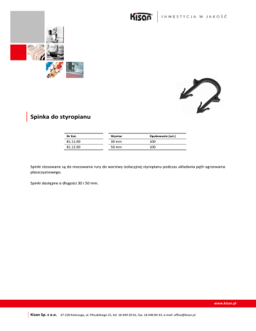 Spinka do styropianu Nr Kat. Wymiar Opakowanie (szt.) 81.11.00 30 mm 100 81.12.00 50 mm 100 Spinki stosowane są do mocowania rury do warstwy izolacyjnej styropianu podczas układania pętli ogrzewania płaszczyznowego. Spinki dostępne o długości 30 i 50 mm. www.kisan.pl Kisan Sp. z o.o. 37-220 Kańczuga, ul. Piłsudskiego 21, tel. 16 649 20 61, fax: 16 648 84 33, e-mail: [email protected]
