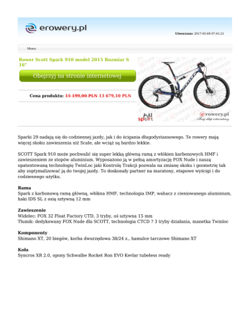 Utworzono: 2017-03-08 07:41:21 Menu: Rower Scott Spark 910 model 2015 Rozmiar S 16" Obejrzyj na stronie internetowej Cena produktu: 15 199,00 PLN 13 679,10 PLN Sparki 29 nadają się do codziennej jazdy, jak i do ścigania długodystansowego. Te rowery mają więcej skoku zawieszenia niż Scale, ale wciąż są bardzo lekkie. SCOTT Spark 910 może pochwalić się super lekką główną ramą z włókien karbonowych HMF i zawieszeniem ze stopów aluminium. Wyposażono ją w pełną amortyzację FOX Nude i naszą opatentowaną technologię TwinLoc jaki Kontrolę Trakcji pozwala na zmianę skoku i geometrię tak aby zoptymalizować ją do twojej jazdy. To doskonały partner na maratony, etapowe wyścigi i do codziennego użytku. Rama Spark z karbonową ramą główną, włókna HMF, technologia IMP, wahacz z cieniowanego aluminium, haki IDS SL z osią sztywną 12 mm Zawieszenie Widelec: FOX 32 Float Factory CTD, 3 tryby, oś sztywna 15 mm Tłumik: dedykowany FOX Nude dla SCOTT, technologia CTCD ? 3 tryby działania, manetka Twinloc Komponenty Shimano XT, 20 biegów, korba dwurzędowa 38/24 z., hamulce tarczowe Shimano XT Koła Syncros XR 2.0, opony Schwalbe Rocket Ron EVO Kevlar tubeless ready Rozmiary ram Klamki hamulców Hamulce Mechanizm korbowy Oś korbowodu Prowadzenie łańcucha Kierownica Mostek/ Wspornik kierownicy Shimano XT BL-M785 Disc Shimano XT BR-M785 Disc 180/F and 160/Rmm SM-RT64 CL Rotor Shimano XT FC-M785 Hollowtech 2 38Ax24A T Shimano SM-BB71-41A / shell 41x89.5mm Syncros FL1.5 Tbar Alloy 7050 D.B. / T shape Flat / 9° / 700mm Syncros Pro lock-on grips Syncros XR1.5 -10° 7050 Alloy / 31.8mm / 1 1/8" Pedały Brak Sztyca Syncros FL1.5 / 31.6mm Siodło Przeznaczenie Piasta przód Syncros XR1.5 / Titanium rails Męski Syncros XR2.0 CL / 15mm made by DT Swiss Piasta tył Syncros XR2.0 CL / 142 × 12mm / RWS axle made by DT Swiss Łańcuch Shimano CN-HG75 Kaseta/ wolnobieg Shimano XT CS-M771-10 11-36 T Szprychy DT Swiss Competition 2.0-1.8-2.0 Black Obręcze Syncros XR2.0 28H / Tubeless ready Opony Schwalbe Rocket Ron EVO / 2.25 127EPI Kevlar Bead Tubeless Easy / PaceStar compound Wyposażenie dodatkowe Typ roweru Górski Waga 11,4kg Tylny amortyzator /Damper Rozmiar kół Sezon Rodzina FOX Nude / SCOTT custom w. travel / geo adj CTCD 3 modes: Climb - Traction Control - Descend / reb. Adj. 29" 2015 - Rama Spark Carbon / IMP technology / HMF / BB92 / Alloy swingarm with 160PM U-Mono Link / Tapered Headtube IDS SL DM dropouts for 142 × 12mm BB height adj. Widelec/amortyzator FOX 32 Float Factory CTD Air CTD damper with 3 modes 15mm QR axle / tapered steerer reb. Adj. Stery Ritchey Pro Tapered 1.5" - 1 1/8" semi integ. OD 50/61mm / ID 44/55mm Przerzutka przód Przerzutka tył Manetki Shimano XT FD-M785-E2 / DM Shimano XT RD-M786 SGS / DM Shadow PlusType / 20 Speed Shimano XT SL-M780-I Rapidfire Plus / 2 way release Ispec clamp Mimo dołożenia wszelkich starań nie gwarantujemy, że publikowane opisy i specyfikacje techniczne niezawierają uchybień lub błędów, które nie mogą jednak być podstawą do roszczeń. W przypadku jakichkolwiek wątpliwości, przed podjęciem decyzji prosimy o kontakt. Adres: www.erowery.pl Telefon: 605 515 185, 34 361 16 71 Email: [email protected]