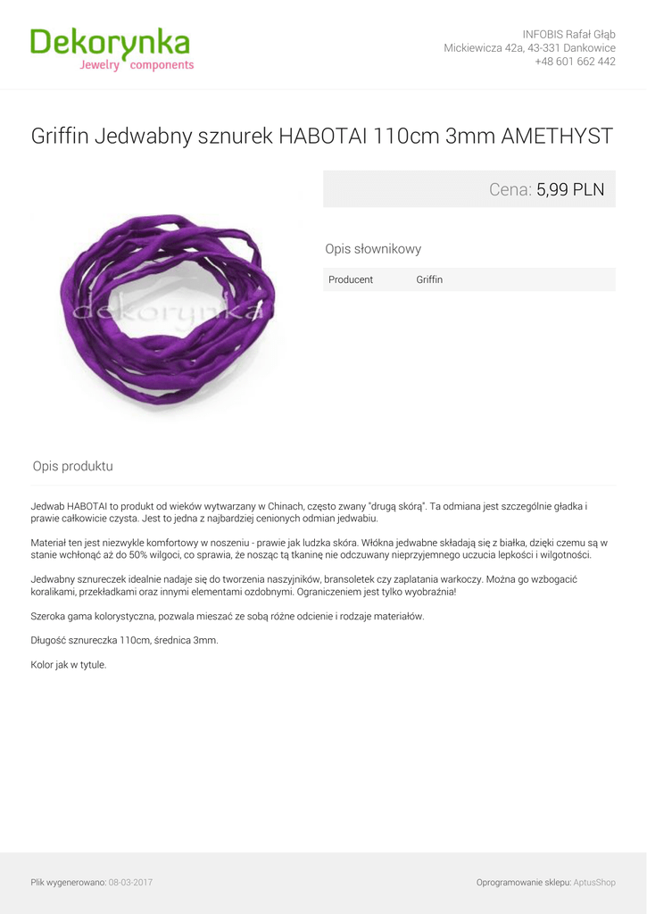 INFOBIS Rafał Głąb Mickiewicza 42a, 43-331 Dankowice +48 601 662 442 Griffin Jedwabny sznurek HABOTAI 110cm 3mm AMETHYST Cena: 5,99 PLN Opis słownikowy Producent Griffin Opis produktu Jedwab HABOTAI to produkt od wieków wytwarzany w Chinach, często zwany "drugą skórą". Ta odmiana jest szczególnie gładka i prawie całkowicie czysta. Jest to jedna z najbardziej cenionych odmian jedwabiu. Materiał ten jest niezwykle komfortowy w noszeniu - prawie jak ludzka skóra. Włókna jedwabne składają się z białka, dzięki czemu są w stanie wchłonąć aż do 50% wilgoci, co sprawia, że nosząc tą tkaninę nie odczuwany nieprzyjemnego uczucia lepkości i wilgotności. Jedwabny sznureczek idealnie nadaje się do tworzenia naszyjników, bransoletek czy zaplatania warkoczy. Można go wzbogacić koralikami, przekładkami oraz innymi elementami ozdobnymi. Ograniczeniem jest tylko wyobraźnia! Szeroka gama kolorystyczna, pozwala mieszać ze sobą różne odcienie i rodzaje materiałów. Długość sznureczka 110cm, średnica 3mm. Kolor jak w tytule. Plik wygenerowano: 08-03-2017 Oprogramowanie sklepu: AptusShop INFOBIS Rafał Głąb Mickiewicza 42a, 43-331 Dankowice +48 601 662 442 Galeria Plik wygenerowano: 08-03-2017 Powered by TCPDF (www.tcpdf.org) Oprogramowanie sklepu: AptusShop