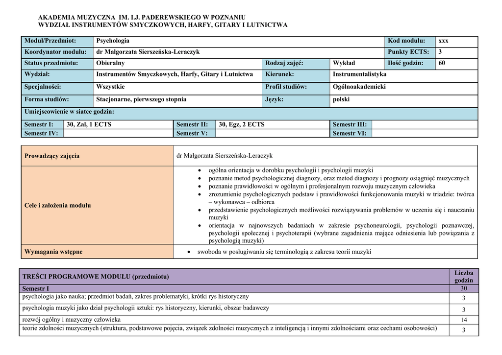 AKADEMIA MUZYCZNA IM. I.J. PADEREWSKIEGO W POZNANIU WYDZIAŁ INSTRUMENTÓW SMYCZKOWYCH, HARFY, GITARY I LUTNICTWA Moduł/Przedmiot: Psychologia Kod modułu: xxx Koordynator modułu: dr Małgorzata Sierszeńska-Leraczyk Punkty ECTS: 3 Status przedmiotu: Obieralny Rodzaj zajęć: Wykład Ilość godzin: 60 Wydział: Instrumentów Smyczkowych, Harfy, Gitary i Lutnictwa Kierunek: Instrumentalistyka Specjalności: Wszystkie Profil studiów: Ogólnoakademicki Forma studiów: Stacjonarne, pierwszego stopnia Język: polski Umiejscowienie w siatce godzin: Semestr I: Semestr IV: 30, Zal, 1 ECTS Prowadzący zajęcia Semestr II: Semestr V: Semestr III: Semestr VI: dr Małgorzata Sierszeńska-Leraczyk Cele i założenia modułu Wymagania wstępne 30, Egz, 2 ECTS ogólna orientacja w dorobku psychologii i psychologii muzyki poznanie metod psychologicznej diagnozy, oraz metod diagnozy i prognozy osiągnięć muzycznych poznanie prawidłowości w ogólnym i profesjonalnym rozwoju muzycznym człowieka zrozumienie psychologicznych podstaw i prawidłowości funkcjonowania muzyki w triadzie: twórca – wykonawca – odbiorca przedstawienie psychologicznych możliwości rozwiązywania problemów w uczeniu się i nauczaniu muzyki orientacja w najnowszych badaniach w zakresie psychoneurologii, psychologii poznawczej, psychologii społecznej i psychoterapii (wybrane zagadnienia mające odniesienia lub powiązania z psychologią muzyki) swoboda w posługiwaniu się terminologią z zakresu teorii muzyki TREŚCI PROGRAMOWE MODUŁU (przedmiotu) Semestr I psychologia jako nauka; przedmiot badań, zakres problematyki, krótki rys historyczny Liczba godzin 30 3 psychologia muzyki jako dział psychologii sztuki: rys historyczny, kierunki, obszar badawczy 3 rozwój ogólny i muzyczny człowieka teorie zdolności muzycznych (struktura, podstawowe pojęcia, związek zdolności muzycznych z inteligencją i innymi zdolnościami oraz cechami osobowości) 14 3 problematyka oceniania wykonań muzycznych przyczyny trudności i niepowodzeń w kształceniu muzycznym (predyktory powodzenia w działalności muzycznej) 3 Semestr II najnowsze teorie zdolności i inteligencji; zdolności a osiągnięcia teorie zdolności muzycznych; przegląd metod badania zdolności muzycznych (metody niestandaryzowane i standaryzowane – testy), problemy rekrutacji dzieci i młodzieży do szkół muzycznych najnowsze badania nad mózgiem (obszary związane z percepcją, uczeniem się i działalnością muzyczną – fizjologiczne zmiany w mózgu muzyków, wpływ uczenia się muzyki na inne funkcje intelektualne najnowsze wyniki badań nad uczeniem się i pamięcią (typy pamięci, krytyka klasycznych badań nad pamięcią i uczeniem się, pamięć w kontekście współczesnej wiedzy neuropsychologicznej) trema u muzyków (badania nad tremą, rodzaje, przyczyny, objawy, sposoby terapii tremy) procesy uczenia się, zapamiętywania i myślenia w dydaktyce muzycznej (najnowsze sposoby polepszania procesu uczenia się muzyki) emocje i stres życia (funkcje emocji, teorie emocji, wpływ na uczenie się , źródła stresu, reakcje fizjologiczne, strategie radzenia sobie ze stresem, poznawcze strategie modyfikowania stresu) Kod efektu Wiedza (W) Umiejętności (U) Kompetencje społeczne (K) EFEKTY KSZTAŁCENIA MODUŁU (przedmiotu) W01 Posiada wiedzę o podstawowych kierunkach psychologii jako nauki W02 Orientuje się w specyfice rozwoju muzycznego człowieka W03 Zna współczesne poglądy w zakresie rozwoju poznawczego, osobowościowego i w obszarze zdolności ogólnych i specjalnych U01 Potrafi ocenić wykonanie muzyczne biorąc pod uwagę wszystkie możliwe uwarunkowania związane z tym procesem U02 Potrafi zaplanować proces dydaktyczny biorąc pod uwagę możliwości rozwojowe ucznia K01 Oceniając zdolności muzyczne ucznia, ma świadomość możliwych różnic na linii: osiągnięcia (umiejętności) – potencjał K02 Właściwie i stosownie do sytuacji dba o relacje interpersonalne w różnych sytuacjach zawodowo-muzycznych 4 45 7 7 5 9 5 6 6 Efekt kształcenia w obszarze kształcenia S1A_W01 S1A_W05 S1A_W05 S1A_U07 S1A_U06 S1A_K03 S1A_K04 Metody kształcenia wykład problemowy wykład z prezentacją multimedialną wybranych zagadnień analiza (studium) przypadków prezentacja nagrań CD i DVD Wymagania końcowe – zaliczenie roku, forma oceny Metody weryfikacji efektów kształcenia Forma i warunki zaliczenia przedmiotu egzamin standaryzowany egzamin na bazie problemu kolokwium pisemne test ewaluacyjny wiedzy Nr efektu U01 K02 U01 W01 W01 U02 W02 W02 K01K04 K01 W03 W03 K01 Warunki zaliczenia: Zaliczenie przedmiotu uwarunkowane jest uczęszczaniem na zajęcia (kontrola obecności) oraz osiągnięciem wszystkich założonych efektów kształcenia. Szczegółowe warunki określono w par. 17 Regulaminu studiów. Warunki egzaminu: Warunkiem przystąpienia do egzaminu lub kolokwium jest uzyskanie zaliczenia z przedmiotu. Warunkiem zdania egzaminu jest uzyskanie minimum 11 punktów. Ocena wyrażana jest w skali od 1 do 25 pkt. obowiązującej w AM w Poznaniu. Inne: Semestr I: Zaliczenie Semestr II: Egzamin Semestr III: Semestr IV: Semestr V: NAKŁAD PRACY STUDENTA – ILOŚĆ PUNKTÓW ECTS Godziny realizowane przy bezpośrednim udziale nauczyciela akademickiego Zajęcia dydaktyczne: Konsultacje: Ilość godzin egzaminu: Suma: Przygotowywanie się do zajęć: Ilość godzin: 75 2 3 80 4 Punkty ECTS: 2,5 0,7 0,10 2,10 (88,89 %) 0,13 Semestr VI: Ilość godzin samodzielnej pracy studenta w czasie trwania przedmiotu Przygotowywanie się do ostatecznego zaliczenia/zdania egzaminu: Przygotowywanie się do prezentacji w czasie trwania semestru: Suma: 4 2 10 0,13 0,7 0,33 (11,11 %) Sumaryczny nakład pracy: (wiersz ustala Dziekan) 90 3 Literatura podstawowa Fontana D. – Psychologia dla nauczycieli, 1998, Poznań Manturzewska M. (red) – Wybrane zagadnienia z psychologii muzyki,1990, Warszawa Manturzewska M. – Psychologiczne warunki osiągnięć pianistycz