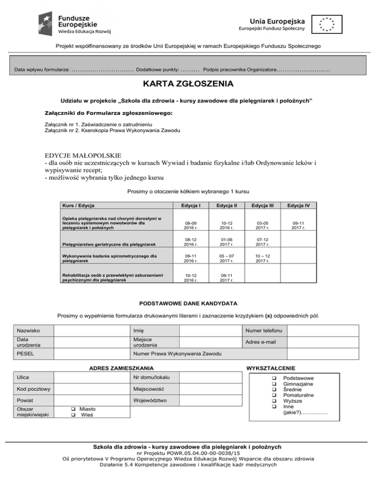 Projekt współfinansowany ze środków Unii Europejskiej w ramach Europejskiego Funduszu Społecznego Data wpływu formularza: ………………………… Dodatkowe punkty: ……… Podpis pracownika Organizatora…………………..… KARTA ZGŁOSZENIA Udziału w projekcie „Szkoła dla zdrowia - kursy zawodowe dla pielęgniarek i położnych” Załączniki do Formularza zgłoszeniowego: Załącznik nr 1. Zaświadczenie o zatrudnieniu Załącznik nr 2. Kserokopia Prawa Wykonywania Zawodu EDYCJE MAŁOPOLSKIE - dla osób nie uczestniczących w kursach Wywiad i badanie fizykalne i/lub Ordynowanie leków i wypisywanie recept; - możliwość wybrania tylko jednego kursu Prosimy o otoczenie kółkiem wybranego 1 kursu Kurs / Edycja Edycja I Edycja II Edycja III Edycja IV Opieka pielęgniarska nad chorymi dorosłymi w leczeniu systemowym nowotworów dla pielęgniarek i położnych 08-09 2016 r. 10-12 2016 r. 03-05 2017 r. 09-11 2017 r. Pielęgniarstwo geriatryczne dla pielęgniarek 08-12 2016 r. 01-06 2017 r. 07-12 2017 r. Wykonywanie badania spirometrycznego dla pielęgniarek 09-11 2016 r. 05 – 07 2017 r. 10 – 12 2017 r. Rehabilitacja osób z przewlekłymi zaburzeniami psychicznymi dla pielęgniarek 10-12 2016 r. 09-11 2017 r. PODSTAWOWE DANE KANDYDATA Prosimy o wypełnienie formularza drukowanymi literami i zaznaczenie krzyżykiem (x) odpowiednich pól. Nazwisko Imię Data urodzenia Miejsce urodzenia PESEL Ulica Adres e-mail Numer Prawa Wykonywania Zawodu ADRES ZAMIESZKANIA Nr domu/lokalu Kod pocztowy Miejscowość Powiat Województwo Obszar miejski/wiejski Numer telefonu Miasto Wieś WYKSZTAŁCENIE Szkoła dla zdrowia - kursy zawodowe dla pielęgniarek i położnych Podstawowe Gimnazjalne Średnie Pomaturalne Wyższe Inne (jakie?)…………… nr Projektu POWR.05.04.00-00-0038/15 Oś priorytetowa V Programu Operacyjnego Wiedza Edukacja Rozwój Wsparcie dla obszaru zdrowia Działanie 5.4 Kompetencje zawodowe i kwalifikacje kadr medycznych Projekt współfinansowany ze środków Unii Europejskiej w ramach Europejskiego Funduszu Społecznego □ □ Pracownik POZ Nazwa zakładu pracy ZATRUDNIENIE TAK NIE (PROSZĘ PODAĆ NAZWĘ I ADRES PLACÓWKI) Powiat zatrudnienia Adres zakładu pracy Status pracodawcy NIP zakładu pracy Zajmowane stanowisko Staż pracy zawodowej mikroprzedsiębiorstwo (od 2 do 9 pracowników) małe przedsiębiorstwo (od 10 do 49 pracowników) średnie przedsiębiorstwo (od 50 do 249 pracowników) duże przedsiębiorstwo (powyżej 249 pracowników) administracja publiczna organizacja pozarządowa inne, jakie?........................................ STATUS UCZESTNIKA PROJEKTU OSOBA NALEŻĄCA DO MNIEJSZOŚCI NARODOWEJ LUB ETNICZNEJ, MIGRANT, OSOBA OBCEGO POCHODZENIA □ Tak □ Nie □ Odmawiam podania danych OSOBA PRZEBYWAJĄCA W GOSPODARSTWIE DOMOWYCM BEZ OSÓB PRACUJĄCYCH □ Tak □ Nie W TYM: W GOSPODARSTWIE DOMOWYM Z DZIEĆMI POZOSTAJĄCYMI NA UTRZYMANIU □ Tak □ Nie OSOBA ŻYJĄCA W GOSPODARSTWIE SKŁĄDAJĄCYM SIĘ Z JEDNEJ OSOBY DOROSŁEJ I DZIECI POZOSTAJĄCYCH NA UTRZYMANIU □ Tak □ Nie OSOBA BEZDOMNA LUB DOTKNIĘTA WYKLUCZENIEM Z DOSTĘPU DO MIESZKAŃ □ Tak □ Nie OSOBA NIEPEŁNOSPRAWNA (POSIADAJĄCA STWIERDZONY STOPIEŃ NIEPEŁNOSPRAWNOŚCI) □ Tak □ Nie □ Odmawiam podania danych KOBIETA POWRACAJĄCA DO PRACY PO URODZENIU DZIECKA □ Tak □ Nie OSOBA W INNEJ NIEKORZYSTNEJ SYTUACJI SPOŁECZNEJ (INNE NIŻ WYMIENIONE POWYŻEJ) □ Tak □ Nie □ Odmawiam podania danych - Wyrażam zgodę na udział w postepowaniu rekrutacyjnym. - Zapoznałem/am się z Regulaminem rekrutacji do Projektu „Szkoła dla zdrowia - kursy zawodowe dla pielęgniarek i położnych” oraz akceptuje jego warunki. Oświadczam, że: - Zostałem/am poinformowany/a, ze projekt jest finansowany przez Unię Europejską w ramach Europejskiego Funduszu Społecznego. - Informacje zawarte w formularzu zgłoszeniowym są zgodne z prawdą. - Zobowiązuję się do przekazania informacji dotyczącej mojej sytuacji zawodowej w terminie do 4 tygodni po zakończeniu udziału w Projekcie. ………………………… Miejscowość, data …………………………………………………… Czytelny podpis kandydata Szkoła dla zdrowia - kursy zawodowe dla pielęgniarek i położnych nr Projektu POWR.05.04.00-00-0038/15 Oś priorytetowa V Programu Operacyjnego Wiedza Edukacja Rozwój Wsparcie dla obszaru zdrowia Działanie 5.4 Kompetencje zawodowe i kwalifikacje kadr medycznych