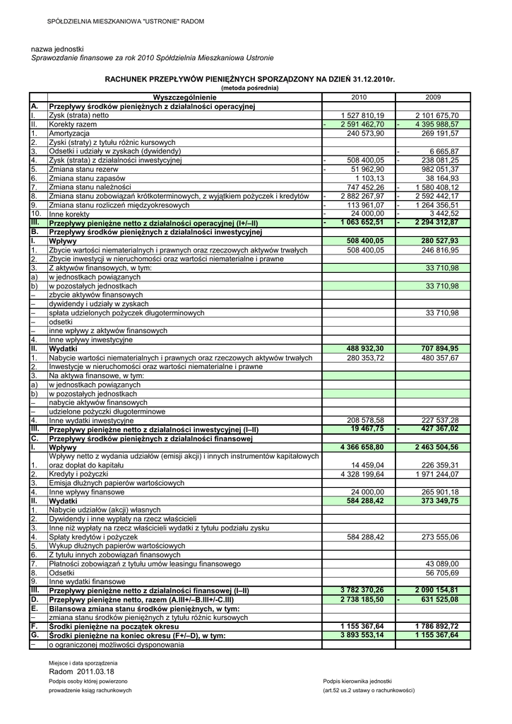 SPÓŁDZIELNIA MIESZKANIOWA "USTRONIE" RADOM nazwa jednostki Sprawozdanie finansowe za rok 2010 Spółdzielnia Mieszkaniowa Ustronie RACHUNEK PRZEPŁYWÓW PIENIĘŻNYCH SPORZĄDZONY NA DZIEŃ 31.12.2010r. (metoda pośrednia) A. I. II. 1. 2. 3. 4. 5. 6. 7. 8. 9. 10. III. B. I. 1. 2. 3. a) b) – – – – – 4. II. 1. 2. 3. a) b) – – 4. III. C. I. 1. 2. 3. 4. II. 1. 2. 3. 4. 5. 6. 7. 8. 9. III. D. E. – F. G. – Wyszczególnienie Przepływy środków pieniężnych z działalności operacyjnej Zysk (strata) netto Korekty razem Amortyzacja Zyski (straty) z tytułu różnic kursowych Odsetki i udziały w zyskach (dywidendy) Zysk (strata) z działalności inwestycyjnej Zmiana stanu rezerw Zmiana stanu zapasów Zmiana stanu należności Zmiana stanu zobowiązań krótkoterminowych, z wyjątkiem pożyczek i kredytów Zmiana stanu rozliczeń międzyokresowych Inne korekty Przepływy pieniężne netto z działalności operacyjnej (I+/–II) Przepływy środków pieniężnych z działalności inwestycyjnej Wpływy Zbycie wartości niematerialnych i prawnych oraz rzeczowych aktywów trwałych Zbycie inwestycji w nieruchomości oraz wartości niematerialne i prawne Z aktywów finansowych, w tym: w jednostkach powiązanych w pozostałych jednostkach zbycie aktywów finansowych dywidendy i udziały w zyskach spłata udzielonych pożyczek długoterminowych odsetki inne wpływy z aktywów finansowych Inne wpływy inwestycyjne Wydatki Nabycie wartości niematerialnych i prawnych oraz rzeczowych aktywów trwałych Inwestycje w nieruchomości oraz wartości niematerialne i prawne Na aktywa finansowe, w tym: w jednostkach powiązanych w pozostałych jednostkach nabycie aktywów finansowych udzielone pożyczki długoterminowe Inne wydatki inwestycyjne Przepływy pieniężne netto z działalności inwestycyjnej (I–II) Przepływy środków pieniężnych z działalności finansowej Wpływy Wpływy netto z wydania udziałów (emisji akcji) i innych instrumentów kapitałowych oraz dopłat do kapitału Kredyty i pożyczki Emisja dłużnych papierów wartościowych Inne wpływy finansowe Wydatki Nabycie udziałów (akcji) własnych Dywidendy i inne wypłaty na rzecz właścicieli Inne niż wypłaty na rzecz właścicieli wydatki z tytułu podziału zysku Spłaty kredytów i pożyczek Wykup dłużnych papierów wartościowych Z tytułu innych zobowiązań finansowych Płatności zobowiązań z tytułu umów leasingu finansowego Odsetki Inne wydatki finansowe Przepływy pieniężne netto z działalności finansowej (I–II) Przepływy pieniężne netto, razem (A.III+/–B.III+/-C.III) Bilansowa zmiana stanu środków pieniężnych, w tym: zmiana stanu środków pieniężnych z tytułu różnic kursowych Środki pieniężne na początek okresu Środki pieniężne na koniec okresu (F+/–D), w tym: o ograniczonej możliwości dysponowania 2010 - - - 1 527 810,19 2 591 462,70 240 573,90 508 400,05 51 962,90 1 103,13 747 452,26 2 882 267,97 113 961,07 24 000,00 1 063 652,51 2009 - - - 508 400,05 508 400,05 2 101 675,70 4 395 988,57 269 191,57 6 665,87 238 081,25 982 051,37 38 164,93 1 580 408,12 2 592 442,17 1 264 356,51 3 442,52 2 294 312,87 280 527,93 246 816,95 33 710,98 33 710,98 33 710,98 488 932,30 280 353,72 208 578,58 19 467,75 707 894,95 480 357,67 - 227 537,28 427 367,02 4 366 658,80 2 463 504,56 14 459,04 4 328 199,64 226 359,31 1 971 244,07 24 000,00 584 288,42 265 901,18 373 349,75 584 288,42 273 555,06 43 089,00 56 705,69 3 782 370,26 2 738 185,50 - 1 155 367,64 3 893 553,14 Miejsce i data sporządzenia Radom 2011.03.18 Podpis osoby której powierzono Podpis kierownika jednostki prowadzenie ksiąg rachunkowych (art.52 us.2 ustawy o rachunkowości) 2 090 154,81 631 525,08 1 786 892,72 1 155 367,64