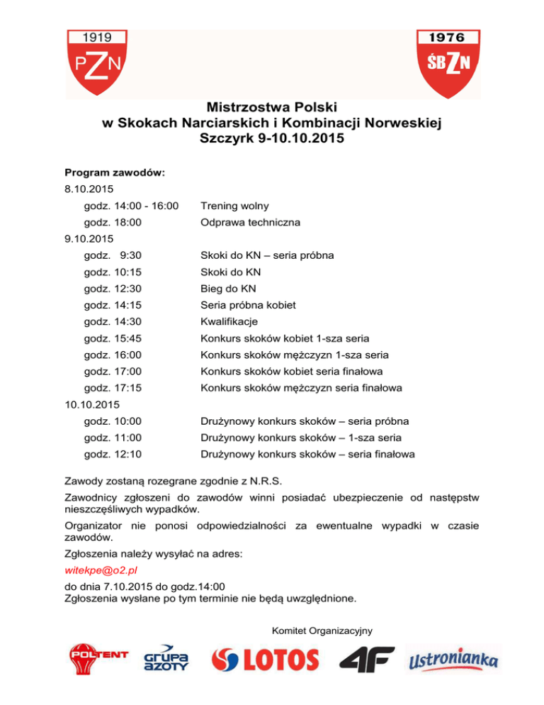 Mistrzostwa Polski w Skokach Narciarskich i Kombinacji Norweskiej Szczyrk 9-10.10.2015 Program zawodów: 8.10.2015 godz. 14:00 - 16:00 Trening wolny godz. 18:00 Odprawa techniczna 9.10.2015 godz. 9:30 Skoki do KN – seria próbna godz. 10:15 Skoki do KN godz. 12:30 Bieg do KN godz. 14:15 Seria próbna kobiet godz. 14:30 Kwalifikacje godz. 15:45 Konkurs skoków kobiet 1-sza seria godz. 16:00 Konkurs skoków mężczyzn 1-sza seria godz. 17:00 Konkurs skoków kobiet seria finałowa godz. 17:15 Konkurs skoków mężczyzn seria finałowa 10.10.2015 godz. 10:00 Drużynowy konkurs skoków – seria próbna godz. 11:00 Drużynowy konkurs skoków – 1-sza seria godz. 12:10 Drużynowy konkurs skoków – seria finałowa Zawody zostaną rozegrane zgodnie z N.R.S. Zawodnicy zgłoszeni do zawodów winni posiadać ubezpieczenie od następstw nieszczęśliwych wypadków. Organizator nie ponosi odpowiedzialności za ewentualne wypadki w czasie zawodów. Zgłoszenia należy wysyłać na adres: [email protected] do dnia 7.10.2015 do godz.14:00 Zgłoszenia wysłane po tym terminie nie będą uwzględnione. Komitet Organizacyjny
