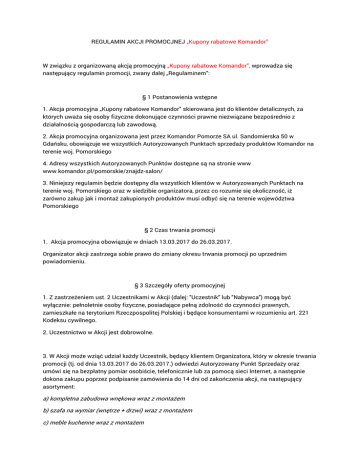 REGULAMIN AKCJI PROMOCJNEJ „Kupony rabatowe Komandor” W związku z organizowaną akcją promocyjną „Kupony rabatowe Komandor”, wprowadza się następujący regulamin promocji, zwany dalej „Regulaminem”: § 1 Postanowienia wstępne 1. Akcja promocyjna „Kupony rabatowe Komandor” skierowana jest do klientów detalicznych, za których uważa się osoby fizyczne dokonujące czynności prawne niezwiązane bezpośrednio z działalnością gospodarczą lub zawodową. 2. Akcja promocyjna organizowana jest przez Komandor Pomorze SA ul. Sandomierska 50 w Gdańsku, obowiązuje we wszystkich Autoryzowanych Punktach sprzedaży produktów Komandor na terenie woj. Pomorskiego 4. Adresy wszystkich Autoryzowanych Punktów dostępne są na stronie www www.komandor.pl/pomorskie/znajdz-salon/ 3. Niniejszy regulamin będzie dostępny dla wszystkich klientów w Autoryzowanych Punktach na terenie woj. Pomorskiego oraz w siedzibie organizatora, przez co rozumie się okoliczność, iż zarówno zakup jak i montaż zakupionych produktów musi odbyć się na terenie województwa Pomorskiego § 2 Czas trwania promocji 1. Akcja promocyjna obowiązuje w dniach 13.03.2017 do 26.03.2017. Organizator akcji zastrzega sobie prawo do zmiany okresu trwania promocji po uprzednim powiadomieniu. § 3 Szczegóły oferty promocyjnej 1. Z zastrzeżeniem ust. 2 Uczestnikami w Akcji (dalej: "Uczestnik" lub "Nabywca") mogą być wyłącznie: pełnoletnie osoby fizyczne, posiadające pełną zdolność do czynności prawnych, zamieszkałe na terytorium Rzeczpospolitej Polskiej i będące konsumentami w rozumieniu art. 221 Kodeksu cywilnego. 2. Uczestnictwo w Akcji jest dobrowolne. 3. W Akcji może wziąć udział każdy Uczestnik, będący klientem Organizatora, który w okresie trwania promocji (tj. od dnia 13.03.2017 do 26.03.2017.) odwiedzi Autoryzowany Punkt Sprzedaży oraz umówi się na bezpłatny pomiar osobiście, telefonicznie lub za pomocą sieci Internet, a następnie dokona zakupu poprzez podpisanie zamówienia do 14 dni od zakończenia akcji, na następujący asortyment: a) kompletna zabudowa wnękowa wraz z montażem b) szafa na wymiar (wnętrze + drzwi) wraz z montażem c) meble kuchenne wraz z montażem 4. Akcją objęte są wyłącznie produkty i zabudowy zaprojektowane w autorskim programie komputerowym firmy Komandor - "Designer". 5. Podstawą uzyskania rabatu jest przekazanie projektantowi podczas podpisywania Zamówienia oryginalnego kuponu rabatowego, który to kupon będzie stanowił załącznik do niniejszego Zamówienia. 6. Kupony rabatowe uprawniające do uzyskania rabatu 200 zł zamieszczone będą w następujących czasopismach: • Avanti: 24.02.2017r. • Wysokie Obcasy Extra: 24.02.2017r. • Logo: 28.02.2017r. • Cztery Kąty: 7.03.2017r. • Kuchnia: 21.03.2017r. • Wysokie Obcasy: 25.03.2017r. 7. Uczestnik biorący udział w Akcji dokonując zakupu produktów opisanych w pkt.3 uzyskuje rabat wynikający z posiadanego kuponu rabatowego, który będzie obliczany zgodnie z postanowieniami pkt. 8. 8. Rabat, z którego korzysta Uczestnik w ramach Akcji Organizator ustala w następujący sposób: a) Rabat przy zakupie szaf i garderób wraz z montażem w wysokości 200 zł za każde wydane 2000zł b) Rabat przy zakupie mebli kuchennych w wysokości 200 zł za każde wydane 5000 zł 9. Za moment nabycia/zakupu uważa się podpisanie Zamówienia na produkty firmy Komandor, o których mowa w pkt. 3. 10. W przypadku zamówienia produktów innych niż wymienione w pkt. 3. Klientowi nie przysługuje uprawnienie do skorzystania z promocji „Kupony rabatowe Komandor”,. Organizator nie dopuszcza także wymiany równowartości kuponu rabatowego na gotówkę. 11. Akcja obowiązuje tylko przy zakupie w systemie gotówkowym jak i ratalnym z tym, że raty muszą zostać objęte ubezpieczeniem. 12. Promocja nie łączy się z innymi akcjami lub promocjami obowiązującymi u Organizatora w okresie obowiązywania niniejszej Akcji. 13. Akcją promocyjną nie są objęte produkty zamówione przez klientów w okresie poprzedzającym akcję promocyjną „Kupony rabatowe Komandor”. 14. Uczestnik traci prawo do korzystania z Akcji, jeżeli spełniony będzie choćby jeden z poniższych warunków: 1) nie dopełni któregokolwiek z warunków wskazanych w niniejszym Regulaminie; 2) dokona montażu produktów zakupionych w ramach Akcji z pominięciem autoryzowanej ekipy montażowej Organizatora, 3) dokona zakupu produktów zakupionych w ramach Akcji poza terytorium województwa Pomorskiego § 4. Dane osobowe 1. Administratorem danych osobowych zebranych podczas niniejszej Akcji jest Komandor Komandor Pomorze SA ul. Sandomierska 50 w Gdańsku, 2. Uczestnicy mają prawo dostępu do treści swoich danych osobowych oraz do ich poprawiania. Podane dane będą przetwarzane w celu realizacji Akcji. Podanie danych osobowych w celu realizacji Akcji jest dobrowolne, choć niezbędne dla prawidłowego przeprowadzenia Akcji. Przetwarzanie danych osobowych obejmuje zakres danych osobowych wskazany w formularzu zgłoszeniowym oraz następujące czynności: zbieranie, utrwalanie, przechowywanie, przetwarzanie, opracowywanie, prostowanie i usuwanie. 3. Dane osobowe będą przetwarzane zgodnie z ustawą z dnia 29 sierpnia 1997 roku o ochronie danych osobowych (tekst jedn. Dz. U. z 2002, Nr 101, poz. 926 z późn. zm.). § 5 REKLAMACJE 1. Wzięcie udziału w Akcji Promocyjnej promocyjną „Kupony rabatowe Komandor”, oznacza zgodę na warunki promocji określone niniejszym Regulaminem. 2.Reklamacje dotyczące spraw związanych z Akcją Promocyjną należy składać do właściwego ze względu na region Organizatora w formie pisemnej wraz z dokładnym opisem reklamacji, z zaznaczeniem, że dotyczy Akcji Promocyjnej „Kupony rabatowe Komandor” w terminie do 14 dni licząc od daty zakończenia Akcji. Reklamacje złożone po upływie 14 dni od daty zakończenia Akcji nie będą rozpatrywane. 3.Organizator rozpatrzy Reklamację