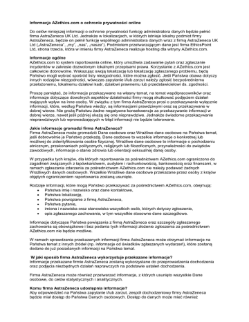 Informacja AZethics.com o ochronie prywatności online Do celów niniejszej informacji o ochronie prywatności funkcję administratora danych będzie pełnić firma AstraZeneca UK Ltd. Jednakże w lokalizacjach, w których istnieje lokalny podmiot firmy AstraZeneca, będzie on pełnił funkcję wspólnego administratora danych wraz z firmą AstraZeneca UK Ltd („AstraZeneca”, „my”, „nas”, „nasze”). Podmiotem przetwarzającym dane jest firma EthicsPoint Ltd, strona trzecia, która w imieniu firmy AstraZeneca realizuje hosting dla witryny AZethics.com. Informacje ogólne AZethics.com to system raportowania online, który umożliwia zadawanie pytań oraz zgłaszanie incydentów w zakresie dozwolonym lokalnymi przepisami prawa. Korzystanie z AZethics.com jest całkowicie dobrowolne. Wskazując swoją lokalizację lub lokalizację zgłaszanego problemu, będą Państwo mogli wybrać spośród listy niezgodności, które można zgłosić. Jeśli Państwa obawa dotyczy innych rodzajów niezgodności, wówczas zapytanie i/lub zarzut należy zgłosić bezpośredniemu przełożonemu, lokalnemu działowi kadr, działowi prawnemu lub przedstawicielowi ds. zgodności. Proszę pamiętać, że informacje przekazywane na własny temat, na temat współpracowników oraz informacje dotyczące dowolnych aspektów działalności firmy mogą skutkować podjęciem działań mających wpływ na inne osoby. W związku z tym firma AstraZeneca prosi o przekazywanie wyłącznie informacji, które, według Państwa wiedzy, są informacjami prawdziwymi oraz są przekazywane w dobrej wierze. Nie grożą Państwu żadne negatywne konsekwencje za przekazywanie informacji w dobrej wierze, nawet jeśli później okażą się one nieprawdziwe. Jednakże świadome przekazywanie nieprawdziwych lub wprowadzających w błąd informacji nie będzie tolerowane. Jakie informacje gromadzi firma AstraZeneca? Firma AstraZeneca może gromadzić Dane osobowe oraz Wrażliwe dane osobowe na Państwa temat, jeśli dobrowolnie je Państwo przekażą. Dane osobowe to wszelkie informacje o konkretnej lub możliwej do zidentyfikowania osobie fizycznej. Wrażliwe dane osobowe to informacje o pochodzeniu etnicznym, przekonaniach politycznych, religijnych lub filozoficznych, przynależności do związków zawodowych, informacje o stanie zdrowia lub orientacji seksualnej danej osoby. W przypadku tych krajów, dla których raportowanie za pośrednictwem AZethics.com ograniczono do zagadnień związanych z łapówkarstwem, audytem i rachunkowością, bankowością oraz finansami, w ramach zgłaszania zdarzenia za pośrednictwem AZethics.com nie należy podawać żadnych Wrażliwych danych osobowych. Wszelkie Wrażliwe dane osobowe przekazane przez osoby z krajów objętych ograniczeniem raportowania zostaną usunięte. Rodzaje informacji, które mogą Państwo przekazywać za pośrednictwem AZethics.com, obejmują: Państwa imię i nazwisko oraz dane kontaktowe, Państwa lokalizację, Państwa powiązanie z firmą AstraZeneca, Państwa pytanie, imiona i nazwiska oraz stanowiska wszystkich osób, których dotyczy zgłoszenie, opis zgłaszanego zachowania, w tym wszystkie stosowne dane szczegółowe. Informacje dotyczące Państwa powiązania z firmą AstraZeneca oraz szczegóły zgłaszanego zachowania są obowiązkowe i bez podania tych informacji złożenie zgłoszenia za pośrednictwem AZethics.com nie będzie możliwe. W ramach sprawdzania przekazanych informacji firma AstraZeneca może otrzymać informacje na Państwa temat z innych źródeł (np. informacje od świadków zgłaszanych wydarzeń), które zostaną dodane do już posiadanych informacji na Państwa temat. W jaki sposób firma AstraZeneca wykorzystuje przekazane informacje? Informacje przekazane firmie AstraZeneca zostaną wykorzystane do przeprowadzenia dochodzenia oraz podjęcia niezbędnych działań naprawczych na podstawie ustaleń dochodzenia. Firma AstraZeneca może również przetwarzać informacje, z których usunięto wszystkie Dane osobowe, do celów statystycznych i analitycznych. Komu firma AstraZeneca udostępnia informacje? Aby odpowiedzieć na Państwa zapytanie i/lub zarzut, zespół dochodzeniowy firmy AstraZeneca będzie miał dostęp do Państwa Danych osobowych. Dostęp do danych może mieć również ograniczona liczba osób z działu prawnego, działu kadr oraz zespołu ds. zgodności firmy AstraZeneca, w zależności od charakteru zapytania/zarzutu. Dostęp do Państwa Danych osobowych będą mieli nieliczni pracownicy firmy EthicsPoint, świadczący usługi wsparcia technicznego i zarządzania zgłoszonymi sprawami. O Państwa zgłoszeniu zostaną powiadomione wszystkie osoby wskazane przez Państwa za pośrednictwem AZethics.com, jednakże nie zostanie im ujawniona Państwa tożsamość, o ile nie wyrazili Państwo na to zgody. Ponadto wszystkie wskazane przez Państwa osoby będą miały prawo do ustosunkowania się do zgłoszonych przez Państwa informacji lub ich poprawienia. Firma AstraZeneca może ujawnić Państwa Dane osobowe w celu spełnienia wymogów prawnych i/lub regulacyjnych i/lub w celu ustanowienia, wykonania lub ochrony praw określonych przepisami prawa. Firma AstraZeneca może również ujawnić Państwa Dane osobowe w innych okolicznościach dozwolonych prawem. Przechowywanie Polityka firmy AstraZeneca zezwala na gromadzenie tylko tych Danych osobowych, które są niezbędne do udzielenia odpowiedzi na Państwa zapytanie i/lub zarzut. Państwa Dane osobowe będą przechowywane przez 6 lat od momentu zamknięcia dochodzenia, o ile lokalne wymogi prawne nie nakładają na firmę AstraZeneca obowiązku ich wcześniejszego lub późniejszego usunięcia. Na przykład w Niemczech, Austrii oraz Francji Państwa Dane osobowe będą przechowywane przez 2 miesiące od momentu zamknięcia dochodzenia. Dostęp, poprawianie i zgłaszanie zapytań Jeśli jest to wymagane przepisami prawa, firma AstraZeneca zapewni Państwu możliwoś