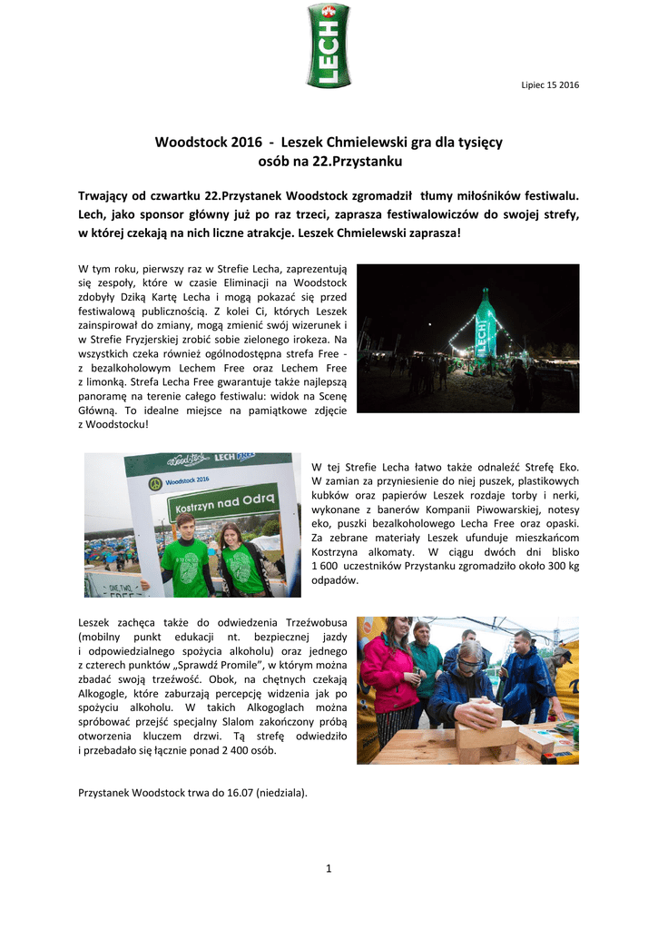 Lipiec 15 2016 Woodstock 2016 - Leszek Chmielewski gra dla tysięcy osób na 22.Przystanku Trwający od czwartku 22.Przystanek Woodstock zgromadził tłumy miłośników festiwalu. Lech, jako sponsor główny już po raz trzeci, zaprasza festiwalowiczów do swojej strefy, w której czekają na nich liczne atrakcje. Leszek Chmielewski zaprasza! W tym roku, pierwszy raz w Strefie Lecha, zaprezentują się zespoły, które w czasie Eliminacji na Woodstock zdobyły Dziką Kartę Lecha i mogą pokazać się przed festiwalową publicznością. Z kolei Ci, których Leszek zainspirował do zmiany, mogą zmienić swój wizerunek i w Strefie Fryzjerskiej zrobić sobie zielonego irokeza. Na wszystkich czeka również ogólnodostępna strefa Free z bezalkoholowym Lechem Free oraz Lechem Free z limonką. Strefa Lecha Free gwarantuje także najlepszą panoramę na terenie całego festiwalu: widok na Scenę Główną. To idealne miejsce na pamiątkowe zdjęcie z Woodstocku! W tej Strefie Lecha łatwo także odnaleźć Strefę Eko. W zamian za przyniesienie do niej puszek, plastikowych kubków oraz papierów Leszek rozdaje torby i nerki, wykonane z banerów Kompanii Piwowarskiej, notesy eko, puszki bezalkoholowego Lecha Free oraz opaski. Za zebrane materiały Leszek ufunduje mieszkańcom Kostrzyna alkomaty. W ciągu dwóch dni blisko 1 600 uczestników Przystanku zgromadziło około 300 kg odpadów. Leszek zachęca także do odwiedzenia Trzeźwobusa (mobilny punkt edukacji nt. bezpiecznej jazdy i odpowiedzialnego spożycia alkoholu) oraz jednego z czterech punktów „Sprawdź Promile”, w którym można zbadać swoją trzeźwość. Obok, na chętnych czekają Alkogogle, które zaburzają percepcję widzenia jak po spożyciu alkoholu. W takich Alkogoglach można spróbować przejść specjalny Slalom zakończony próbą otworzenia kluczem drzwi. Tą strefę odwiedziło i przebadało się łącznie ponad 2 400 osób. Przystanek Woodstock trwa do 16.07 (niedziala). 1 Lipiec 15 2016 Więcej na www.leszeknawoodstocku.pl Więcej informacji udzielą: Klaudyna Polanowska Skrzypek kierownik ds. public relations Kompania Piwowarska Mail: [email protected] Kom. +48 695 592 926 Dominika Karoń Tailor Made PR Mail: [email protected] Kom.: +48 731 870 402 *** Kompania Piwowarska Kompania Piwowarska skupia trzy browary o wieloletniej historii: Tyskie Browary Książęce (rok założenia - 1629), Browar Dojlidy w Białymstoku (1768) i Lech Browary Wielkopolski w Poznaniu (1895). To w nich warzymy najchętniej wybierane przez Polaków piwa, między innymi: Żubra, Tyskie, Lecha, Dębowe, Redd'sa oraz kolekcję specjalności Książęcego. Sprawdzone receptury, naturalne składniki, nieskazitelna czystość w naszych browarach a przede wszystkim umiejętności doświadczonych piwowarów - to wszystko sprawia, że warzone przez nas piwa są cenione w Polsce i za granicą. Jesteśmy częścią międzynarodowej grupy piwowarskiej SABMiller; wspólnie troszczymy się o ludzi i środowisko wokół nas. Realizując strategię „Postaw na piwo” promujemy odpowiedzialność i umiarkowanie w spożywaniu alkoholu, szkolimy sprzedawców, oszczędzamy wodę i energię, wspieramy rozwój naszych partnerów biznesowych i angażujemy się w wolontariat. Mamy zaszczyt być sponsorem Polskiej Reprezentacji Olimpijskiej 2