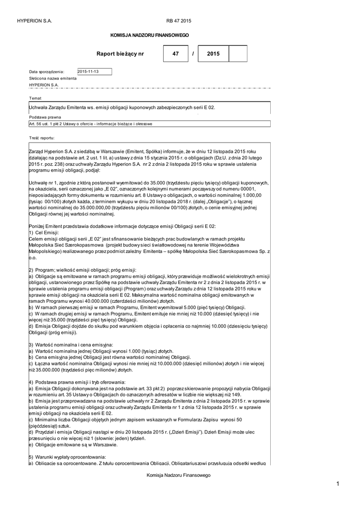 HYPERION S.A. RB 47 2015 KOMISJA NADZORU FINANSOWEGO Raport bie żący nr Data sporządzenia: 47 / 2015 2015-11-13 Skrócona nazwa emitenta HYPERION S.A. Temat Uchwała Zarządu Emitenta ws. emisji obligacji kuponowych zabezpieczonych serii E 02. Podstawa prawna Art. 56 ust. 1 pkt 2 Ustawy o ofercie - informacje bieżące i okresowe Treść raportu: Zarząd Hyperion S.A. z siedzibą w Warszawie (Emitent, Spółka) informuje, że w dniu 12 listopada 2015 roku działając na podstawie art. 2 ust. 1 lit. a) ustawy z dnia 15 stycznia 2015 r. o obligacjach (Dz.U. z dnia 20 lutego 2015 r. poz. 238) oraz uchwały Zarządu Hyperion S.A. nr 2 z dnia 2 listopada 2015 roku w sprawie ustalenia programu emisji obligacji, podjął: Uchwałę nr 1, zgodnie z którą postanowił wyemitować do 35.000 (trzydziestu pięciu tysięcy) obligacji kuponowych, na okaziciela, serii oznaczonej jako „E 02”, oznaczonych kolejnymi numerami począwszy od numeru 00001, nieposiadających formy dokumentu w rozumieniu art. 8 Ustawy o obligacjach, o wartości nominalnej 1.000,00 (tysiąc 00/100) złotych każda, z terminem wykupu w dniu 20 listopada 2018 r. (dalej „Obligacje”), o łącznej wartości nominalnej do 35.000.000,00 (trzydziestu pięciu milionów 00/100) złotych, o cenie emisyjnej jednej Obligacji równej jej wartości nominalnej. Poniżej Emitent przedstawia dodatkowe informacje dotyczące emisji Obligacji serii E 02: 1) Cel Emisji: Celem emisji obligacji serii „E 02” jest sfinansowanie bieżących prac budowlanych w ramach projektu Małopolska Sieć Szerokopasmowa (projekt budowy sieci światłowodowej na terenie Województwa Małopolskiego) realizowanego przez podmiot zależny Emitenta – spółkę Małopolska Sieć Szerokopasmowa Sp. z o.o. 2) Program; wielkość emisji obligacji; próg emisji: a) Obligacje są emitowane w ramach programu emisji obligacji, który przewiduje możliwość wielokrotnych emisji obligacji, ustanowionego przez Spółkę na podstawie uchwały Zarządu Emitenta nr 2 z dnia 2 listopada 2015 r. w sprawie ustalenia programu emisji obligacji (Program) oraz uchwały Zarządu z dnia 12 listopada 2015 roku w sprawie emisji obligacji na okaziciela serii E 02. Maksymalna wartość nominalna obligacji emitowanych w ramach Programu wynosi 40.000.000 (czterdzieści milionów) złotych. b) W ramach pierwszej emisji w ramach Programu, Emitent wyemitował 5.000 (pięć tysięcy) Obligacji. c) W ramach drugiej emisji w ramach Programu, Emitent emituje nie mniej niż 10.000 (dziesięć tysięcy) i nie więcej niż 35.000 (trzydzieści pięć tysięcy) Obligacji. d) Emisja Obligacji dojdzie do skutku pod warunkiem objęcia i opłacenia co najmniej 10.000 (dziesięciu tysięcy) Obligacji (próg emisji). 3) Wartość nominalna i cena emisyjna: a) Wartość nominalna jednej Obligacji wynosi 1.000 (tysiąc) złotych. b) Cena emisyjna jednej Obligacji jest równa wartości nominalnej Obligacji. c) Łączna wartość nominalna Obligacji wynosi nie mniej niż 10.000.000 (dziesięć milionów) złotych i nie więcej niż 35.000.000 (trzydzieści pięc milionów) złotych. 4) Podstawa prawna emisji i tryb oferowania: a) Emisja Obligacji dokonywana jest na podstawie art. 33 pkt 2) poprzez skierowanie propozycji nabycia Obligacji w rozumieniu art. 35 Ustawy o Obligacjach do oznaczonych adresatów w liczbie nie większej niż 149. b) Emisja jest przeprowadzana na podstawie uchwały nr 2 Zarządu Emitenta z dnia 2 listopada 2015 r. w sprawie ustalenia programu emisji obligacji oraz uchwały Zarządu Emitenta nr 1 z dnia 12 listopada 2015 r. w sprawie emisji obligacji na okaziciela serii E 02. c) Minimalna liczba Obligacji objętych jednym zapisem wskazanych w Formularzu Zapisu wynosi 50 (pięćdziesiąt) sztuk. d) Przydział i emisja Obligacji nastąpi w dniu 20 listopada 2015 r. („Dzień Emisji”). Dzień Emisji może ulec przesunięciu o nie więcej niż 1 (słownie: jeden) tydzień. e) Obligacje emitowane są w Warszawie. 5) Warunki wypłaty oprocentowania: a) Obligacje są oprocentowane. Z tytułu oprocentowania Obligacji, Obligatariuszowi przysługują odsetki według Komisja Nadzoru Finansowego 1 HYPERION S.A. RB 47 2015 a) Obligacje są oprocentowane. Z tytułu oprocentowania Obligacji, Obligatariuszowi przysługują odsetki według stałej stopy procentowej, („Odsetki”) płatne od Dnia Emisji, co trzy miesiące („Okres Odsetkowy”) na ostatni dzień każdego Okresu Odsetkowego. b) Oprocentowanie obligacji wynosi 8% w skali roku. 6) Zabezpieczenie Obligacji: Docelowo zabezpieczeniem emisji obligacji będzie zastaw rejestrowy na infrastrukturze światłowodowej służącej do przesyłu danych należącej do Małopolskiej Sieci Szerokopasmowej Sp. z o.o., ustanowiony do najwyższej sumy zabezpieczenia równej 200% wartości Emisji, a także zastaw rejestrowy na 100% udziałów Małopols kiej Sieci Szerokopasmowej Sp. z o.o. w maksymalnej wysokości do 200% objętych i zapłaconych obligacji. Do czasu ustanowienia docelowego zabezpieczenia w postaci zastawu rejestrowego obligacje będą zabezpieczone poprzez: (i) poręczenie majątkowe udzielone przez Prezesa Zarządu Spółki Piotra Majchrzaka wraz z oświadczeniem złożonym przez pana Piotra Majchrzaka w formie aktu notarialnego o poddaniu się egzekucji w trybie art. 777 § 1 pkt 5 kodeksu postępowania cywilnego z tytułu poręczenia, (ii) poręczenie udzielone przez spółkę zależną Małopolska Sieć Szerokopasmowa Sp. z o.o. („MSS”), w której Emitent posiada 12.385 (dwanaście tysięcy trzysta osiemdziesiąt pięć) udziałów o wartości nominalnej 1.000 (jeden tysiąc) złotych każdy, stanowiących 100% kapitału zakładowego i głosów na Zgromadzeniu Wspólników MSS, wraz z oświadczeniem złożonym przez MSS w formie aktu notarialnego o poddaniu się egzekucji w trybie art. 777 § 1 pkt 5 kodeksu postępowania cywilnego z tytułu poręczenia. Ponadto przez cały okres trwania emisji obligacje będą zabezpieczone