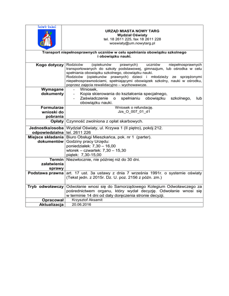 URZĄD MIASTA NOWY TARG Wydział Oświaty tel. 18 2611 225, fax 18 2611 228 [email protected] Transport niepełnosprawnych uczniów w celu spełniania obowiązku szkolnego i obowiązku nauki. Kogo dotyczy Rodziców Wymagane dokumenty (opiekunów prawnych) uczniów niepełnosprawnych transportowanych do szkoły podstawowej, gimnazjum, lub ośrodka w celu spełniania obowiązku szkolnego, obowiązku nauki. Rodziców (opiekunów prawnych) dzieci i młodzieży ze sprzężonymi niepełnosprawnościami, spełniającymi obowiązek szkolny, nauki w ośrodku, poprzez zajęcia rewalidacyjno – wychowawcze. - Wniosek, Kopia skierowania do kształcenia specjalnego, Zaświadczenie o spełnianiu obowiązku szkolnego, obowiązku nauki. lub Wniosek o refundację. Formularze Jzs_O_007_01_d1 wnioski do pobrania Opłaty Czynność zwolniona z opłat skarbowych. Jednostka/osoba odpowiedzialna Miejsce składania dokumentów Wydział Oświaty, ul. Krzywa 1 (II piętro), pokój 212. tel. 2611 226 Biuro Obsługi Mieszkańca, pok. nr 1 (parter). Godziny pracy Urzędu: poniedziałek: 7,30 – 16,00 wtorek – czwartek: 7,30 – 15,30 piątek: 7,30-15,00 Termin Niezwłocznie, nie później niż do 30 dni. załatwienia sprawy Podstawa prawna art. 17 ust. 3a ustawy z dnia 7 września 1991r. o systemie oświaty (Tekst jedn. z 2015r. Dz. U. poz. 2156 z późn. zm.) Tryb odwoławczy Odwołanie wnosi się do Samorządowego Kolegium Odwoławczego za pośrednictwem organu, który wydał decyzję. Odwołanie wnosi się w terminie 14 dni od daty doręczenia stronie decyzji. Krzysztof Aksamit Opracował 20.06.2016 Aktualizacja