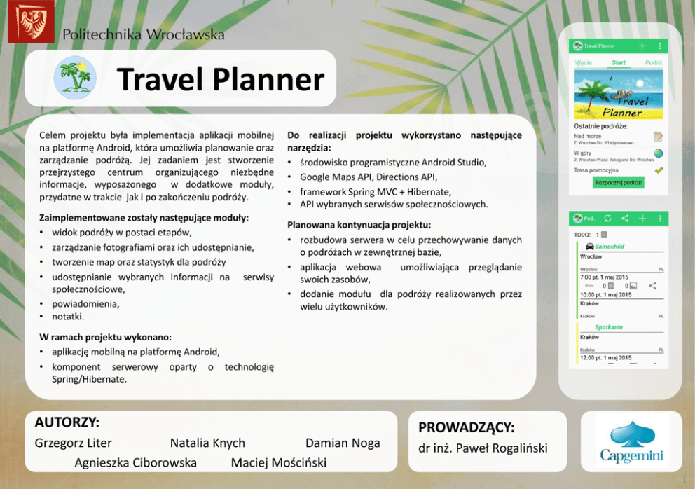 Travel Planner Celem projektu była implementacja aplikacji mobilnej na platformę Android, która umożliwia planowanie oraz zarządzanie podróżą. Jej zadaniem jest stworzenie przejrzystego centrum organizującego niezbędne informacje, wyposażonego w dodatkowe moduły, przydatne w trakcie jak i po zakończeniu podróży. Do realizacji projektu wykorzystano następujące narzędzia: • środowisko programistyczne Android Studio, • Google Maps API, Directions API, • framework Spring MVC + Hibernate, • API wybranych serwisów społecznościowych. Zaimplementowane zostały następujące moduły: • widok podróży w postaci etapów, • zarządzanie fotografiami oraz ich udostępnianie, • tworzenie map oraz statystyk dla podróży • udostępnianie wybranych informacji na serwisy społecznościowe, • powiadomienia, • notatki. Planowana kontynuacja projektu: • rozbudowa serwera w celu przechowywanie danych o podróżach w zewnętrznej bazie, • aplikacja webowa umożliwiająca przeglądanie swoich zasobów, • dodanie modułu dla podróży realizowanych przez wielu użytkowników. W ramach projektu wykonano: • aplikację mobilną na platformę Android, • komponent serwerowy oparty o technologię Spring/Hibernate. AUTORZY: PROWADZĄCY: Grzegorz Liter Natalia Knych Damian Noga Agnieszka Ciborowska Maciej Mościński dr inż. Paweł Rogaliński 1