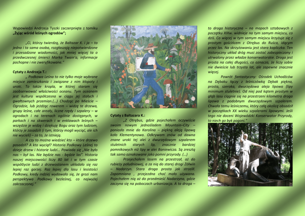 Wypowiedzi Andrzeja Tyszki zaczerpnięte z tomiku „Żyjąc wśród leśnych ogrodów”; „Ci, którzy twierdzą, że Baltazar K. i ja – to jedna i ta sama osoba, rozgłaszają niepotwierdzone i przesadzone wiadomości, jak mniej więcej ta o przedwczesnej śmierci Marka Twain’a, informacje pochopne i nie zweryfikowane.” Cytaty z Andrzeja T.: „ Podkowa Leśna to nie tylko moje wybrane miejsce zamieszkania i związane z nim kłopoty i uroki. To także kropla, w której staram się zaobserwować właściwości oceanu. Tym oceanem jest kultura współczesna w ciągu jej stałych i gwałtownych przemian.(…) Chodząc po Mieście – Ogrodzie, lub jeżdżąc rowerem – widzę te drzewa, grupy leśne, całe areały, liczne rzędy i szpalery – w ogrodach i na terenach ogólnie dostępnych, w parkach i na skwerach i w enklawach leśnych – wszędzie je widzę i dziękuję Bogu oraz tym ludziom, którzy je zasadzili (i tym, którzy mogli wyciąć, ale ich nie wycieli) – za to, że istnieją. A czy to można wiedzieć kto – które drzewo posadził? A kto wyciął? Historia Podkowy Leśnej to dzieje drzew i historie ludzi… Powiada się „Nie było nas – był las. Nie będzie nas - będzie las”. Historia naszej miejscowości liczy 80 lat i w tym czasie współżycie ludzi z drzewostanem układało się raz lepiej raz gorzej. Raz lepiej dla lasu i lesistości Podkowy, kiedy indziej wydawało się, że grozi nam perspektywa Podkowy bezleśnej, co najwyżej zakrzaczonej.” Cytaty z Baltazara K.: „Z Otrębus, gdzie pojechałem oczywiście swoim nowym jednośladem Mountain–City – poniosło mnie do Karolina – piękną aleją lipową koło Klementynowa. Odkrywam znów od dawna znane uroki tej alei z dwurzędowym szpalerem stuletnich starych lip, znacznie bardziej pomnikowych niż lipy w alei Baniewicza. Są zresztą tak samo oznakowane jako pomni przyrody. (…) Przejechałem lasem na przestrzał, aż do rubieży południowej, a za nią do starej drogi Żółwin – Nadarzyn. Stara droga prosta jak strzelił. Zapomniana , przejezdna choć mało używana. Pojechałem nią aż do przedmieść Nadarzyna, gdzie zaczyna się na poboczach urbanizacja. A ta droga – to droga historyczna – na mapach sztabowych z początku XIXw. widnieje na tym samym miejscu, co dziś. Co więcej w tym samym miejscu krzyżuje się z prostym gościńcem z Otrębus do Ruśca, idącym przez las. Na skrzyżowaniu jest stara kapliczka. Ten historyczny układ dróg musi zostać zabezpieczony i utrwalony przez władze konserwatorskie. Droga jest prosta na całej długości, co oznacza, że liczy sobie nie dwieście lub trzysta lat, ale zapewne znacznie więcej. Powrót fantastyczny: Ośrodek Uchodźców na Dębaku łączy z leśniczówką Dębak piękna, prosta, szeroka, dwurzędowa aleja lipowa (lipy minimum stuletnie). Od niej pod kątem prostym w głąb lasu ciągnie się na przestrzeni kilometra droga lipowa z podobnym dwurzędowym szpalerem. Chwała temu leśniczemu, który całą okolicę obsadził w początkach XX wieku szpalerami lipowymi. Jeśli tego nie doceni Wojewódzki Konserwator Przyrody, to niech go byk pogoni.”
