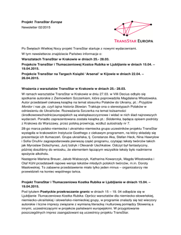 Projekt TransStar Europa Newsletter 02/2015 Po Świętach Wielkiej Nocy projekt TransStar startuje z nowymi wydarzeniami. W tym newsletterze znajdziecie Państwo informacje o: Warsztatach TransStar w Krakowie w dniach 25.- 28.03. Projekcie TransStar i Tłumaczeniowej Kostce Rubika w Ljubljianie w dniach 15.04. – 19.04.2015. Projekcie TransStar na Targach Książki ‘Arsenal’ w Kijowie w dniach 22.04. – 26.04.2015. Wrażenia z warsztatów TransStar w Krakowie w dniach 25.- 28.03. W ramach warsztatów TransStar w Krakowie w dniu 27.03. w Villi Decius odbyło się spotkanie autorskie z Ziemowitem Szczerkiem, które poprowadziła Magdalena Włostowska. Autor przedstawił ciekawą książkę na temat stosunku Polaków do Ukrainy, pt.: Przyjdzie Mordor i nas zje, czyli tajna historia Słowian. Traktuje ona o stereotypach Polaków w odniesieniu do Ukraińców. Rozważania Szczerka na temat tożsamości (środkowowschodnio)europejskich są wielopłaszczyznowe i widać w nich ślad najnowszych wydarzeń. Ponadto zaprezentowana została książka pt.: Siódemka, będąca opisem podróży z Krakowa do Warszawy, przez polską prowincję, wzdłuż autostrady nr 7. 28-go marca polsko-niemiecka i ukraińsko-niemiecka grupa uczestników projektu TransStar wystąpiła w krakowskim Instytucie Goethego z ciekawym programem, na który składały się prezentacje ich tłumaczeń. Grupa ukraińska, tj. Constanze Aka, Stefan Heck, Nina Hawrylow i Sofia Onufriv zagospodarowała pierwszą część programu, czytając teksty twórców takich jak Myroslaw Dotschynez, Jurij Izdryk i Olexandr Uschkalow. Odczyt był fantastyczny, później doszliśmy do wniosku, że elementem łączącym wszystkie teksty było nadmierne spożycie alkoholu. Następnie Marlena Breuer, Jakob Walosczyk, Katharina Kowarczyk, Magda Wlostowska i Olaf Kühl przedstawili rapowe wersje tekstów młodych polskich twórców, m.in. Doroty Masłowskiej. To zabawne przedstawienie miało tylko jeden minus – organizatorzy nie przewidzieli na koniec wspólnego tańca. Projekt TransStar i Tłumaczeniowa Kostka Rubika w Ljubljianie w dniach 15.04. – 19.04.2015. Pod tytułem Poetyckie przekraczanie granic w dniach 15 – 19. 04 odbędzie się w Ljubljianie Tłumaczeniowa Kostka Rubika. Oprócz warsztatów dla niemiecko-słoweńskiej, niemiecko-ukraińskiej i słoweńsko-niemieckiej grupy, w programie znalazły się też wieczory autorskie i liczne imprezy związane z wymianą literacką i kulturową pomiędzy Słowenią a innymi, uczestniczącymi w projekcie państwami europejskimi. W przygotowanie poszczególnych imprez zaangażowani są uczestnicy projektu TransStar. Imprezę rozpocznie zaplanowane na środę, 15.04 wydarzenie zatytułowane „szachermacher”, podczas którego uczestnicy projektu TransStar będą doszukiwać się podobieństw i różnic w językach słoweńskim i ukraińskim. 16-go kwietnia na Uniwersytecie w Ljubljanie zostanie otwarta wystawa pt.: Camera Obscura – miejsca przekładu literackiego. Ponadto w programie m. in. spotkanie z ukraińskim autorem Ostrapem Slyvynskym i Josefem Winklerem, spotkanie informacyjne na temat słoweńskiego rynku książki, literacki spacer po mieście i koncert grupy Jazzy.si. Dokładne informacje dotyczące wszystkich imprez znajdują się na stronie http://transstareuropa.com/ubersetzungswurfel-kommt-im-april-2015-nach-ljubljana/. Projekt TransStar na Targach Książki ‘Arsenal’ w Kijowie w dniach 22.04. – 26.04.2015. Projekt TransStar Europa zaprezentuje się na Targach Książki ‘Arsenal’ w Kijowie w dniach 22.04. – 26.04.2015. Zobaczyć będzie można performance w wykonaniu Ulrike Almut Sandig oraz wystawę Camera Obscura – miejsca przekładu literackiego. Ulrike Almut Sandig wystąpi 23.04. razem z Hryhoryjem Semenchukiem w ramach Nocy z poezją. Prezentowane teksty zostały przetłumaczone przez uczestników projektu TransStar. 24-go kwietnia odbędzie się otwarcie wystawy pt.: Camera Obscura – miejsca przekładu literackiego. Przy tej okazji ukraińscy uczestnicy projektu TransStar przedstawią wraz z wydawnictwem Krytyka swoje tłumaczenia i zapowiedzą mającą ukazać się w sierpniu publikację. Aktualne informacje dotyczące tłumaczeń, projektu TransStar Europa oraz Tłumaczeniowej Kostki Rubika znajdziecie Państwo na stronie internetowej projektu www.transstareuropa.com Projekt współfinansowany ze środków programu Unii Europejskiej „Lifelong Learning” Projekt Tłumaczeniowa Kostka Rubika jest współfinansowany przez: oraz