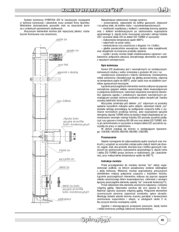 System kominowy HYBRYDA IZO to rewolucyjne rozwiązanie w technice kominowej i absolutnie nowy produkt firmy Spiroflex. Wieloletnie doświadczenie pozwoliło nam na stworzenie komina o unikalnych parametrach użytkowych. Kluczowym elementem komina jest najwyższej jakości, izostatycznie formowana rura ceramiczna. Najważniejsze właściwości nowego systemu: – uniwersalność, odpowiedni do kotłów gazowych, olejowych i na paliwa stałe, do kotłów nisko- i wysokotemperaturowych; – możliwość współpracy z kotłami z zamkniętą komorą spalania oraz z kotłami kondensacyjnymi po zastosowaniu wyposażenia opcjonalnego tj. złączki turbo mocowanej wewnątrz odnogi trójnika IZO i wymianie dekla IZO na dekiel IZO TURBO w wyczystce; – maksymalna temperatura spalin 600°C; – odporność na pożar sadzy; – cienkościenna rura ceramiczna o długości 1m i 0,66m; – gładka powierzchnia wewnętrzna, bardzo niska nasiąkliwość oraz obojętność na kwasowe produkty spalania; – szybki i prosty montaż dzięki zredukowanemu ciężarowi i unikatowemu połączeniu płaszcza zewnętrznego elementów na opaski z wpustami wewnętrznymi. Opis techniczny Komin IZO zbudowany jest z wewnętrznych rur izostatycznych, izolowanych otuliną z wełny mineralnej o grubości 40 mm i rur zewnętrznych wykonanych z blachy nierdzewnej. Cienkościenny wkład ceramiczny charakteryzuje się gładką powierzchnią, odporną na temperaturę spalin do 600°C, pożar sadzy oraz na działanie czynników agresywnych korozyjnie. Łączenie poszczególnych elementów komina odbywa się poprzez wewnętrzne spajanie wkładu ceramicznego kitem kwasoodpornym w połączeniu kielichowym, natomiast zespolenie zewnętrzne elementów zapewnia opaska z unikatowymi wpustami wewnętrznymi pozwalającymi uzyskać zarówno swobodny spływ skroplin jak i bardzo wysoką stabilność konstrukcji. Wyczystka zamknięta jest deklem „izo” odpornym na produkty spalania wszystkich rodzajów paliw stałych, natomiast trójnik „izo” posiada odnogę pozwalającą na podłączenie czopucha kotła o wymiarze nominalnym przekroju komina. Jako wyposażenie opcyjnie oferujemy złączkę TURBO która na każdym etapie eksploatacji po zamontowaniu wewnątrz odnogi trójnika IZO pozwala szczelnie podłączyć rury gazowe o średnicy 60 i 80 mm oraz dekiel IZO TURBO, który po zamontowaniu w wyczystce w miejsce dekla IZO uszczelnia wyczystkę do pracy w nadciśnieniu. W ofercie znajdują się kominy w następującym typoszeregu: 120/200,140/220,160/240,180/260 i 200/280. Przeznaczenie Idealne rozwiązanie do odprowadzania spalin (suchych oraz mokrych) z urządzeń na wszystkie rodzaje paliw stałych takich jak drewno, węgiel, miał, eko-groszek, biomasa oraz z kotłów gazowych i olejowych po zastosowaniu wyposażenia opcjonalnego tj. złączki turbo i dekla IZO TURBO (praca zarówno w nadciśnieniu, jak i podciśnieniu), przy maksymalnej temperaturze spalin do 600 °C. Instrukcja montażu Przed przystąpieniem do montażu komina “izo” należy wypoziomować podłoże, na którym posadowiony zostanie odskraplacz z płytą kotwową. Właściwy montaż poprzedzamy precyzyjnym określeniem miejsca połączenia czopucha z trójnikiem komina. Łączenie poszczególnych elementów odbywa się poprzez spajanie wkładu ceramicznego kitem kwasoodpornym, natomiast z zewnątrz łączymy poszczególne elementy opaską “izo” (warunek konieczny!!!). Przed nałożeniem kitu elementy ceramiczne odpylamy i zwilżamy wilgotną gąbką. Optymalna warstwa dla w/w spoiwa to 3mm. Nadmiar zaprawy usuwamy wilgotną gąbką. Połączenie elementów ceramicznych powinno zapewniać swobodny spływ skroplin. Montując kolejne odcinki komina musimy pamiętać o konieczności montowania wsporników i obejm, w odstępach około 2 m. Na szczycie komina montujemy ustnik. Zgodnie z obowiązującymi przepisami prawnymi, każdy komin i wkład kominowy podlega odbiorowi kominiarskiemu. 65 NAZWA WYROBU SYMBOL RURA IZO o d∏ugoÊci SX-KI.../...R SX-KI.../...R0,66 L1=1 mb L2=0,66 mb Zastosowanie: służy do budowania komina IZO o żądanej długości Średnica komina Ø120/200 Tabela wymiarów Ø140/220 Ø160/240 Ø180/260 Ø200/280 d [mm] 120 140 160 180 200 D [mm] 200 220 240 260 280 TRÓJNIK IZO 90O SX-KI.../...T90 Zastosowanie: służy do połączenia czopucha z kominem IZO pod kątem 90O Średnica komina 66 Ø120/200 Tabela wymiarów Ø140/220 Ø160/240 Ø180/260 Ø200/280 d [mm] 120 140 160 180 200 D [mm] 200 220 240 260 280 NAZWA WYROBU SYMBOL WYCZYSTKA IZO SX-KI.../...WCZ Zastosowanie: umożliwia dostęp do wnętrza komina IZO w celu kontroli zanieczyszczeń Ø140/220 Ø160/240 Ø180/260 Ø200/280 d [mm] 120 140 160 180 200 D [mm] 200 220 240 260 280 d1 [mm] 120 120 160 160 160 Średnica komina Ø120/200 Tabela wymiarów DEKIEL IZO SX-KI.../...D Zastosowanie: zamknięcie wyczystki IZO odporne na produkty spalania wszystkich rodzajów paliw Ø140/220 Ø160/240 Ø180/260 d [mm] 120 120 160 160 160 D [mm] 140 140 180 180 180 Średnica komina Ø120/200 Tabela wymiarów Ø200/280 67 NAZWA WYROBU SYMBOL DEKIEL IZO TURBO SX-KI.../...DT Zastosowanie: zamknięcie wyczystki IZO odporne na produkty spalania gazu w kominie IZO TURBO Średnica komina Ø120/200 Tabela wymiarów Ø140/220 Ø160/240 Ø180/260 Ø200/280 d [mm] 120 120 160 160 160 D [mm] 140 140 180 180 180 ODSKRAPLACZ IZO SX-KI.../...O Zastosowanie: służy do odprowadzania kondensatu z wnętrza komina IZO oraz do posadowienia komina Średnica komina A [mm] Ø120/200 264 Tabela wymiarów Ø140/220 Ø160/240 Ø180/260 Ø200/280 264 264 275 315 OPASKA IZO SX-KI.../...OP Zastosowanie: służy do zewnętrznego spinania elementów komina IZO Średnica komina D [mm] 68 Ø120/200 200 Tabela wymiarów Ø140/220 Ø160/240 Ø180/260 Ø200/280 220 240 260 280 NAZWA WYROBU SYMBOL USTNIK IZO SX-KI.../...U Zastosowanie: górne zakończenie komina IZO Średnica komina Ø120/200 D [mm] 200 Tabela wymiarów Ø140/220 Ø1