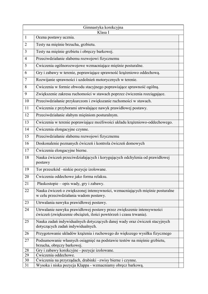 Gimnastyka korekcyjna Klasa I 1 Ocena postawy ucznia. 2 Testy na mięśnie brzucha, grzbietu. 3 Testy na mięśnie grzbietu i obręczy barkowej. 4 Przeciwdziałanie słabemu rozwojowi fizycznemu 5 Ćwiczenia ogólnorozwojowe wzmacniające mięśnie posturalne. 6 Gry i zabawy w terenie, poprawiające sprawność krążeniowo oddechową. 7 Rozwijanie sprawności i uzdolnień motorycznych w terenie. 8 Ćwiczenia w formie obwodu stacyjnego poprawiające sprawność ogólną. 9 Zwiększenie zakresu ruchomości w stawach poprzez ćwiczenia rozciągające. 10 Przeciwdziałanie przykurczom i zwiększanie ruchomości w stawach. 11 Ćwiczenia z przyborami utrwalające nawyk prawidłowej postawy. 12 Przeciwdziałanie słabym mięśniom posturalnym. 13 Ćwiczenia w terenie poprawiające możliwości układu krążeniowo-oddechowego. 14 Ćwiczenia elongacyjne czynne. 15 Przeciwdziałanie słabemu rozwojowi fizycznemu 16 Doskonalenie poznanych ćwiczeń i kontrola ćwiczeń domowych 17 Ćwiczenia elongacyjne bierne. 18 Nauka ćwiczeń przeciwdziałających i korygujących odchylenia od prawidłowej postawy 19 Tor przeszkód –niskie pozycje izolowane. 20 Ćwiczenia oddechowe jako forma relaksu. 21 Płaskostopie – opis wady, gry i zabawy. 22 Nauka ćwiczeń o zwiększonej intensywności, wzmacniających mięśnie posturalne w celu przeciwdziałania wadom postawy. 23 Utrwalania nawyku prawidłowej postawy. 24 Utrwalanie nawyku prawidłowej postawy przez zwiększenie intensywności ćwiczeń (zwiększenie obciążeń, ilości powtórzeń i czasu trwania). 25 Nauka zadań indywidualnych dotyczących danej wady oraz ćwiczeń stacyjnych dotyczących zadań indywidualnych. 26 Przygotowanie układów krążenia i ruchowego do większego wysiłku fizycznego 27 Podsumowanie własnych osiągnięć na podstawie testów na mięśnie grzbietu, brzucha, obręczy barkowej. Gry i zabawy korekcyjne - pozycje izolowane. Ćwiczenia oddechowe. Ćwiczenia na przyrządach, drabinki –zwisy bierne i czynne. Wysoka i niska pozycja Klappa - wzmacniamy obręcz barkową. 28 29 30 31 32 33 34 35 36 Ćwiczenia wzmacniające mięśnie ściągające łopatki. Gry i zabawy – dbamy o bezpieczeństwo swoje i kolegów. Utrwalamy nawyk prawidłowej postawy. Gry i zabawy siłowe. Lekcje rezerwowe.