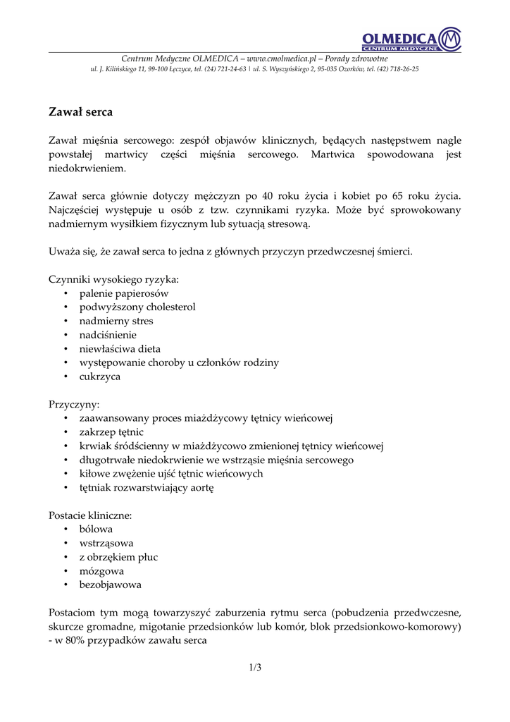 Centrum Medyczne OLMEDICA – www.cmolmedica.pl – Porady zdrowotne ul. J. Kilińskiego 11, 99-100 Łęczyca, tel. (24) 721-24-63 | ul. S. Wyszyńskiego 2, 95-035 Ozorków, tel. (42) 718-26-25 Zawał serca Zawał mięśnia sercowego: zespół objawów klinicznych, będących następstwem nagle powstałej martwicy części mięśnia sercowego. Martwica spowodowana jest niedokrwieniem. Zawał serca głównie dotyczy mężczyzn po 40 roku życia i kobiet po 65 roku życia. Najczęściej występuje u osób z tzw. czynnikami ryzyka. Może być sprowokowany nadmiernym wysiłkiem fizycznym lub sytuacją stresową. Uważa się, że zawał serca to jedna z głównych przyczyn przedwczesnej śmierci. Czynniki wysokiego ryzyka: • palenie papierosów • podwyższony cholesterol • nadmierny stres • nadciśnienie • niewłaściwa dieta • występowanie choroby u członków rodziny • cukrzyca Przyczyny: • zaawansowany proces miażdżycowy tętnicy wieńcowej • zakrzep tętnic • krwiak śródścienny w miażdżycowo zmienionej tętnicy wieńcowej • długotrwałe niedokrwienie we wstrząsie mięśnia sercowego • kiłowe zwężenie ujść tętnic wieńcowych • tętniak rozwarstwiający aortę Postacie kliniczne: • bólowa • wstrząsowa • z obrzękiem płuc • mózgowa • bezobjawowa Postaciom tym mogą towarzyszyć zaburzenia rytmu serca (pobudzenia przedwczesne, skurcze gromadne, migotanie przedsionków lub komór, blok przedsionkowo-komorowy) - w 80% przypadków zawału serca 1/3 Centrum Medyczne OLMEDICA – www.cmolmedica.pl – Porady zdrowotne ul. J. Kilińskiego 11, 99-100 Łęczyca, tel. (24) 721-24-63 | ul. S. Wyszyńskiego 2, 95-035 Ozorków, tel. (42) 718-26-25 Objawy: • długotrwały, nieustępujący ból dławicowy umiejscowiony promieniujący do lewej ręki, barków, pleców, szczęk • bólowi często towarzyszy uczucie lęku za mostkiem, W postaci wstrząsowej: • spadek ciśnienia krwi • bladość z obwodową sinicą • skąpomocz • nitkowate tętno • zaburzenia świadomości W postaci z obrzękiem płuc: • duszność • kaszel • odkrztuszanie pienisto-krwistej plwociny • bladość • pocenie się W postaci mózgowej (zazwyczaj u osób starszych): • utrata przytomności • dezorientacja • drgawki • zawroty głowy W postaci bezobjawowej stwierdza się elektrokardiograficzne i biochemiczne cechy świeżego zawału w czasie przypadkowo wykonywanych badań. Przebieg: Zwykle występuje kilkudniowa gorączka, OB ulega przyspieszeniu, wzrasta leukocytoza. W surowicy krwi wzrasta aktywność tzw. enzymów wskaźnikowych, wskazujących na uszkodzenie lub martwicę komórek. Rozległość i umiejscowienie elektrokardiograficznego. zawału serca Możliwe powikłania: • pęknięcie serca • pęknięcie przegrody międzykomorowej • oderwanie mięśnia brodawkowatego 2/3 rozpoznaje się dzięki badaniu Centrum Medyczne OLMEDICA – www.cmolmedica.pl – Porady zdrowotne ul. J. Kilińskiego 11, 99-100 Łęczyca, tel. (24) 721-24-63 | ul. S. Wyszyńskiego 2, 95-035 Ozorków, tel. (42) 718-26-25 • • powstanie tętniaka serca zatory w krążeniu dużym i małym Leczenie: Sposób postępowania zależy głównie od postaci klinicznej zawału oraz jego rozległości. Przede wszystkim polega na opanowaniu bólu i wstrząsu, zapobieganiu i leczeniu niemiarowości oraz niewydolności krążenia. Długość hospitalizacji zależy od przebiegu choroby. W ostrym okresie chorego unieruchamia się w łóżku na okres około 4-5 dni i rozpoczyna się rehabilitację ruchową. Często stosuje się leczenie przeciwzakrzepowe, które prowadzi się niekiedy przez szereg miesięcy lub lat po przebytym zawale. 3/3