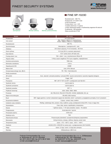 FINEST SECURITY SYSTEMS www.fortuna.pl FINE SP-1023D Rozdzielczość - 480 TVL Przetwornik 1/4" SONY CCD 8 stref prywatności Funkcja dzień / noc + ICR 4 wejścia alarmowe / 2 wyjścia 2 trasy obserwacji każda z możliwością nagrania 40 sekund SP-1023DQ Zewnętrzna Model SP-1023DI Montaż sufitowy SP-1023DS Montaż powierzchniowy 8 sekwencji, 128 presetów Klasa szczelności IP-66 SP-1023D Przetwornik 1/4" CCD Sensor Ilość pikseli PAL: 752(H) x 582(V) 2:1 miedzyliniowe NTSC: 768(H) x 494(V) 2:1 międzyliniowe Rozdzielczość Synchronizacja Obiektyw Zoom cyfrowy Kąt widzenia Funkcja dzień / noc Wyjscie wideo 480 TVL Wewnętrzna / zewnętrzna AC - lock 23 X Zoom optyczny, F=3.9 mm(wide) – 89.7mm 10 X (do 230 X z zoomem optycznym) 53.0° (wide end) to 25°(tele end) TAK - dzień / noc z mechanicznym filtrem IR 1.0Vp-p (sync negative) 75 Ω sync negative, międzyliniowe Kontrola wzmocnienia 18db max. Minimalne oświetlenie 0.03 lx Współczynnik S/N Balans bieli Kompensacja tylnego ośw. (BLC) Strefy prywatności AE control Obrót Pochylenie ≥48dB Auto, ATW, Manual Wł. / Wył. / Automatycznie 4 Auto, Jasność / priorytet przesłony / priorytet IRIS / ręczne wzmocnienie / powolna migawka dostępna Ciągły / 360° 186° (-93°-0°-93°) lub 90°+ przełączanie auto flip ELC Szybkość obrotu 0.05°/S-280°/S Szybkość pochylenia 0.05°/S-200°/S Szybkość presetów Prędkość transmisji Protokoły Złącze komunikacyjne Ruch Grupowanie działania Ustalenie czasu działania Wyświetlanie Nazwa Podgrzewanie Ponawianie alarmu Detekcja ruchu Wykończenie klosza Mocowanie Temperatura pracy Zasilanie Waga Wymiary 300° / s 1200 / 2400 / 4800 / 9600 AD, PELCO-D, PELCO-P, PHILIPS, VICON, SAMSUNG, DS. etc RS-485 (1200 metrów) 360° ciągły zgodnie z ruchem wskazówek zegara lub odwrotnie; obrót + pochylenie, przeglądanie pomiędzy 2 lub 4 presetami 2 grupy - preset, trasa, szablon Według: ustalonego dnia, presetu, trasy, szablonu, grupy, przełączania funkcji D/N, 4 razy w ciągu dnia Czas, data, nazwa, współrzędna, temperatura 1 główna nazwa, -1-16 nazw presetów, nazwa - 16 znaków Automatycznie / ręcznie 0-99 minut TAK Przezroczysty (standard) / przydymiony/brązowy (opcjonalnie) Uchwyt ścienny, wiszący, sufitowy, słupowy, power case wewn.: -5°C~ +60°C / zewn.: -50°C ~ +60°C AC24V±10%, 0.25A 6W (w wersji zewn. z podgrzewaniem 24V/1A/24W) wewn. 2.2 kgs / zewn. 4.3 kgs (bez uchwytu) 230(średnica) x 288.5 mm