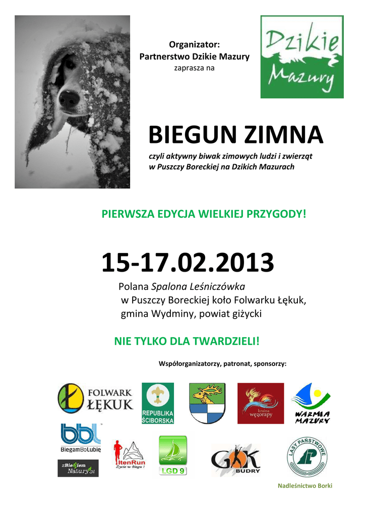 Organizator: Partnerstwo Dzikie Mazury zaprasza na BIEGUN ZIMNA czyli aktywny biwak zimowych ludzi i zwierząt w Puszczy Boreckiej na Dzikich Mazurach PIERWSZA EDYCJA WIELKIEJ PRZYGODY! 15-17.02.2013 Polana Spalona Leśniczówka w Puszczy Boreckiej koło Folwarku Łękuk, gmina Wydminy, powiat giżycki NIE TYLKO DLA TWARDZIELI! Współorganizatorzy, patronat, sponsorzy: Nadleśnictwo Borki Można oczywiście ten czas spędzić w domowych kapciach… ale wszystkich, którzy się zimy nie boją i marzy się im biwak w prawdziwej puszczy – zapraszamy na przygodę w doborowym towarzystwie. Otaczająca dzika przyroda Was zaskoczy. W Puszczy Boreckiej, w sąsiedztwie biwaku żyją na wolności żubry, wilki, rysie, rzadkie ptaki. Czyż nie marzycie o tym, aby odnaleźć ich tropy? Tym, którzy nie chcą zimą biwakować, proponujemy wzięcie udziału w szeregu ciekawych zadań dla każdego, a także skorzystanie z noclegów w pokojach niedaleko miejsca akcji. Impreza doskonała dla całych rodzin. Nie trzeba być z Grenlandii, ani posiadanie supersprzętu nie rozwiąże wszystkich problemów… choć wiadomo – zimą trzeba się dobrze zabezpieczyć. Najważniejsze jednak to przełamać słabość i stereotyp, że o tej porze roku się nie da… ZIMA TO FANTASTYCZNY CZAS DO DZIAŁAŃ, ZWŁASZCZA W DZIKIEJ NATURZE! Dlatego – ZIMOWI LUDZIE! – pakujcie, co się da i zgłaszajcie się na Biegun Zimna. Morsy, maszerzy, surwiwalowcy, harcerze, narciarze, biegacze, wielbiciele przyrody i przygody! Wszyscy, których domowe kapcie zimą za bardzo uwierają! Zapraszamy na trzy dni aktywnych działań terenowych, wymiany doświadczeń i spotkań z ciekawymi ludźmi eksplorującymi zimne rejony świata. IDEA BIEGUNA ZIMNA Tworzymy coroczne miejsce zimowych spotkań – w autentycznej Puszczy – dla tych wszystkich, którzy z jakichś powodów wolą „północ” od „południa”, którzy lepiej czują się gdy jest zimniej niż… za ciepło, którzy kochają różne formy aktywności i przygodę. Program będziemy budowali wspólnie - to poszczególne grupy zainteresowanych wnoszą i realizują swoje propozycje. Koncentrujemy się na tym, co naturalne i bliskie przyrodzie. Liczy się możliwość zdobycia doświadczenia, trening, sprawdzenie się, przygoda i wspólna zabawa. PROGRAM Piątek 15.02.2013 od 15:00 - urządzanie miejsca biwakowego (Polana Spalona Leśniczówka) 19:00 - ognisko z piosenką turystyczną 20:30 -dla chętnych bania ruska w Folwark Łękuk (*Pł) Sobota 16.02.2013 od 8:30 do godz. 12:00 zajęcia w terenie do wyboru: Wyprawy narciarskie po puszczy. Trasa terenowa dla każdego. Start: 9:30. Prowadzący: Ranger Dzikich Mazur – Witosław Wyrobek. Liczba miejsc ograniczona. Zgłoszenia: [email protected], 505 928 292 Wyprawy psimi zaprzęgami po puszczy dla maszerów Prowadzący: Ranger Dzikich Mazur - Dariusz Morsztyn Biegnący Wilk. Zgłoszenia: biegną[email protected], 604 29 29 97 Wyprawy przyrodnicze do puszczy. Tropienie zimowe zwierząt. Start: 8:30. Prowadzący: Ranger Dzikich Mazur - Andrzej Sulej. Liczba miejsc ograniczona. Zgłoszenia: [email protected], 510 143 749 "z Biegiem Natury w Dzikie Mazury" - Terenowy, rekreacyjny bieg po Puszczy Boreckiej dla osób pełnoletnich, na dystansie 6km (start 10:30). Impreza towarzysząca "Bieg Krasnali"(start 12:30) na dystansie 500m. Zgłoszenia: Bartek Osior, [email protected], 506161563 . (*Pł.15 zł z ciepłym posiłkiem) Wyprawy fotograficzne do puszczy. Prowadzący: fotograficy przyrody Maciej Kupczyński i Bolesław Słomkowski. Start: 8:30. Liczba miejsc ograniczona. Zgłoszenia: [email protected], 504244400 Inne formy aktywności można zgłaszać pod adresem: [email protected], 0604 29 29 97. Zapraszamy szczególnie pasjonatów: technik i sprzętu zimowego, sportów zimowych i ekstremalnych, surwiwalu, harcerzy, maszerów, dogtrekkingu, morsów, fotografików, narciarzy, traperów,… 12:30-15:30 Zajęcia rekreacyjne dla całych rodzin (Polana Spalona Leśniczówka): - rzeźby ze śniegu, zamek ze śniegu, tunel, bitwa śniegowa i tradycyjne zabawy na śniegu - rekreacyjne przejażdżki psim zaprzęgiem (*PŁ) - kręcioła – tradycyjna, ekstremalna zabawa mazurska - zjazdy na workach i byle czym - park linowy (*PŁ) - i czas na obiad -14:30 turniej traperski Kulig po Puszczy Boreckiej (*PŁ) Liczba miejsc ograniczona. Start -15:30. Zgłoszenia: Folwark Łękuk, [email protected], 600 931 848, 604 522 695. Od.18:00 Spotkania autorskie z podróżnikami ( Folwark Łękuk) Na ciepły początek: Grupa Tancerzy Ognia FORCE FIRE z GOK w Budrach Finnmarkslopet 1000 km - 2012 Dariusz Morsztyn Biegnący Wilk Bajkał – królestwo lodu i wody – zimowa wyprawa 2012 Piotr Malczewski Zimniej już nie można - relacja z pobytu na Antarktydzie Tomasz Janecki Równolegle: Bania ruska na jeziorze Łękuk, z ceremoniałem chłosty i masażu witkami brzozowymi, chłodzenie w przerębli jeziora, w trakcie serwowana wieczerza mazurska (*PŁ) Zgłoszenia: Folwark Łękuk – [email protected], 600 931 848, 604 522 695. Po spotkaniach z podróżnikami: Nocleg w puszczy. Wyjście z nocowaniem do Puszczy Boreckiej. Prowadzący: Rangers Dzikich Mazur Zbyszek Sienkiewicz. Liczba miejsc ograniczona. Niezbędny indywidualny sprzęt do przetrwania. Zgłoszenia: [email protected] , 882 129 994 Niedziela 17.02.2013 od 8:30 do godz. 12:00 zajęcia w terenie do wyboru: (powtórzenie zajęć sobotnich, dzięki czemu można spróbować innej dyscypliny): - 9:30 Wyprawy narciarskie po puszczy - Wyprawy maszerskie po puszczy - 8:30 Wyprawy przyrodnicze do puszczy. Tropienie zimowe zwierząt -8:30 - Wyprawy fotograficzne do puszczy. 12:30-15:30- zajęcia rekreacyjne dla całych rodzin: (Polana Spalona Leśniczówka) - rzeźby ze śniegu, zamek ze śniegu, tunel, bitwa śniegowa i tradycyjne zabawy na śniegu - rekreacyjne przejażdżki psim zaprzęgiem (*PŁ) - 11:00 Kulig po Puszczy Boreckiej (*PŁ). - kręcioła – tradycyjna, ekstremalna zab