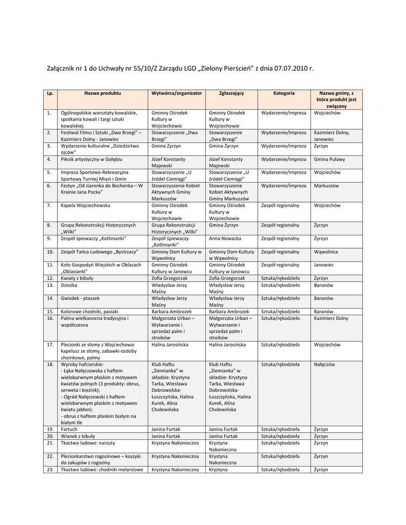 Załącznik nr 1 do Uchwały nr 55/10/Z Zarządu LGD „Zielony Pierścieo” z dnia 07.07.2010 r. Lp. Nazwa produktu 1. Ogólnopolskie warsztaty kowalskie, spotkania kowali i targi sztuki kowalskiej. Festiwal Filmu i Sztuki „Dwa Brzegi” – Kazimierz Dolny - Janowiec Wydarzenie kulturalne „Dziedzictwo ojców” Piknik artystyczny w Gołębiu 2. 3. 4. 5. 6. Impreza Sportowo-Rekreacyjna Sportowy Turniej Miast i Gmin Festyn „Od ziarenka do Bochenka – W Krainie Jana Pocka” 7. Kapela Wojciechowska 8. 9. Grupa Rekonstrukcji Historycznych „Wilki” Zespół śpiewaczy „Kotlinianki” 10. Zespół Taoca Ludowego „Bystrzacy” 11. 12. 13. Koło Gospodyo Wiejskich w Oblasach „Oblasianki” Kwiaty z bibuły Dzieżka 14. Gwizdek - ptaszek 15. 16. Kolorowe chodniki, pasiaki Palma wielkanocna tradycyjna i współczesna 17. Plecionki ze słomy z Wojciechowa: kapelusz ze słomy, zabawki-ozdoby choinkowe, palmy Wyroby hafciarskie: - Łąka Nałęczowska z haftem wielobarwnym płaskim z motywem kwiatów polnych (3 produkty: obrus, serweta i bieżnik); - Ogród Nałęczowski z haftem wielobarwnym płaskim z motywem kwiatu jabłoni; - obrus z haftem płaskim białym na białym tle Fartuch Wianek z bibuły Tkactwo ludowe: narzuty 18. 19. 20. 21. 22. 23. Plecionkarstwo rogozinowe – koszyki do zakupów z rogoziny. Tkactwo ludowe: chodniki melanżowe Wytwórca/organizator Zgłaszający Kategoria Nazwa gminy, z która produkt jest związany Wojciechów Gminny Ośrodek Kultury w Wojciechowie Stowarzyszenie „Dwa Brzegi” Gmina Żyrzyn Gminny Ośrodek Kultury w Wojciechowie Stowarzyszenie „Dwa Brzegi” Gmina Żyrzyn Wydarzenie/impreza Wydarzenie/impreza Kazimierz Dolny, Janowiec Żyrzyn Józef Konstanty Majewski Stowarzyszenie „U źródeł Ciemięgi” Stowarzyszenie Kobiet Aktywnych Gminy Markuszów Gminny Ośrodek Kultury w Wojciechowie Grupa Rekonstrukcji Historycznych „Wilki” Zespół śpiewaczy „Kotlinianki” Gminny Dom Kultury w Wąwolnicy Gminny Ośrodek Kultury w Janowcu Zofia Grzegorzak Władysław Jerzy Maśny Władysław Jerzy Maśny Barbara Ambrożek Małgorzata Urban – Wytwarzanie i sprzedaż palm i stroików Halina Jarosioska Józef Konstanty Majewski Stowarzyszenie „U źródeł Ciemięgi” Stowarzyszenie Kobiet Aktywnych Gminy Markuszów Gminny Ośrodek Kultury w Wojciechowie Gmina Żyrzyn Wydarzenie/impreza Gmina Puławy Wydarzenie/impreza Wojciechów Wydarzenie/impreza Markuszów Zespół regionalny Wojciechów Zespół regionalny Żyrzyn Anna Nowacka Zespół regionalny Żyrzyn Gminny Dom Kultury w Wąwolnicy Gminny Ośrodek Kultury w Janowcu Zofia Grzegorzak Władysław Jerzy Maśny Władysław Jerzy Maśny Barbara Ambrożek Małgorzata Urban – Wytwarzanie i sprzedaż palm i stroików Halina Jarosioska Zespół regionalny Wąwolnica Zespół regionalny Janowiec Sztuka/rękodzieło Sztuka/rękodzieło Żyrzyn Baranów Sztuka/rękodzieło Baranów Sztuka/rękodzieło Sztuka/rękodzieło Baranów Kazimierz Dolny Sztuka/rękodzieła Wojciechów Klub Haftu „Ziemianka” w składzie: Krystyna Tarka, Wiesława DobrowolskaŁuszczyoska, Halina Kurek, Alina Cholewioska Klub Haftu „Ziemianka” w składzie: Krystyna Tarka, Wiesława DobrowolskaŁuszczyoska, Halina Kurek, Alina Cholewioska Sztuka/rękodzieła Nałęczów Janina Furtak Janina Furtak Krystyna Nakonieczna Janina Furtak Janina Furtak Krystyna Nakonieczna Krystyna Nakonieczna Krystyna Sztuka/rękodzieła Sztuka/rękodzieła Sztuka/rękodzieła Żyrzyn Żyrzyn Żyrzyn Sztuka/rękodzieła Żyrzyn Sztuka/rękodzieła Żyrzyn Krystyna Nakonieczna Krystyna Nakonieczna Wydarzenie/impreza 24. z naturalnych materiałów i naturalnej kolorystyki Szlak żelaza i kowalskich tradycji Nakonieczna 25. Gospodarstwo agroturystyczne z ofertą edukacyjną 26. 28. Muzeum Nietypowych Rowerów w Gołębiu oraz przejażdżki Szlak rowerowy „W Krainie Jana Pocka” Wojciechosko Zagroda 29. 30. 31. 32. Marchwiak Chleb śniadowski Smalczyk z lubczykiem Wino po gołębsku 33. Marianna Pardyka – Stołówka w „Starej Aptece” 34. Miętus gryczany 35. Polędwica z wędzarni 36. Kiełbasa hycowana Kwatera agroturystyczna „Gajowianka” – Anna i Jacek Kowalscy 37. 38. Pierogi z fasolą Pierogi z kaszy jaglanej z białym serem Janina Furtak Krystyna Nakonieczna 39. Szynka Nadwieprzaoska 40. Pierogi wiejskie 41. Chleb kaleoski na zakwasie Gminna Spółdzielnia „Samopomoc Chłopska” w Baranowie Stowarzyszenie „U źródeł Ciemięgi” Zofia Paprota Gminny Ośrodek Kultury w Wojciechowie Anna i Tadeusz Sadurscy – Gospodarstwo agroturystyczne „Przy Wąwozie” Józef Konstanty Majewski Gminny Dom Kultury w Markuszowie Małgorzata Kowalczyk – „Wojciechosko Zagroda” Zofia Grzegorzak Urszula Wojda Anna Sidor Józef Konstanty Majewski Marianna Pardyka – Stołówka w „Starej Aptece” Stowarzyszenie „Aktywna Wieś” w Drzewcach Kwatera agroturystyczna „Gajowianka” – Anna i Jacek Kowalscy Kwatera agroturystyczna „Gajowianka” – Anna i Jacek Kowalscy Janina Furtak Krystyna Nakonieczna Gminna Spółdzielnia „Samopomoc Chłopska” w Baranowie Stowarzyszenie „U źródeł Ciemięgi” Zofia Paprota 42. Kaleoski kaszak jaglany Zofia Paprota Zofia Paprota Produkt spożywczy Markuszów 43. Pierożki drożdżowe z Wólki Kątnej Zofia Paprota Zofia Paprota Produkt spożywczy Markuszów 44. Markuszowski kwas chlebowy Maria Struska Maria Struska Produkt spożywczy Markuszów 45. Elżbieta Wójtowicz Elżbieta Wójtowicz Produkt spożywczy Markuszów 46. Wólczaoskie pierożki pieczone na zsiadłym mleku Bociany Górskie Teresa Kamioska Teresa Kamioska Produkt spożywczy Markuszów 47. Nalewka z mniszka lekarskiego Bogusława Łowczak Bogusława Łowczak Produkt spożywczy Markuszów 27. Gminny Ośrodek Kultury w Wojciechowie Anna i Tadeusz Sadurscy – Gospodarstwo agroturystyczne „Przy Wąwozie” Józef Konstanty Majewski Gminny Dom Kultury w Markuszowie Małgorzata Kowalczyk – „Wojciechosko Z