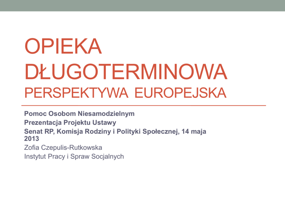 OPIEKA DŁUGOTERMINOWA PERSPEKTYWA EUROPEJSKA Pomoc Osobom Niesamodzielnym Prezentacja Projektu Ustawy Senat RP, Komisja Rodziny i Polityki Społecznej, 14 maja 2013 Zofia Czepulis-Rutkowska Instytut Pracy i Spraw Socjalnych Plan Wystąpienia • Wyzwania • Prawo Unijne • Istotne (wspólne) problemy • Podsumowanie Wyzwania • Starzenie się ludności • Rosnąca długość życia • Wielochorobowość, choroby chroniczne • Niepełnosprawność • Spadek wskaźników urodzeń • Zmiana społeczna • Przekształcenia rynku pracy • Przekształcenia rodziny Wyzwania • Starzenie się ludności (do 2050 roku): • Wzrost liczby osób 65+ o 77% - do 133 mln • Wzrost liczby osób 80+ o 174% - do 50 mln • Udział w liczbie ludności osób 65+ - 29,4% (obecnie 16,5%) • Udział w liczbie ludności osób 80+ - 11,0% (obecnie 4,0%) Wyzwania • Zmiana społeczna- powiązane wzajemnie: • Przekształcenia na rynku pracy • Gospodarka post przemysłowa • Likwidacja „płacy rodzinnej” – pozwalającej na utrzymanie całej rodziny przez jednego żywiciela rodziny (mężczyzna zatrudniony w przemyśle) • Przekształcenia rodziny • Aktywizacja kobiet na rynku pracy • Zmiana ról w rodzinie – kobieta nie może już pełnić funkcji opiekuńczych – w tym: wobec osób starszych lub niepełnosprawnych w rodzinie Prawo Unijne w zakresie polityki społecznej • W zasadzie polityka społeczna znajduje się w kompetencji poszczególnych państw członkowskich • Nie da się jednak oddzielić polityki ekonomicznej od społecznej • W szczególności jest to trudne wobec tendencji pogłębienia integracji w ramach Unii Europejskiej • Stąd – różne metody wpływu na krajowe polityki społeczne Prawo Unijne w zakresie polityki społecznej • Koordynacja systemów zabezpieczenia społecznego – dla pracowników przemieszczających się w ramach Unii • Otwarta Metoda Koordynacji • „Miękkie” prawo • Wybór celów • Ustalanie wskaźników • Dopasowywanie prawa krajowego • Porównanie doświadczeń – wzajemna nauka Prawo Unijne w zakresie polityki społecznej • Otwarta Metoda Koordynacji • Strategia Zatrudnienia (1997r.) • Ubóstwo i wykluczenie (2000r.) • Systemy emerytalne(2000r.) • Systemy ochrony zdrowia i opieki długoterminowej – 2004 r. Prawo Unijne zróżnicowane systemy opieki długoterminowej • Opieka długoterminowa łączy elementy tradycyjnego systemu pomocy społecznej i ochrony zdrowia • W niektórych państwach wyodrębniony system opieki długoterminowej • Różne metody finansowania; na ogół mieszane ale z przewagą: • Ubezpieczenia (Niemcy) • Podatków • Świadczenia Uniwersalne (Hiszpania) • Zależne od dochodu (Anglia) Prawo Unijne Otwarta Metoda Koordynacji • Dostęp do odpowiedniej ochrony zdrowia i opieki długoterminowej, zapobieganie sytuacji w której potrzeba świadczeń zdrowotnych i opieki długoterminowej prowadzi do ubóstwa, nadmiernych nierówności i zależności finansowej • Zapewnienie jakości świadczeń, zastosowanie działań prewencyjnych i adaptacyjnych do zmieniających się potrzeb • Zapewnienie wypłacalności systemów ochrony zdrowia i opieki długoterminowej przez promowanie racjonalnego wykorzystania zasobów, odpowiednie zarządzanie przez stosowanie właściwych bodźców ekonomicznych, promocję zdrowego trybu życia. Istotne Problemy Na podstawie Otwartej Metody Koordynacji • Definicja • Dostępność świadczeń • Jakość świadczeń • Wypłacalność systemów • Koordynacja • Pracownicy Istotne Problemy definicja • Zróżnicowanie pod względem długości okresu wymaganej • • • • • opieki Charakterystyki świadczeniobiorcy Często granica między świadczeniami medycznymi (medical component) i opieką socjalną (non-medical component) są nieostre Różnice w sposobach oceny zależności od osób trzecich Różna rola usług i świadczeń finansowych Różna rola usług publicznych, prywatnych i rodziny Istotne Problemy dostępność świadczeń • Państwa członkowskie mają na celu zapewnienie dostępności do świadczeń, która nie zależy od indywidualnej możliwości płacenia • Uniwersalne uprawnienia nie zawsze przekładają się na uniwersalny dostęp do świadczeń. Zidentyfikowane bariery dostępu: • Brak objęcia ubezpieczeniem • Brak określonych rodzajów opieki • Wysokie koszty indywidualne • Zróżnicowanie geograficzne podaży świadczeń Istotne Problemy dostępność świadczeń • Brak, w wielu krajach członkowskich, integracji świadczeń medycznych i socjalnych. Utrudnia to kontynuację i odpowiednią sekwencję świadczeń i opieki • Długi okres oczekiwania wynika miedzy innymi ze zróżnicowań geograficznych a te zróżnicowania z odpowiedzialności lokalnych podmiotów Istotne Problemy dostępność świadczeń • Odchodzenie od opieki instytucjonalnej • Usługi domowe i środowiskowe • Wykorzystanie ICT(tele monitoring, tele medycyna) dla wydłużenia okresu samodzielnego życia Istotne Problemy jakość świadczeń • Jakość silnie zróżnicowana pomiędzy poszczególnymi państwami i w tych państwach • Dużo doniesień o niskiej jakości usług • Nieodpowiednie warunki lokalowe • Brak prywatności • Złe relacje społeczne • Stosowanie niewłaściwych ograniczeń Istotne Problemy jakość świadczeń • Wiele państw wprowadziło lub udoskonaliło regulacje dotyczące oceny i poprawy jakości opieki długoterminowej • Definicja i miara jakości świadczeń jest jednak trudna ze względu na wszechstronną naturę opieki długoterminowej • OECD proponuje następujące wymiary pomiaru jakości: • Struktura • Proces • Efekt Istotne Problemy jakość świadczeń • Struktura • Jakość i bezpieczeństwo budynków • Wielkość pokojów • Kwalifikacje personelu Istotne Problemy jakość świadczeń • Proces • Mechanizmy chroniące prawa pacjentów • Dobrze f