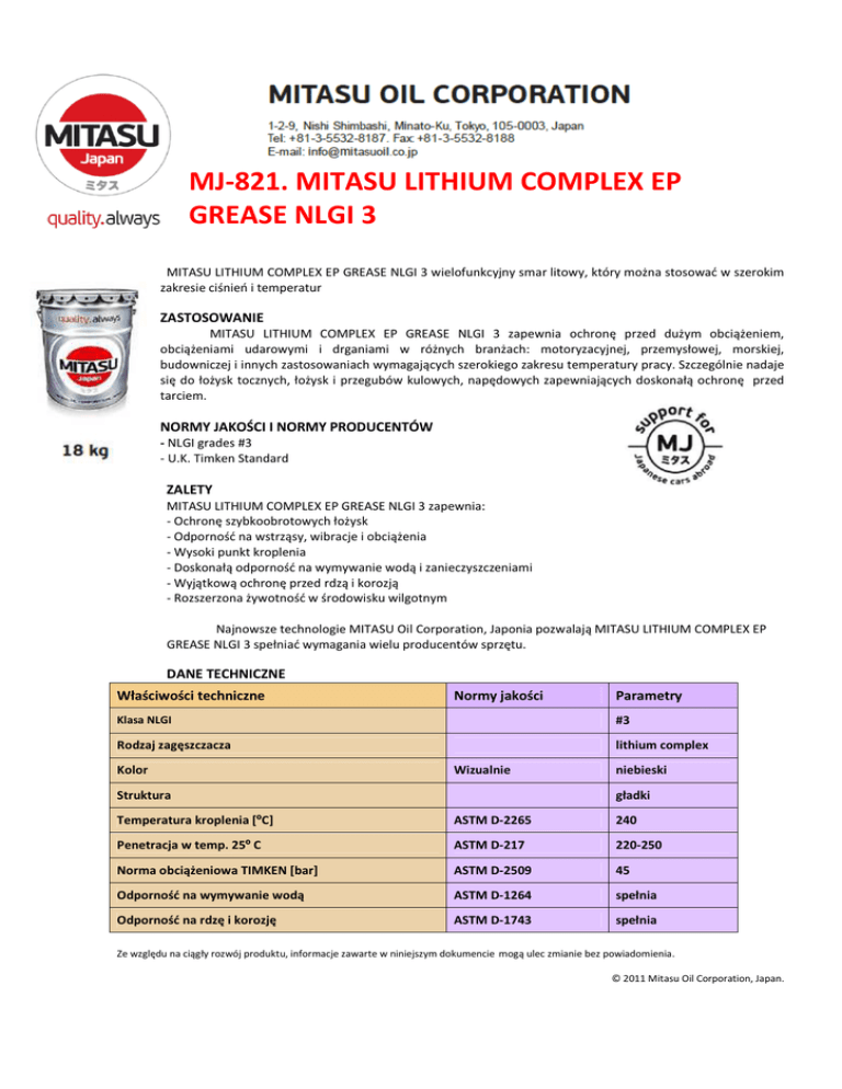 MJ-821. MITASU LITHIUM COMPLEX EP GREASE NLGI 3 MITASU LITHIUM COMPLEX EP GREASE NLGI 3 wielofunkcyjny smar litowy, który można stosować w szerokim zakresie ciśnień i temperatur ZASTOSOWANIE MITASU LITHIUM COMPLEX EP GREASE NLGI 3 zapewnia ochronę przed dużym obciążeniem, obciążeniami udarowymi i drganiami w różnych branżach: motoryzacyjnej, przemysłowej, morskiej, budowniczej i innych zastosowaniach wymagających szerokiego zakresu temperatury pracy. Szczególnie nadaje się do łożysk tocznych, łożysk i przegubów kulowych, napędowych zapewniających doskonałą ochronę przed tarciem. NORMY JAKOŚCI I NORMY PRODUCENTÓW - NLGI grades #3 - U.K. Timken Standard ZALETY MITASU LITHIUM COMPLEX EP GREASE NLGI 3 zapewnia: - Ochronę szybkoobrotowych łożysk - Odporność na wstrząsy, wibracje i obciążenia - Wysoki punkt kroplenia - Doskonałą odporność na wymywanie wodą i zanieczyszczeniami - Wyjątkową ochronę przed rdzą i korozją - Rozszerzona żywotność w środowisku wilgotnym Najnowsze technologie MITASU Oil Corporation, Japonia pozwalają MITASU LITHIUM COMPLEX EP GREASE NLGI 3 spełniać wymagania wielu producentów sprzętu. DANE TECHNICZNE Właściwości techniczne Normy jakości Parametry Klasa NLGI #3 Rodzaj zagęszczacza lithium complex Kolor Wizualnie Struktura niebieski gładki Temperatura kroplenia [ºC] ASTM D-2265 240 Penetracja w temp. 25º C ASTM D-217 220-250 Norma obciążeniowa TIMKEN [bar] ASTM D-2509 45 Odporność na wymywanie wodą ASTM D-1264 spełnia Odporność na rdzę i korozję ASTM D-1743 spełnia Ze względu na ciągły rozwój produktu, informacje zawarte w niniejszym dokumencie mogą ulec zmianie bez powiadomienia. © 2011 Mitasu Oil Corporation, Japan.