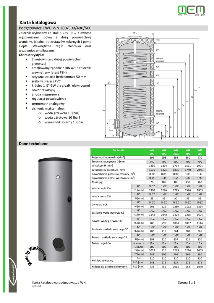 Karta katalogowa Podgrzewacz CWU WN 200/300/400/500 Zbiornik wykonany ze stali S 235 JRG2 z dwoma wężownicami, dolną z dużą powierzchnią wymiany, idealną do zestawów solarnych i pomp ciepła. Wewnętrzna część zbiornika oraz wężownice emaliowane. Charakterystyka: 2 wężownice o dużej powierzchni grzewczej emaliowany zgodnie z DIN 4753 zbiornik wewnętrzny (atest PZH) sztywna izolacja bezfreonowa 50 mm srebrny płaszcz PVC króciec 1 ½” GW dla grzałki elektrycznej otwór rewizyjny anoda magnezowa regulacja posadowienia termometr analogowy ciśnienia maksymalne: o woda grzewcza 10 [bar] o woda użytkowa 10 [bar] o wymiennik solarny 10 [bar] Dane techniczne Parametr Pojemność nominalna [dm³] nominalna [dm3] Średnica zewnętrzna D [mm] z izolacją [mm] Wysokość H [mm] w przechyle Wysokość w [mm] przechyle [mm] Powierzchnia górnej wężownicy [m2] Powierzchnia dolnej wężownicy [m2] Masa [kg] Woda ciepła CW Woda zimna ZW Cyrkulacja CK Zasilanie wodą grzewczą KZ Powrót wody grzewczej KP Zasilanie z układu solarnego SZ Powrót z układu solarnego SP Tuleje czujników Kołnierz rewizyjny Króciec dla grzałki elektrycznej Karta katalogowa podgrzewacze WN v. 101212 G” h1 [mm] G” h9 [mm] G” h4 [mm] G” h2 [mm] G” h5 [mm] G” h6 [mm] G” h8 [mm] ø wew. x L [mm] h3 [mm] h7 [mm] DN h10 [mm] h11 [mm] WN 200 192 540 1435 1535 0,70 0,95 70 ¾ GZ 1370 ¾ GZ 55 ¾ GZ 901 1 GZ 1148 1 GZ 788 1 GZ 788 1 GZ 193 16 x 200 1013 282 110 248 738 WN 300 298 700 1294 1475 0,85 1,45 106 1 GZ 1226 1 GZ 55 ¾ GZ 625 1 GZ 1048 1 GZ 790 1 GZ 715 1 GZ 220 16 x 200 920 306 110 275 755 WN 300S 295 600 1794 1895 0,80 1,55 106 1 GZ 1725 1 GZ 90 ¾ GZ 1289 1 GZ 1424 1 GZ 1064 1 GZ 964 1 GZ 254 16 x 200 1289 403 110 324 1013 WN 400 380 700 1591 1740 1,05 1,80 130 1 GZ 1526 1 GZ 55 ¾ GZ 1112 1 GZ 1355 1 GZ 1007 1 GZ 909 1 GZ 221 16 x 200 1224 369 110 276 958 Strona 1 z 1 WN 500 470 700 1921 2045 1,30 1,90 160 1 GZ 1853 1 GZ 55 ¾ GZ 1264 1 GZ 1604 1 GZ 1114 1 GZ 965 1 GZ 220 16 x 200 1409 380 110 275 1040