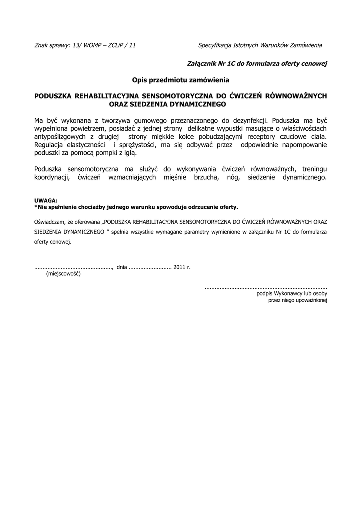 Znak sprawy: 13/ WOMP – ZCLiP / 11 Specyfikacja Istotnych Warunków Zamówienia Załącznik Nr 1C do formularza oferty cenowej Opis przedmiotu zamówienia PODUSZKA REHABILITACYJNA SENSOMOTORYCZNA DO ĆWICZEŃ RÓWNOWAŻNYCH ORAZ SIEDZENIA DYNAMICZNEGO Ma być wykonana z tworzywa gumowego przeznaczonego do dezynfekcji. Poduszka ma być wypełniona powietrzem, posiadać z jednej strony delikatne wypustki masujące o właściwościach antypoślizgowych z drugiej strony miękkie kolce pobudzającymi receptory czuciowe ciała. Regulacja elastyczności i sprężystości, ma się odbywać przez odpowiednie napompowanie poduszki za pomocą pompki z igłą. Poduszka sensomotoryczna ma służyć do wykonywania ćwiczeń równoważnych, treningu koordynacji, ćwiczeń wzmacniających mięśnie brzucha, nóg, siedzenie dynamicznego. UWAGA: *Nie spełnienie chociażby jednego warunku spowoduje odrzucenie oferty. Oświadczam, że oferowana „PODUSZKA REHABILITACYJNA SENSOMOTORYCZNA DO ĆWICZEŃ RÓWNOWAŻNYCH ORAZ SIEDZENIA DYNAMICZNEGO ” spełnia wszystkie wymagane parametry wymienione w załączniku Nr 1C do formularza oferty cenowej. ..............................................., dnia .......................... 2011 r. (miejscowość) .......................................................................... podpis Wykonawcy lub osoby przez niego upoważnionej