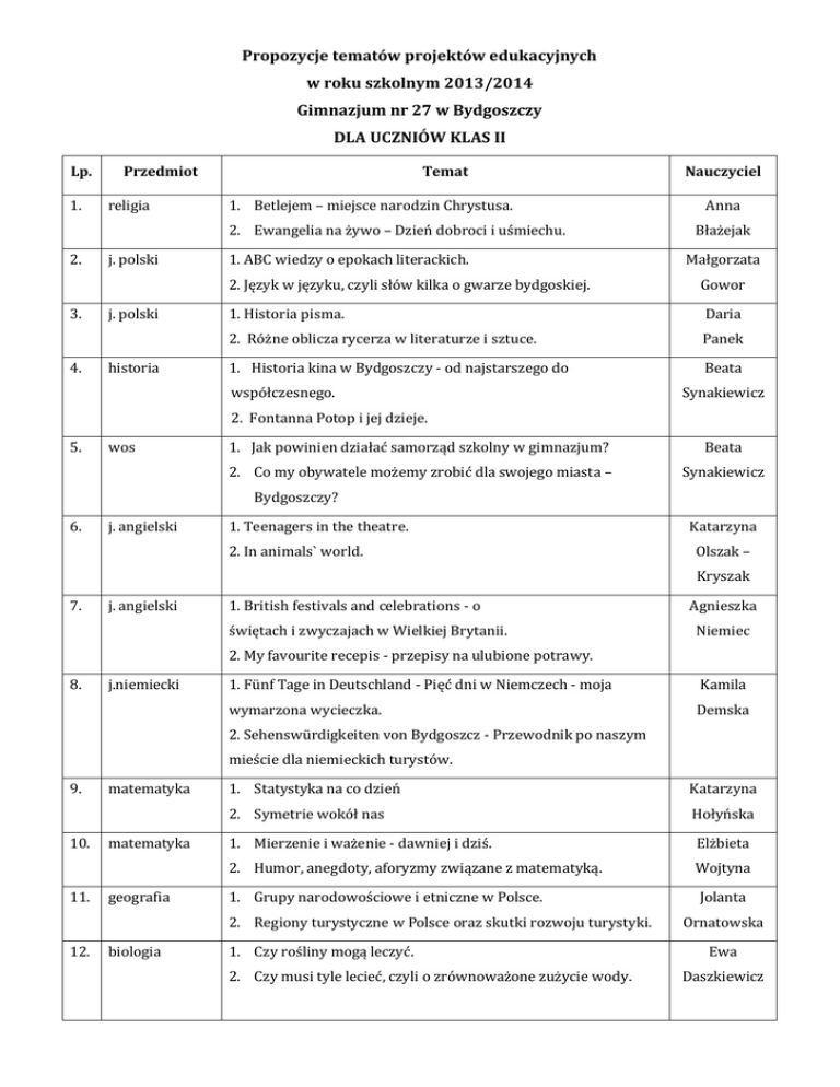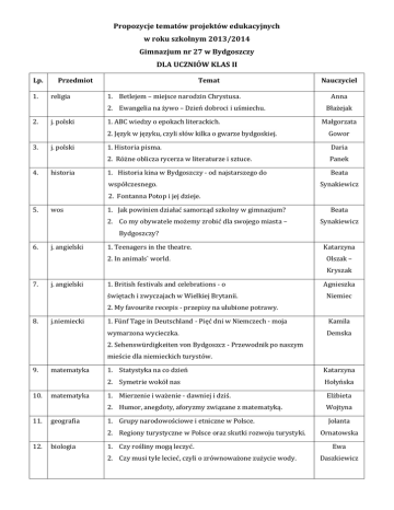 Propozycje tematów projektów edukacyjnych w roku szkolnym 2013/2014 Gimnazjum nr 27 w Bydgoszczy DLA UCZNIÓW KLAS II Lp. 1. Przedmiot religia Temat 1. Betlejem – miejsce narodzin Chrystusa. 2. Ewangelia na żywo – Dzień dobroci i uśmiechu. 2. 3. 4. j. polski j. polski historia 1. ABC wiedzy o epokach literackich. Nauczyciel Anna Błażejak Małgorzata 2. Język w języku, czyli słów kilka o gwarze bydgoskiej. Gowor 1. Historia pisma. Daria 2. Różne oblicza rycerza w literaturze i sztuce. Panek 1. Historia kina w Bydgoszczy - od najstarszego do Beata współczesnego. Synakiewicz 2. Fontanna Potop i jej dzieje. 5. wos 1. Jak powinien działać samorząd szkolny w gimnazjum? Beata 2. Co my obywatele możemy zrobić dla swojego miasta – Synakiewicz Bydgoszczy? 6. j. angielski 1. Teenagers in the theatre. 2. In animals` world. Katarzyna Olszak – Kryszak 7. j. angielski 1. British festivals and celebrations - o świętach i zwyczajach w Wielkiej Brytanii. Agnieszka Niemiec 2. My favourite recepis - przepisy na ulubione potrawy. 8. j.niemiecki 1. Fünf Tage in Deutschland - Pięć dni w Niemczech - moja Kamila wymarzona wycieczka. Demska 2. Sehenswürdigkeiten von Bydgoszcz - Przewodnik po naszym mieście dla niemieckich turystów. 9. 10. 11. matematyka matematyka geografia 1. Statystyka na co dzień Katarzyna 2. Symetrie wokół nas Hołyńska 1. Mierzenie i ważenie - dawniej i dziś. Elżbieta 2. Humor, anegdoty, aforyzmy związane z matematyką. Wojtyna 1. Grupy narodowościowe i etniczne w Polsce. 2. Regiony turystyczne w Polsce oraz skutki rozwoju turystyki. 12. biologia 1. Czy rośliny mogą leczyć. 2. Czy musi tyle lecieć, czyli o zrównoważone zużycie wody. Jolanta Ornatowska Ewa Daszkiewicz 13. fizyka Chemia: chemia 1. Substancje niebezpieczne w naszym otoczeniu. Zofia Najdowska 2. Segregacja odpadów a ochrona środowiska. Fizyka: 1. Elektrownie jądrowe-korzyści i zagrożenia. 2. Ruch wokół nas. 14. muzyka Muzyka plastyka 1. Związki muzyki z poezją. Hanna Żółkoś 2. "Miłość drogę zna" - muzyka filmowa, jej znaczenie i funkcje. Plastyka 1. Kompozycja w dziełach malarskich. 2. Styl barokowy w architekturze i rzeźbie. 15. informatyka Informatyka: Aleksandra zajęcia 1. Znane postacie świata informatyki. Kaczmarek techniczne 2. Internet historia powstania, jego rola we współczesnym świecie. Zajęcia techniczne: 1. Jak na co dzień ułatwiamy sobie pracę? 2. Współczesne wynalazki - dziwne, ciekawe, przydatne, śmieszne, intrygujące. 16. 17. wychowanie 1. Historia olimpiady zimowej - polscy olimpijczycy. fizyczne 2. Mało znane gry sportowe. wychowanie 1. Siła, szybkość i wytrzymałość jako cechy motoryczne fizyczne człowieka. Gry i zabawy ruchowe rozwijające te cechy. Sylwester Birkholz Katarzyna Łowicka 2. Ćwiczenia kształtujące, ich podział i zadania. 18. biblioteka Biblioteka szkolna: szkolna 1. Słownik multimedialny pisarzy polskich. edukacja dla Edukacja dla bezpieczeństwa: Dawid Lewandowski bezpieczeństwa 1. Modele ran, pierwsza pomoc, opis. 19. 20. 21. świetlica pedagog pedagog 1. Młodzieżowe Menu - styl zdrowego żywienia. Ewa 2. Żegluga bydgoska - wypoczynek i rekreacja. Sarleja 1. Jak promować naszą szkołę. Monika 2. Wszystkie naj... mojej szkoły. Budny 1. Sztuka autoprezentacji. Agnieszka 2. Rozwój emocjonalny młodzieży na etapie gimnazjalnym. Ozdarska