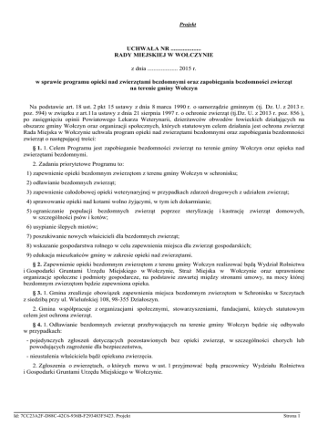 Projekt UCHWAŁA NR .................... RADY MIEJSKIEJ W WOŁCZYNIE z dnia .................... 2015 r. w sprawie programu opieki nad zwierzętami bezdomnymi oraz zapobiegania bezdomności zwierząt na terenie gminy Wołczyn Na podstawie art. 18 ust. 2 pkt 15 ustawy z dnia 8 marca 1990 r. o samorządzie gminnym (tj. Dz. U. z 2013 r. poz. 594) w związku z art.11a ustawy z dnia 21 sierpnia 1997 r. o ochronie zwierząt (tj.Dz. U. z 2013 r. poz. 856 ), po zasięgnięciu opinii Powiatowego Lekarza Weterynarii, dzierżawców obwodów łowieckich działających na obszarze gminy Wołczyn oraz organizacji społecznych, których statutowym celem działania jest ochrona zwierząt Rada Miejska w Wołczynie uchwala program opieki nad zwierzętami bezdomnymi oraz zapobiegania bezdomności zwierząt o następującej treści: § 1. 1. Celem Programu jest zapobieganie bezdomności zwierząt na terenie gminy Wołczyn oraz opieka nad zwierzętami bezdomnymi. 2. Zadania priorytetowe Programu to: 1) zapewnienie opieki bezdomnym zwierzętom z terenu gminy Wołczyn w schronisku; 2) odławianie bezdomnych zwierząt; 3) zapewnienie całodobowej opieki weterynaryjnej w przypadkach zdarzeń drogowych z udziałem zwierząt; 4) sprawowanie opieki nad kotami wolno żyjącymi, w tym ich dokarmianie; 5) ograniczanie populacji bezdomnych zwierząt poprzez sterylizację i kastrację zwierząt domowych, w szczególności psów i kotów; 6) usypianie ślepych miotów; 7) poszukiwanie nowych właścicieli dla bezdomnych zwierząt; 8) wskazanie gospodarstwa rolnego w celu zapewnienia miejsca dla zwierząt gospodarskich; 9) edukacja mieszkańców gminy w zakresie opieki nad zwierzętami. § 2. Zapewnienie opieki bezdomnym zwierzętom z terenu gminy Wołczyn realizować będą Wydział Rolnictwa i Gospodarki Gruntami Urzędu Miejskiego w Wołczynie, Straż Miejska w Wołczynie oraz uprawnione organizacje społeczne i podmioty gospodarcze, na podstawie zawartej między stronami umowy, na mocy której bezdomnym zwierzętom będzie zapewniona opieka. § 3. 1. Gmina zrealizuje obowiązek zapewnienia miejsca bezdomnym zwierzętom w Schronisku w Szczytach z siedzibą przy ul. Wieluńskiej 108, 98-355 Działoszyn. 2. Gmina współpracuje z organizacjami społecznymi, stowarzyszeniami, fundacjami, których statutowym celem jest ochrona zwierząt. § 4. 1. Odławianie bezdomnych zwierząt przebywających na terenie gminy Wołczyn będzie się odbywało w przypadkach: - pojedynczych zgłoszeń dotyczących pozostawionych bez opieki zwierząt, w szczególności chorych lub powodujących zagrożenie dla bezpieczeństwa, - nieustalenia właściciela bądź opiekuna zwierzęcia. 2. Zgłoszenia o zwierzętach, o których mowa w ust. 1 przyjmować będą pracownicy Wydziału Rolnictwa i Gospodarki Gruntami Urzędu Miejskiego w Wołczynie. Id: 7CC23A2F-D88C-42C6-936B-F293483F5423. Projekt Strona 1 3. Bezdomne zwierzęta odławiane będą przez podmiot F.U.H. „Oskar” Sławomir Gizler z siedzibą przy ul. Rynek 22/1, 46-300 Olesno. 4. Odłowione zwierzęta podlegają przewiezieniu do schroniska, o którym mowa § 3 ust. 1. § 5. Całodobowa opieka weterynaryjna w przypadkach zdarzeń drogowych z udziałem zwierząt na terenie gminy Wołczyn realizowana będzie przez Gabinet Weterynaryjny Urszula Pękala-Duda z siedzibą Os. Młodych 3G/8, 46-250 Wołczynie. § 6. 1. Sprawowanie opieki nad wolno żyjącymi kotami, w tym ich dokarmianie realizowane jest poprzez: 1) zapewnienie opieki weterynaryjnej (leczenia) wolno żyjącym kotom z terenu miasta w ramach zawartej umowy z lekarzem weterynarii; 2) przyjmowanie i podejmowanie interwencji dotyczących kotów wolno żyjących; 3) dokarmianie kotów wolno żyjących. 2. W celu kontroli populacji kotów wolno żyjących gmina finansować będzie zabiegi sterylizacji kotów wolno żyjących. § 7. 1. Gmina pokrywa koszty sterylizacji/kastracji zwierząt bezdomnych z terenu gminy Wołczyn w celu ograniczenia populacji bezdomnych zwierząt. 2. Sterylizacja/kastracja o której mowa w ust. 1 jest obligatoryjnie przeprowadzana każdorazowo, kiedy wyłapane bezdomne zwierzę oddawane jest do schroniska. 3. Zabiegi o których mowa w ust. 1 i 2 dokonywane są przez podmiot, o którym mowa w § 3. 4. Bezdomne zwierzęta przed przekazaniem do adopcjii będą poddawane zabiegom sterylizacji i kastracji w gabinecie weterynaryjnym. § 8. 1. Gmina pokrywa koszty uśpienia ślepych miotów psów lub kotów bezdomnych na terenie gminy. 2. Określa się następujące zasady finansowania zabiegów, o których mowa w ust. 1: 1) uśpieniu mogą podlegać wyłącznie zwierzęta, które jeszcze są ślepe i nie ma możliwości zapewnienia im właścicieli; 2) zabieg usypiania ślepych miotów przeprowadza wyłącznie lekarz weterynarii w gabinecie weterynaryjnym z którym gmina Wołczyn posiada umowę na wykonywanie usług weterynaryjnych. § 9. 1. Gmina prowadzi poszukiwania nowych właścicieli dla bezdomnych zwierząt poprzez: prowadzenie akcji adopcyjnej bezdomnych zwierząt odłowionych z terenu gminy, to jest stworzenie elektronicznej bazy na stronie internetowej, umieszczenie zdjęć i informacji dotyczących odłowionych zwierząt na tej stronie oraz na tablicy informacyjnej w siedzibie Urzędu. § 10. Wskazuje się gospodarstwo rolne Pana Franciszka Panicz zam. Szymonków, ul. Wołczyńska 5, 46-250 Wołczyn, celem zapewnienia miejsca dla bezdomnych lub porzuconych zwierząt gospodarskich. § 11. Gmina może prowadzić we współpracy z organizacjami pozarządowymi i innymi instytucjami, działania edukacyjne m. in. w zakresie odpowiedniej i właściwej opieki nad zwierzętami, ich humanitarnego traktowania, propagowanie sterylizacji i kastracji zwierząt oraz adopcji zwierząt bezdomnych. Edukacja mieszkańców odbywać się będzie poprzez publikowanie odpowiednich wiadomości na stronie internetowej Urzędu Miejskiego oraz w mediach. § 12. 1. Środki finansowe na realizację zadań wynikających z Programu