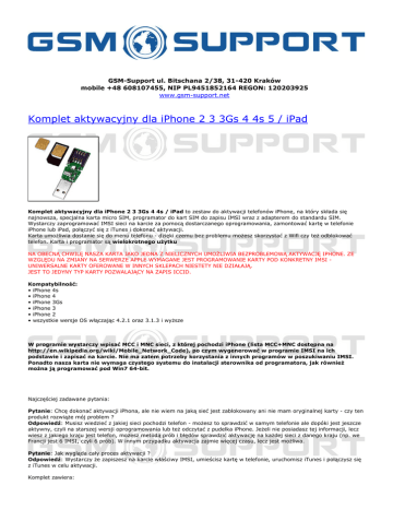 GSM-Support ul. Bitschana 2/38, 31-420 Kraków mobile +48 608107455, NIP PL9451852164 REGON: 120203925 www.gsm-support.net Komplet aktywacyjny dla iPhone 2 3 3Gs 4 4s 5 / iPad Komplet aktywacyjny dla iPhone 2 3 3Gs 4 4s / iPad to zestaw do aktywacji telefonów iPhone, na który składa się najnowsza, specjalna karta micro SIM, programator do kart SIM do zapisu IMSI wraz z adapterem do standardu SIM. Wystarczy zaprogramować IMSI sieci na karcie za pomocą dostarczanego oprogramowania, zamontować kartę w telefonie iPhone lub iPad, połączyć się z iTunes i dokonać aktywacji. Karta umożliwia dostanie się do menu telefonu - dzięki czemu bez problemu możesz skorzystać z Wifi czy też odblokować telefon. Karta i programator są wielokrotnego użytku NA OBECNĄ CHWILĘ NASZA KARTA JAKO JEDNA Z NIELICZNYCH UMOŻLIWIA BEZPROBLEMOWĄ AKTYWACJĘ IPHONE. ZE WZGLĘDU NA ZMIANY NA SERWERZE APPLE WYMAGANE JEST PROGRAMOWANIE KARTY POD KONKRETNY IMSI UNIWERSALNE KARTY OFEROWANE W INNYCH SKLEPACH NIESTETY NIE DZIAŁAJĄ. JEST TO JEDYNY TYP KARTY POZWALAJĄCY NA ZAPIS ICCID. Kompatybilność: • iPhone 4s • iPhone 4 • iPhone 3Gs • iPhone 3 • iPhone 2 • wszystkie wersje OS włączając 4.2.1 oraz 3.1.3 i wyższe W programie wystarczy wpisać MCC i MNC sieci, z której pochodzi iPhone (lista MCC+MNC dostępna na http://en.wikipedia.org/wiki/Mobile_Network_Code), po czym wygenerować w programie IMSI na ich podstawie i zapisać na karcie. Nie ma zatem potrzeby korzystania z innych programów w poszukiwaniu IMSI. Ponadto nasza karta nie wymaga czystego systemu do instalacji sterownika od programatora, jak również można ją programować pod Win7 64-bit. Najczęściej zadawane pytania: Pytanie: Chcę dokonać aktywacji iPhona, ale nie wiem na jaką sieć jest zablokowany ani nie mam oryginalnej karty - czy ten produkt rozwiąże mój problem ? Odpowiedź: Musisz wiedzieć z jakiej sieci pochodzi telefon - możesz to sprawdzić w samym telefonie ale dopóki jest jeszcze aktywny, czyli na starszej wersji oprogramowania lub też odczytać z pudelka iPhone. Jeżeli nie posiadasz tej informacji, lecz wiesz z jakiego kraju jest telefon, możesz metodą prób i błędów sprawdzić aktywację na każdej sieci z danego kraju (np. we Francji jest 6 IMSI, czyli 6 prób). W innym przypadku aktywacja zajmie więcej czasu, lecz jest możliwa. Pytanie: Jak wygląda cały proces aktywacji ? Odpowiedź: Wystarczy że zapiszesz na karcie właściwy IMSI, umieścisz kartę w telefonie, uruchomisz iTunes i połączysz się z iTunes w celu aktywacji. Komplet zawiera: - karta aktywacyjna microSIM adapter micro SIM -> SIM programator USB oprogramowanie do pobrania z naszego serwera instrukcja obsługi ©2012 www.gsm-support.net Opis ten nie stanowi oferty w rozumieniu Kodeksu Cywilnego. GSM-Support zastrzega sobie prawo do możliwych błędów w opisie produktu. Prosimy o weryfikację z Państwa strony, a w razie wątpliwości o kontakt. GSM-Support ul. Bitschana 2/38 31-420 Kraków POLSKA tel. 608107455 e-mail: [email protected] Powered by TCPDF (www.tcpdf.org)