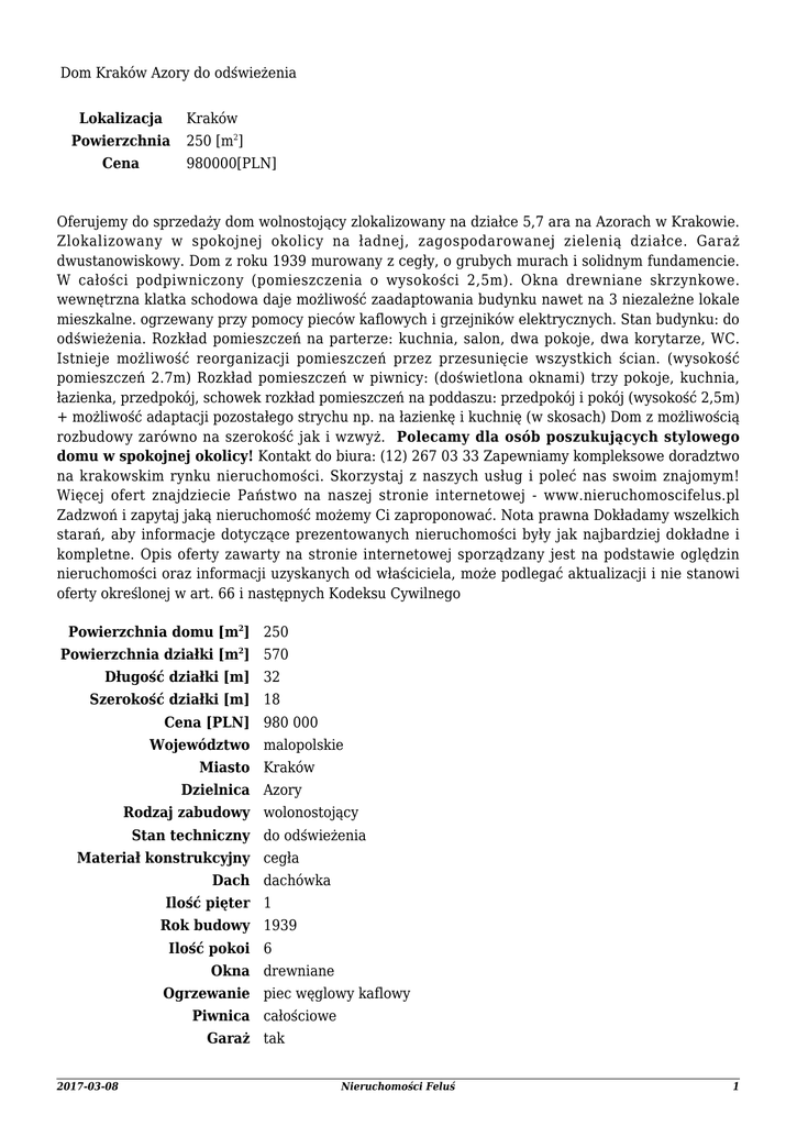 Dom Kraków Azory do odświeżenia Lokalizacja Kraków Powierzchnia 250 [m2] Cena 980000[PLN] Oferujemy do sprzedaży dom wolnostojący zlokalizowany na działce 5,7 ara na Azorach w Krakowie. Zlokalizowany w spokojnej okolicy na ładnej, zagospodarowanej zielenią działce. Garaż dwustanowiskowy. Dom z roku 1939 murowany z cegły, o grubych murach i solidnym fundamencie. W całości podpiwniczony (pomieszczenia o wysokości 2,5m). Okna drewniane skrzynkowe. wewnętrzna klatka schodowa daje możliwość zaadaptowania budynku nawet na 3 niezależne lokale mieszkalne. ogrzewany przy pomocy pieców kaflowych i grzejników elektrycznych. Stan budynku: do odświeżenia. Rozkład pomieszczeń na parterze: kuchnia, salon, dwa pokoje, dwa korytarze, WC. Istnieje możliwość reorganizacji pomieszczeń przez przesunięcie wszystkich ścian. (wysokość pomieszczeń 2.7m) Rozkład pomieszczeń w piwnicy: (doświetlona oknami) trzy pokoje, kuchnia, łazienka, przedpokój, schowek rozkład pomieszczeń na poddaszu: przedpokój i pokój (wysokość 2,5m) + możliwość adaptacji pozostałego strychu np. na łazienkę i kuchnię (w skosach) Dom z możliwością rozbudowy zarówno na szerokość jak i wzwyż. Polecamy dla osób poszukujących stylowego domu w spokojnej okolicy! Kontakt do biura: (12) 267 03 33 Zapewniamy kompleksowe doradztwo na krakowskim rynku nieruchomości. Skorzystaj z naszych usług i poleć nas swoim znajomym! Więcej ofert znajdziecie Państwo na naszej stronie internetowej - www.nieruchomoscifelus.pl Zadzwoń i zapytaj jaką nieruchomość możemy Ci zaproponować. Nota prawna Dokładamy wszelkich starań, aby informacje dotyczące prezentowanych nieruchomości były jak najbardziej dokładne i kompletne. Opis oferty zawarty na stronie internetowej sporządzany jest na podstawie oględzin nieruchomości oraz informacji uzyskanych od właściciela, może podlegać aktualizacji i nie stanowi oferty określonej w art. 66 i następnych Kodeksu Cywilnego Powierzchnia domu [m2] 250 Powierzchnia działki [m2] 570 Długość działki [m] 32 Szerokość działki [m] 18 Cena [PLN] 980 000 Województwo malopolskie Miasto Kraków Dzielnica Azory Rodzaj zabudowy wolonostojący Stan techniczny do odświeżenia Materiał konstrukcyjny cegła Dach dachówka Ilość pięter 1 Rok budowy 1939 Ilość pokoi 6 Okna drewniane Ogrzewanie piec węglowy kaflowy Piwnica całościowe Garaż tak 2017-03-08 Nieruchomości Feluś 1 Zieleń zagospodarowany ogród Zobacz wszystkie oferty z działu: Domy Kraków 2017-03-08 Nieruchomości Feluś 2