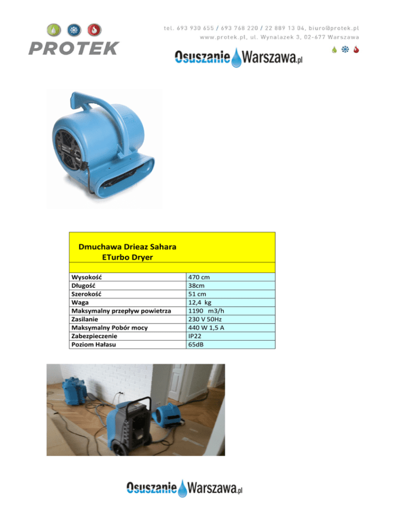 Dmuchawa Drieaz Sahara ETurbo Dryer Wysokość Długość Szerokość Waga Maksymalny przepływ powietrza Zasilanie Maksymalny Pobór mocy Zabezpieczenie Poziom Hałasu 470 cm 38cm 51 cm 12,4 kg 1190 m3/h 230 V 50Hz 440 W 1,5 A IP22 65dB