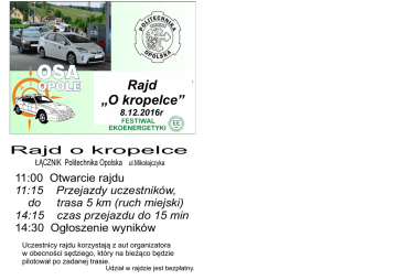 Rajd „O kropelce” 8.12.2016r o kropelce Rajd Otwarcie 12:00:00 (czwartek) 2014-10-09 CW-K przejazdy 12:30:00 Trasa … czas Ogłoszenie 16:45:00 16:30:00 przejazdu 10 Opole rajdu km uczestników wyników (ruch ok. 10min miejski) Rajd o kropelce ŁĄCZNIK Politechnika Opolska ul.Mikołajczyka 11:00 Otwarcie rajdu 11:15 Przejazdy uczestników, do trasa 5 km (ruch miejski) 14:15 czas przejazdu do 15 min 14:30 Ogłoszenie wyników Uczestnicy rajdu korzystają z aut organizatora w obecności sędziego, który na bieżąco będzie pilotował po zadanej trasie. Udział w rajdzie jest bezpłatny.