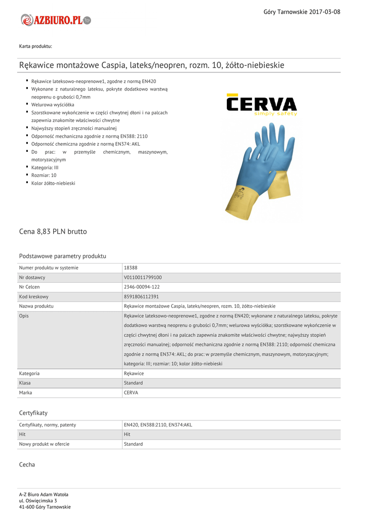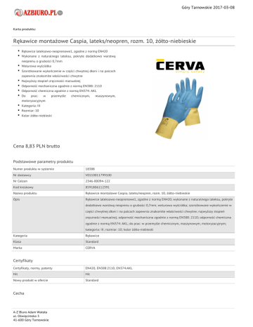 Góry Tarnowskie 2017-03-08 Karta produktu: Rękawice montażowe Caspia, lateks/neopren, rozm. 10, żółto-niebieskie Rękawice lateksowo-neoprenowe1, zgodne z normą EN420 Wykonane z naturalnego lateksu, pokryte dodatkowo warstwą neoprenu o grubości 0,7mm Welurowa wyściółka Szorstkowane wykończenie w części chwytnej dłoni i na palcach zapewnia znakomite właściwości chwytne Najwyższy stopień zręczności manualnej Odporność mechaniczna zgodnie z normą EN388: 2110 Odporność chemiczna zgodnie z normą EN374: AKL Do prac: w przemyśle chemicznym, maszynowym, motoryzacyjnym Kategoria: III Rozmiar: 10 Kolor żółto-niebieski Cena 8,83 PLN brutto Podstawowe parametry produktu Numer produktu w systemie 18388 Nr dostawcy V0110011799100 Nr Celcen 2346-00094-122 Kod kreskowy 8591806112391 Nazwa produktu Rękawice montażowe Caspia, lateks/neopren, rozm. 10, żółto-niebieskie Opis Rękawice lateksowo-neoprenowe1, zgodne z normą EN420; wykonane z naturalnego lateksu, pokryte dodatkowo warstwą neoprenu o grubości 0,7mm; welurowa wyściółka; szorstkowane wykończenie w części chwytnej dłoni i na palcach zapewnia znakomite właściwości chwytne; najwyższy stopień zręczności manualnej; odporność mechaniczna zgodnie z normą EN388: 2110; odporność chemiczna zgodnie z normą EN374: AKL; do prac: w przemyśle chemicznym, maszynowym, motoryzacyjnym; kategoria: III; rozmiar: 10; kolor żółto-niebieski Kategoria Rękawice Klasa Standard Marka CERVA Certyfikaty Certyfikaty, normy, patenty EN420, EN388:2110, EN374:AKL Hit Hit Nowy produkt w ofercie Standard Cecha A-Z Biuro Adam Watoła ul. Oświęcimska 3 41-600 Góry Tarnowskie Góry Tarnowskie 2017-03-08 Karta katalogowa produktu cd. Rękawice montażowe Caspia, lateks/neopren, rozm. 10, żółto-niebieskie W ofercie od 2013-08 Materiał Lateks/neopren Typ Montażowe Produkt Rękawice Rodzaj Standard Kolor Kolor Żółty/niebieski Wspólny słownik zamówień CPV 18141000-9 Wymiary Rozmiar Pozostałe zdjęcia produktu Serdecznie zapraszamy do współpracy A-Z Biuro Adam Watoła zespół. A-Z Biuro Adam Watoła ul. Oświęcimska 3 41-600 Góry Tarnowskie 10