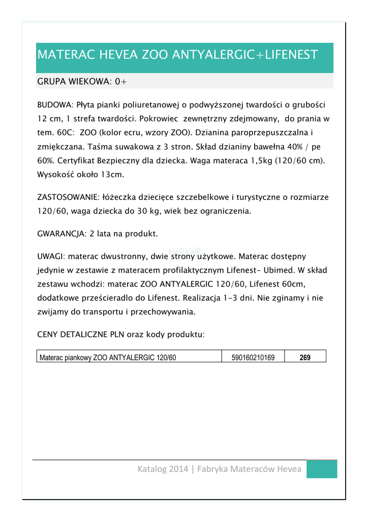 MATERAC HEVEA ZOO ANTYALERGIC+LIFENEST GRUPA WIEKOWA: 0+ BUDOWA: Płyta pianki poliuretanowej o podwyższonej twardości o grubości 12 cm, 1 strefa twardości. Pokrowiec zewnętrzny zdejmowany, do prania w tem. 60C: ZOO (kolor ecru, wzory ZOO). Dzianina paroprzepuszczalna i zmiękczana. Taśma suwakowa z 3 stron. Skład dzianiny bawełna 40% / pe 60%. Certyfikat Bezpieczny dla dziecka. Waga materaca 1,5kg (120/60 cm). Wysokość około 13cm. ZASTOSOWANIE: łóżeczka dziecięce szczebelkowe i turystyczne o rozmiarze 120/60, waga dziecka do 30 kg, wiek bez ograniczenia. GWARANCJA: 2 lata na produkt. UWAGI: materac dwustronny, dwie strony użytkowe. Materac dostępny jedynie w zestawie z materacem profilaktycznym Lifenest- Ubimed. W skład zestawu wchodzi: materac ZOO ANTYALERGIC 120/60, Lifenest 60cm, dodatkowe prześcieradlo do Lifenest. Realizacja 1-3 dni. Nie zginamy i nie zwijamy do transportu i przechowywania. CENY DETALICZNE PLN oraz kody produktu: Materac piankowy ZOO ANTYALERGIC 120/60 590160210169 269 Katalog 2014 | Fabryka Materaców Hevea Katalog 2014 | Fabryka Materaców Hevea
