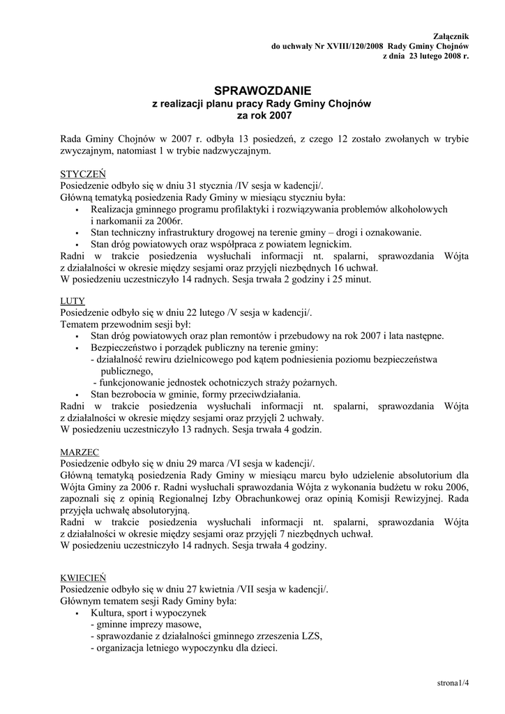 Załącznik do uchwały Nr XVIII/120/2008 Rady Gminy Chojnów z dnia 23 lutego 2008 r. SPRAWOZDANIE z realizacji planu pracy Rady Gminy Chojnów za rok 2007 Rada Gminy Chojnów w 2007 r. odbyła 13 posiedzeń, z czego 12 zostało zwołanych w trybie zwyczajnym, natomiast 1 w trybie nadzwyczajnym. STYCZEŃ Posiedzenie odbyło się w dniu 31 stycznia /IV sesja w kadencji/. Główną tematyką posiedzenia Rady Gminy w miesiącu styczniu była: Realizacja gminnego programu profilaktyki i rozwiązywania problemów alkoholowych i narkomanii za 2006r. Stan techniczny infrastruktury drogowej na terenie gminy – drogi i oznakowanie. Stan dróg powiatowych oraz współpraca z powiatem legnickim. Radni w trakcie posiedzenia wysłuchali informacji nt. spalarni, sprawozdania Wójta z działalności w okresie między sesjami oraz przyjęli niezbędnych 16 uchwał. W posiedzeniu uczestniczyło 14 radnych. Sesja trwała 2 godziny i 25 minut. LUTY Posiedzenie odbyło się w dniu 22 lutego /V sesja w kadencji/. Tematem przewodnim sesji był: Stan dróg powiatowych oraz plan remontów i przebudowy na rok 2007 i lata następne. Bezpieczeństwo i porządek publiczny na terenie gminy: - działalność rewiru dzielnicowego pod kątem podniesienia poziomu bezpieczeństwa publicznego, - funkcjonowanie jednostek ochotniczych straży pożarnych. Stan bezrobocia w gminie, formy przeciwdziałania. Radni w trakcie posiedzenia wysłuchali informacji nt. spalarni, sprawozdania Wójta z działalności w okresie między sesjami oraz przyjęli 2 uchwały. W posiedzeniu uczestniczyło 13 radnych. Sesja trwała 4 godzin. MARZEC Posiedzenie odbyło się w dniu 29 marca /VI sesja w kadencji/. Główną tematyką posiedzenia Rady Gminy w miesiącu marcu było udzielenie absolutorium dla Wójta Gminy za 2006 r. Radni wysłuchali sprawozdania Wójta z wykonania budżetu w roku 2006, zapoznali się z opinią Regionalnej Izby Obrachunkowej oraz opinią Komisji Rewizyjnej. Rada przyjęła uchwałę absolutoryjną. Radni w trakcie posiedzenia wysłuchali informacji nt. spalarni, sprawozdania Wójta z działalności w okresie między sesjami oraz przyjęli 7 niezbędnych uchwał. W posiedzeniu uczestniczyło 14 radnych. Sesja trwała 4 godziny. KWIECIEŃ Posiedzenie odbyło się w dniu 27 kwietnia /VII sesja w kadencji/. Głównym tematem sesji Rady Gminy była: Kultura, sport i wypoczynek - gminne imprezy masowe, - sprawozdanie z działalności gminnego zrzeszenia LZS, - organizacja letniego wypoczynku dla dzieci. strona1/4 Radni w trakcie posiedzenia uczcili minutą ciszy śmierć byłej wójt Gminy Chojnów Janiny Płomińskiej, wysłuchali informacji nt. spalarni, sprawozdania Wójta z działalności w okresie między sesjami oraz przyjęli 1 uchwałę. W posiedzeniu uczestniczyło 15 radnych. Sesja trwała 2 godziny i 30 minut. MAJ Posiedzenie odbyło się w dniu 24 maja / VIII sesja w kadencji/. Tematem przewodnim sesji Rady Gminy w miesiącu maju była: Informacja wójta gminy o podejmowanych i realizowanych inicjatywach gospodarczych na terenie gminy. Analiza wykonania budżetu za I kwartał 2007 roku. Radni w trakcie posiedzenia wysłuchali informacji nt. spalarni, sprawozdania Wójta z działalności w okresie między sesjami oraz przyjęli 10 niezbędnych uchwał. W posiedzeniu uczestniczyło 15 radnych. Sesja trwała 3 godziny i 10 minut. CZERWIEC Posiedzenie odbyło się w dniu 26 czerwca /IX sesja w kadencji/. Tematem wiodącym sesji była debata na temat rolnictwa: funkcjonowanie rolnictwa na terenie gminy w świetle pozyskiwania środków unijnych na lata 2007-2013, akcja żniwna. Radni w trakcie posiedzenia wysłuchali informacji nt. spalarni, sprawozdania Wójta z działalności w okresie między sesjami oraz przyjęli 5 uchwał. W posiedzeniu uczestniczyło 14 radnych. Sesja trwała 2 godziny i 30 minut. LIPIEC Posiedzenie zostało zwołane w dniu 12 lipca /X sesja w kadencji/ w trybie pilnym na wniosek wójta na podstawie art. 20, ust.3 ustawy o samorządzie gminnym. Tematem sesji było przyjęcie uchwał: a) w sprawie emisji obligacji komunalnych, b) w sprawie zaciągnięcia pożyczki w Wojewódzkim Funduszu Ochrony Środowiska i Gospodarki Wodnej we Wrocławiu. Radni przyjęli 2 uchwały. W posiedzeniu uczestniczyło 14 radnych. Sesja trwała 55 minut. SIERPIEŃ Posiedzenie odbyło się w dniu 31 sierpnia /XI sesja w kadencji/. Kierownicy gminnych jednostek /Gminny Ośrodek Pomocy Społecznej, Gospodarstwo Pomocnicze Urzędu Gminy, Gminna Biblioteka Publiczna i Gminny Zakład Gospodarki Komunalnej i Mieszkaniowej / przedstawili Radzie sprawozdanie z działalności w minionym roku. Radni w trakcie posiedzenia wysłuchali informacji nt. spalarni, sprawozdania Wójta z działalności w okresie między sesjami oraz przyjęli 5 niezbędnych uchwał. W posiedzeniu uczestniczyło 15 radnych. Sesja trwała 3 godziny i 20 minut. WRZESIEŃ Posiedzenie odbyło się w dniu 25 września /XII sesja w kadencji/. Tematem przewodnim sesji był wybór: ławników do Sądu Okręgowego w Legnicy i Sądu Rejonowego w Złotoryi w kadencji 2008 – 2011. Radni zapoznali się również z: założeniami do projektu budżetu na 2008 rok, informacją o realizacji uchwały w sprawie utrzymania porządku i czystości w gminie, wykonaniem budżetu za I półrocze 2007 roku. W trakcie posiedzenia wysłuchano informacji nt. spalarni, sprawozdania Wójta z działalności w okresie między sesjami oraz przyjęli 4 uchwały. W posiedzeniu uczestniczyło 14 radnych. Sesja trwała 3 godziny i 10 minut. strona2/4 PAŹDZIERNIK Posiedzenie odbyło się w dniu 30 października /XIII sesja w kadencji/. Tematem głównym posiedzenia była informacja dyrektorów szkół na temat funkcjonowania placówek oświatowych na terenie gminy. Zapoznano Radnych z analizą oświadczeń majątkowych. Radni w trakcie posiedzenia wysłuchali informacji nt. spalarni, sprawozdania Wójta z działalności w okresie między sesjami oraz przyjęli 5 niezbędnych uchwał. W