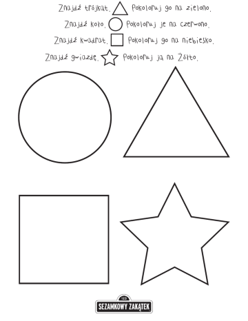 Znajdź trójkąt. Znajdź koło. Znajdź kwadrat. Znajdź gwiazdę. Pokoloruj go na zielono. Pokoloruj je na czerwono. Pokoloruj go na niebiesko. Pokoloruj ją na żółto.