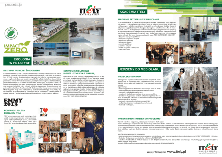 prezentacje AKADEMIA ITELY SZKOLENIA FRYZJERSKIE W MEDIOLANIE ITELY HAIR FASHION ACADEMY to wysokiej klasy ośrodek szkoleniowy, który popularyzuje wiedzę z zakresu fryzjerstwa poprzez kursy na najwyższym poziomie technicznym i stylistycznym z udziałem specjalistów fryzjerskich na całym świecie. Siedziba Akademii Itely, mieści się pod adresem Via Resegone 26, Legnano koło Mediolanu. Na 20 stanowiskach, które są do dyspozycji w centrum szkoleniowym, przygotowywane są fryzury do sesji fotograficznych, pokazów a także przedstawień teatralnych. Odpowiadając na specyficzne zapotrzebowanie firma Itely stara się być partnerem, na którym zawsze można polegać. Oto kursy oferowane aktualnie przez ITELY HAIR FASHION ACADEMY: - strzyżenie kreatywne podstawy - kreatywne strzyżenie - ekspert - koloryzacja podstawy - koloryzacja ekspert - pasemka podstawy - pasemka - ekspert - modne strzyżenie i koloryzacja - magiczne fryzury EKOLOGIA W PRAKTYCE ITELY HAIR FASHION I ŚRODOWISKO ITELY HAIRFASHION (G.V.F. S.p.a.) to włoska firma z siedzibą w Mediolanie. Od 1987r produkuje kosmetyki profesjonalne dla salonów fryzjerskich, a od 1993r po przejęciu fimy REVIVRE również do salonów kosmetycznych. Od kilku lat oferta została poszerzona o suplementy diety oraz parafarmaceutyki. Nie tylko jednak oferta stanowi istotę przemian w firmie. W trosce o najwyższę jakość produktów wprowadzono standardy jakościowe normy 9001 i unowocześniono bazę produkcyjną. Ekipa ITELY uważa, że najważniejszą zmianą jest nowa proekologiczna filozofia działania firmy. Wycofano więc surowce i składniki, które mimo iż oficjalnie dopuszczone do obrotu mogą być potencjalnie szkoldliwe dla człowieka lub dla środowiska. Zrezygnowano z substancji które mają zbyt długi okres biodegradacji. Zastosowano zamknięty obieg wody, aby nie dopuścić do przedostania się zanieczyszczeń do środowiska. Zadbano nawet o własne zasilanie z ogniw fotowoltaicznych i zmniejszone zużycie papieru w biurze. EMMY 2013 CENTRUM SZKOLENIOWE BIOLIFE - SYNERGIA Z NATURĄ Utworzenie w 2013r centrum szkoleniowego BIOLIFE to wynik nowej proekologicznej filozofii firmy. Specjalną uwagę przywiązuje się tutaj do kuracji kosmetycznych, stosowaniu suplementów diety i osiąganiu stanu dobrego samopoczucia i zdrowia działając w synergii ze środowiskiem. Oprócz sal do nauki tradycyjnych zabiegów kosmetycznych i SPA znajdziemy tu również na przykład gabinet szkoleniowy do zabiegów uzdrawiania za pomocę światła. Centrum BIOLIFE ożywia się tylko podczas szkoleń, głownie dla kosmetyczek. Odbywają się tu również niekiedy kursy teoretyczne dla fryzjerów. Część praktyczna jednak odbywa się jednak w centrum szkoleniowym ITELY HAIR FASION ACADEMY. JEDZIEMY DO MEDIOLANU WYCIECZKA 4-DNIOWA Dla kogo? Dla stylistów i właścicieli salonów fryzjerskich posługujących się w codziennej pracy kosmetykami ITELY, ale także dla tych, którzy pokochali markę ITELY i z przyjemnością do niej wracają. Zapewniamy: • wspaniałą podróż do Mediolanu - światowego centrum mody • zakwaterowanie w 3-gwiazdkowym hotelu (3 noce), • spotkanie z włoską kulturą i sztuką, • zwiedzanie Mediolanu z profesjonalnym przewodnikiem, • zwiedzanie fryzjerskiego centrum szkoleniowego Itely Hair Fashion Academy lub zakładów ITELY i centrum szkoleniowego SPA Biolife (zależnie od terminu) • spotkanie z personelem i szkoleniowcami ITELY • znakomitą atmosferę i dużo pozytywnych emocji, • materiały edukacyjne, HOLYWOOD POLECA PRODUKTY ITELY ITELY aktywnie promuje swoje produkty w Holywood, między innymi poprzez umowy na dostawy do produkcji filmowych np. w „Sex w wilkim mieście II”. Na rozdaniu nagród EMMY 2013 firma IYELY uzyskała rekomendację uczestników. WARUNKI PRZYSTĄPIENIA DO PROGRAMU Warunki udziału w programie „Jedziemy do mediolanu” dla 1 osoby: Opłata rezerwacyjna w wysokości 500 zł oraz zakup produktów ITELY o wartości 10.000 zł brutto w aktualnej ofercie w termnie 180 dni od daty przystąpienia do programu bez rabatów ale z zachowaniem obowiązujących promocji lub: opłata rezerwacyjna w wysokości 1000 zł oraz zakup produktów ITELY o wartości 6.000 zł brutto bez rabatów ale z zachowaniem obowiązujących promocji w terminie 180 dni od daty przystąpienia do programu. Koszt udziału w wycieczce dodatkowej osoby nieobjętej programem: 1600zł brutto. Opłata rezerwacyjna płatna dopiero po zakwalifikowaniu się na wyjazd. SPOSÓB PRZYSTĄPIENIA DO PROGRAMU: - Podpisanie deklaracji przystąpienia do programu potwierdzonej przez regionalnego dystrybutora dystrybutora marki ITELY HAIRFASHION (lista dystrybutorów dostępna na www.itely.pl w zakładce „ZAMÓWIENIA”) - przesłanie na adres F.H.U. TRIO ul. Targowa 66 lok. 20 potwierdzonych przez dystrybutora faktur zakupu dokumentujących wysokość zakupów w okresie objętym programem. Szcegóły progrmu wyjazdowego u dystrybutorów regionalnych ITELY HAIR FASHION Więcej informacji na: www.itely.pl