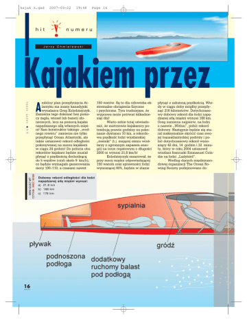 kajak k.qxd hit 2007-03-22 19:48 Page 16 numeru Jerzy Chmielewski Kajakiem przez mbitny plan przepłynięcia Atlantyku ma znany kanadyjski wynalazca Greg Kolodziejczyk. Zamierza tego dokonać bez pomocy żagla, wioseł lub baterii słonecznych, lecz za pomocą kajaka napędzanego siłą własnych mięśni! Sam konstruktor takiego „wodnego roweru” zamierza nie tylko przepłynąć Ocean Atlantycki, ale także ustanowić rekord odległości pokonywanej na morzu kajakiem w ciągu 24 godzin! Do pobicia obu rekordów kajakarz będzie musiał płynąć z prędkością dochodzącą do 5 węzłów (czyli około 9 km/h), co będzie wymagało generowania mocy 100–110, a czasami nawet TEKST A £ATWY MINI QUIZ MT CZYTAM, WIĘC WIEM 16 Dobowy rekord odległości dla łodzi napędzanej siłą mięśni wynosi: a) 21,8 km b) 168 km c) 176 km 150 watów. Są to dla człowieka ekstremalne obciążenia fizyczne i psychiczne. Tym trudniejsze, że wyprawa może potrwać kilkadziesiąt dni! Warto sobie tutaj uświadomić, że mistrzowie kajakarscy potrzebują prawie godziny na pokonanie dystansu 10 km, a rekordowa prędkość łodzi wioślarskiej „ósemki” (t.j. mającej ośmiu wioślarzy z ogromnym zapasem energii) na torze regatowym o długości 2000 m wynosi 21,8 km/h! Kolodziejczyk oszacował, że przy mocy mięśni odpowiadającej 150 watom oraz sprawności łodzi wynoszącej 80%, będzie w stanie płynąć z założoną prędkością. Wtedy w ciągu doby mógłby przepłynąć 216 kilometrów. Dotychczasowy dobowy rekord dla łodzi napędzanej siłą mięśni wynosi 168 km. Greg zamierza najpierw, na łodzi o nazwie „Within”, pobić rekord dobowy. Następnie będzie się starał maksymalnie skrócić czas swojej transatlantyckiej podróży i pobić dotychczasowy rekord wynoszący 42 dni, 14 godzin i 32 minuty, który w roku 2004 ustanowił wioślarz francuski Emmanuel Coindre na łodzi „Ladybird”. Według danych międzynarodowej organizacji The Ocean Rowing Society podejmowano do- kajak k.qxd 2007-03-22 19:48 Page 17 Atlantyk tychczas 275 prób pokonania Atlantyku łodziami wiosłowymi, z tego sukcesem zakończyło się 176. Samotnych wioślarzy było 35, a 6 prób zakończyło się tragicznie. Łódź o nazwie „Within” wykonana z włókien szklanych i kevlaru będzie modyfikacją kajaka użyczonego przez specjalistyczną firmę Nimbus Kayaks. Bardzo smukła łódź, nieco dłuższa niż 7 metrów, będzie miała podwyższone burty i zaokrągloną odsuwaną, częściowo oszkloną kopułę nad siedzeniem. Z tyłu za siedzeniem przewidziano miejsce do spania. Z przodu znajdą się zapasy żywności i wody, radiotelefon i urządzenia nawigacji satelitarnej oraz akumulatory ładowane za pomocą baterii słonecznych. Jest tu też miejsce na odtwarzacz iPod i inne drobiazgi przydatne podczas tak długiego rejsu. Przewidziano oczywiście także niezbędne morskie urządzenia sygnalizacyjne i alarmowe. Bezpośrednio pod nogami Grega łódź będzie miała kil z balastem o masie 10 kg, który ma zapewnić stabilność i chronić przed wywróceniem. Dwułopatkowa śruba napędowa w dole kila uruchamiana będzie siłą jego mięśni. Wnętrza części dziobowej i rufowej łodzi mają być wypełnione lekką pianką, co powinno ją chronić przed zatonięciem. Greg Kolodziejczyk znany jest z tego, że uprawia z zapałem sporty ekstremalne. Latem 2006 roku na rowerze własnej konstrukcji, przypominającym kokon, przejechał w ciągu 24 godzin dystans 1047,7 km, ustanawiając tym samym nowy światowy rekord. Rejs Grega zacznie się na Wyspach Kanaryjskich i ma prowadzić do Barbados lub do innej wyspy w Indiach Zachodnich. Na razie nie jest znany konkretny termin startu, ale mówi się o roku 2008. Będziemy trzymać kciuki! 17