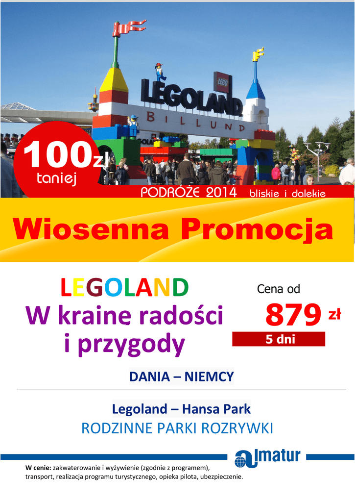 100zl Wiosenna Promocja LEGOLAND W krainę radości i przygody Cena od 879 zł 5 dni DANIA – NIEMCY Legoland – Hansa Park RODZINNE PARKI ROZRYWKI W cenie: zakwaterowanie i wyżywienie (zgodnie z programem), transport, realizacja programu turystycznego, opieka pilota, ubezpieczenie.